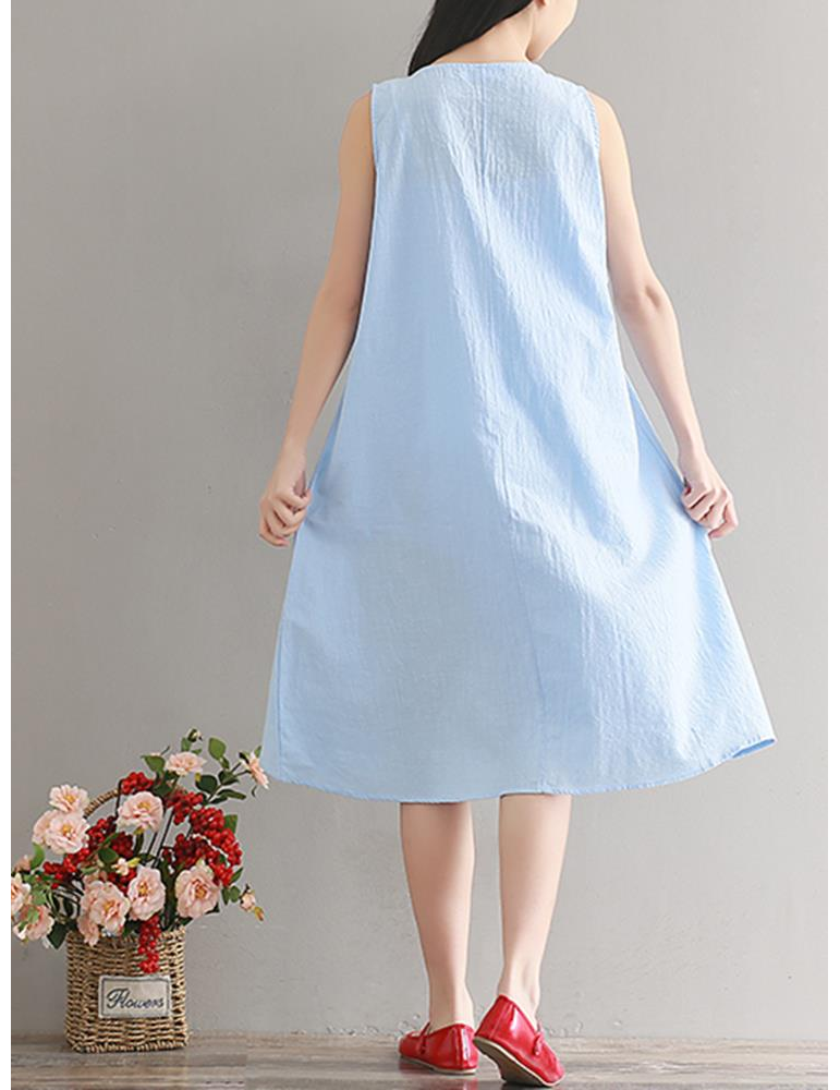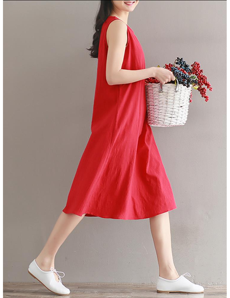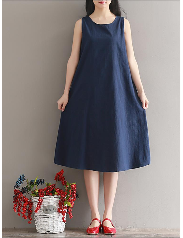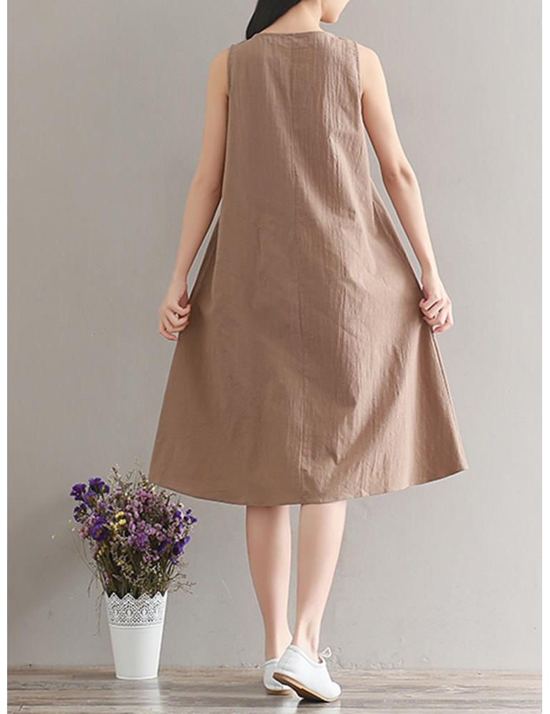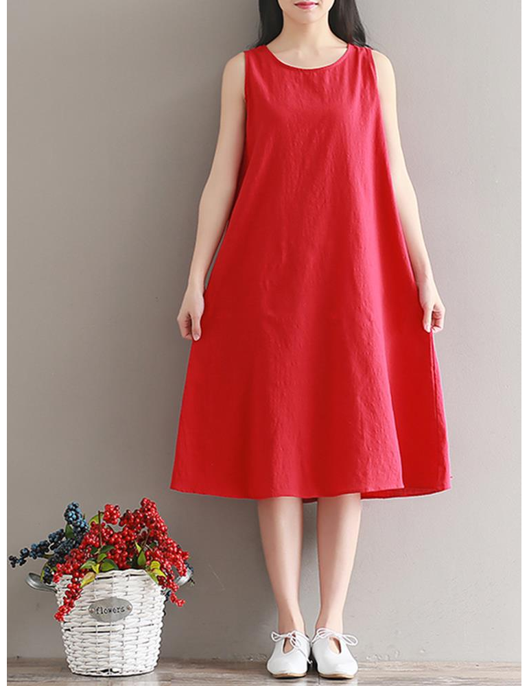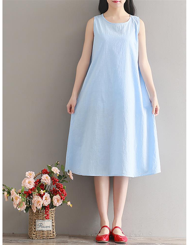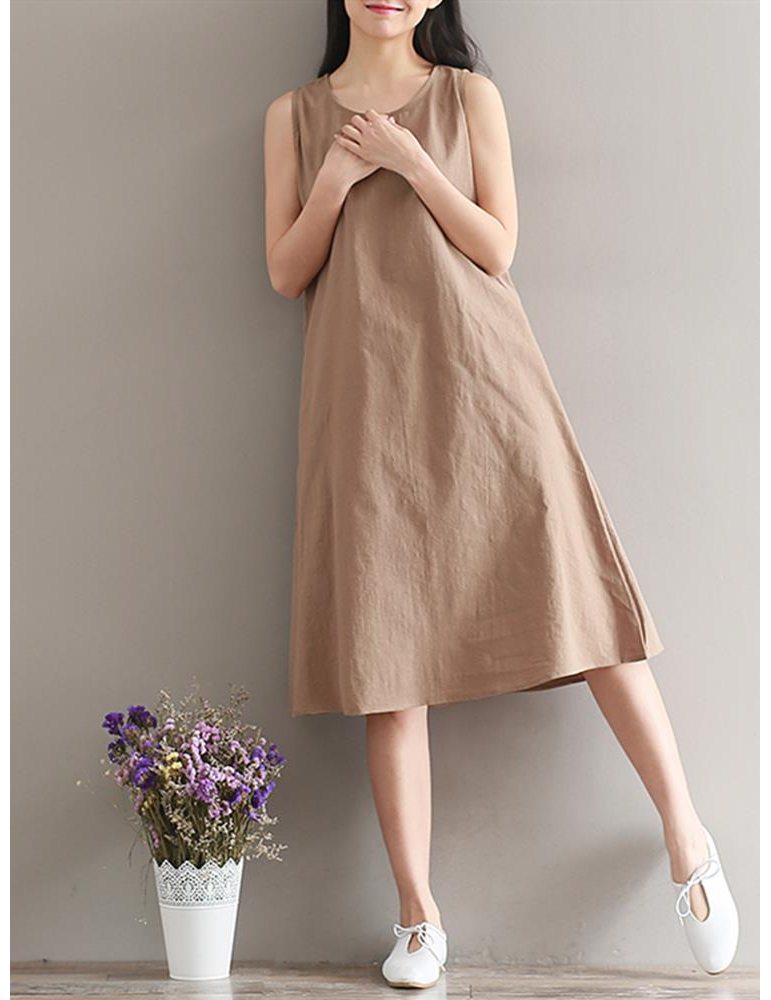 Women Vintage Sleeveless Pure Color Mid-Long Dresses