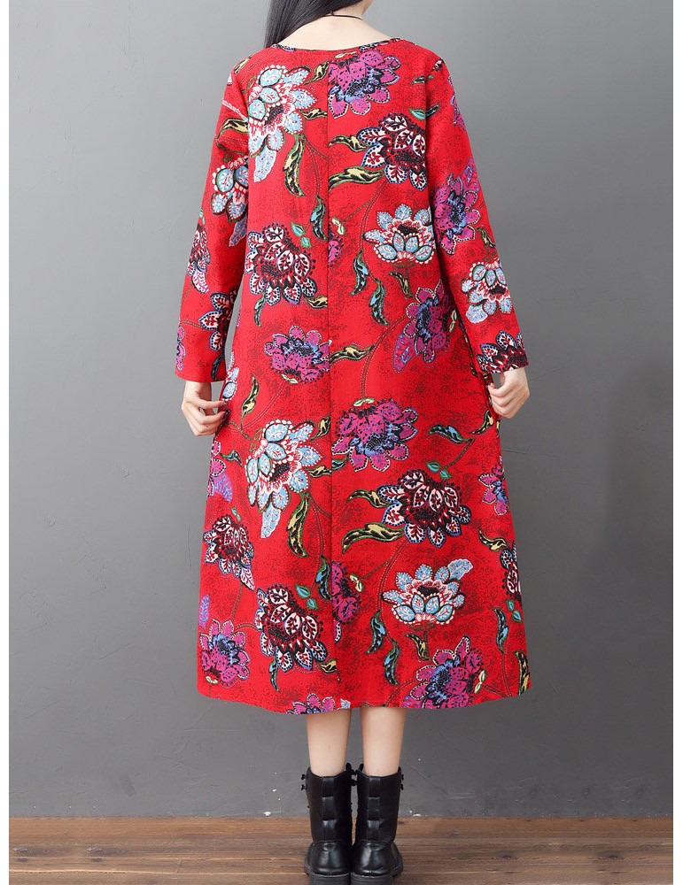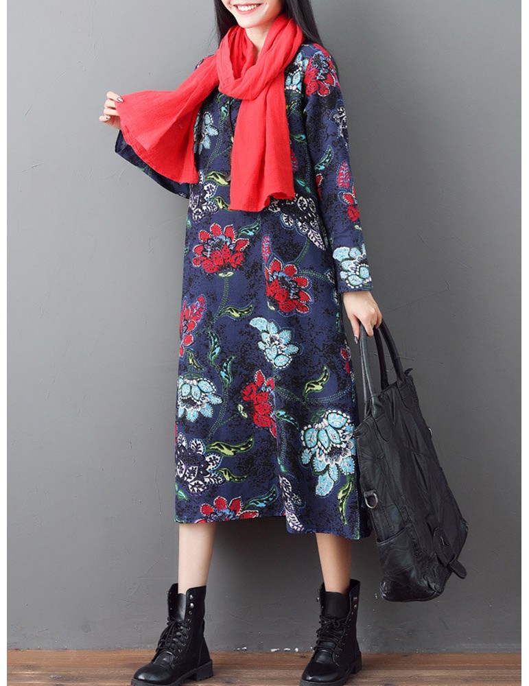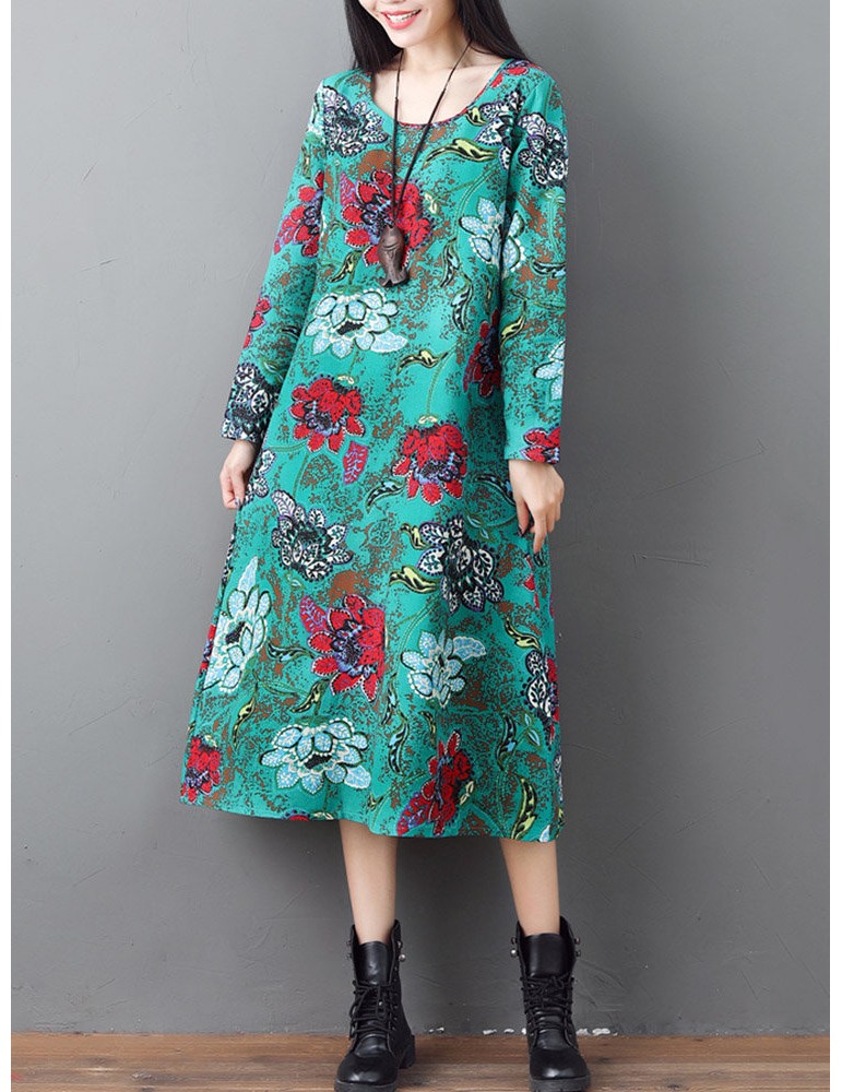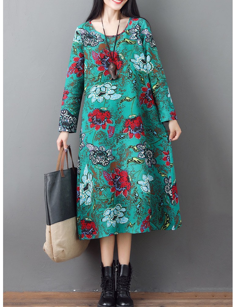 Loose O-neck Floral Print Long Sleeve Vintage Mid-long Dress
