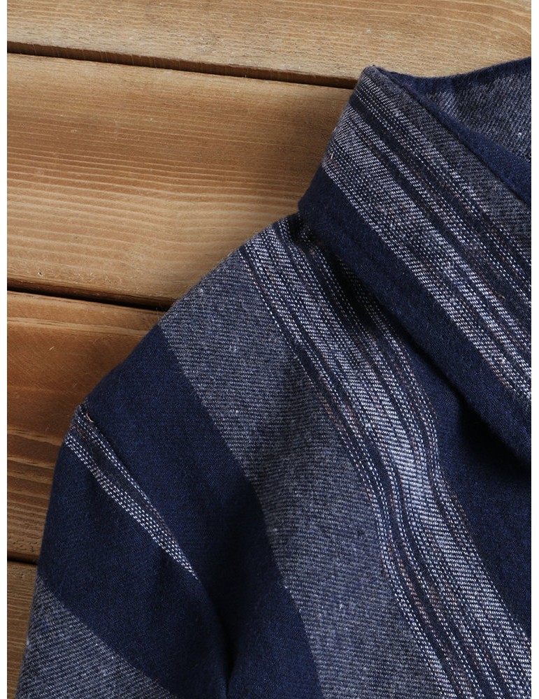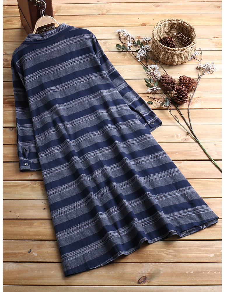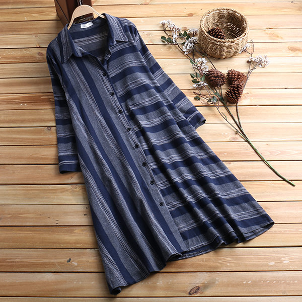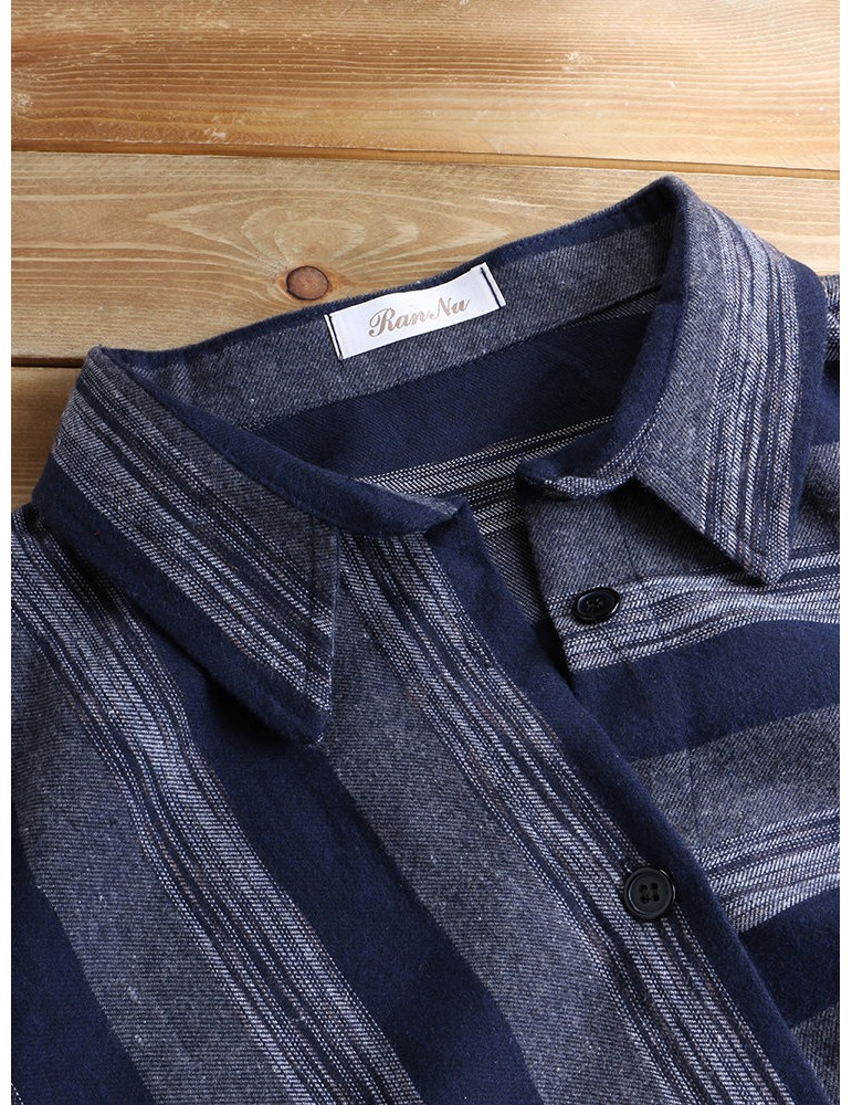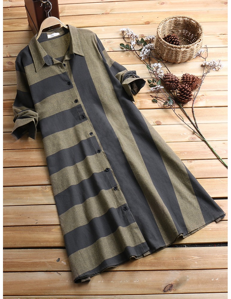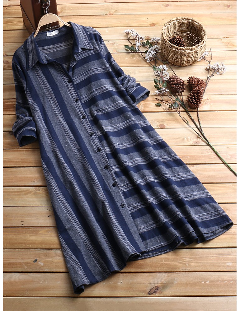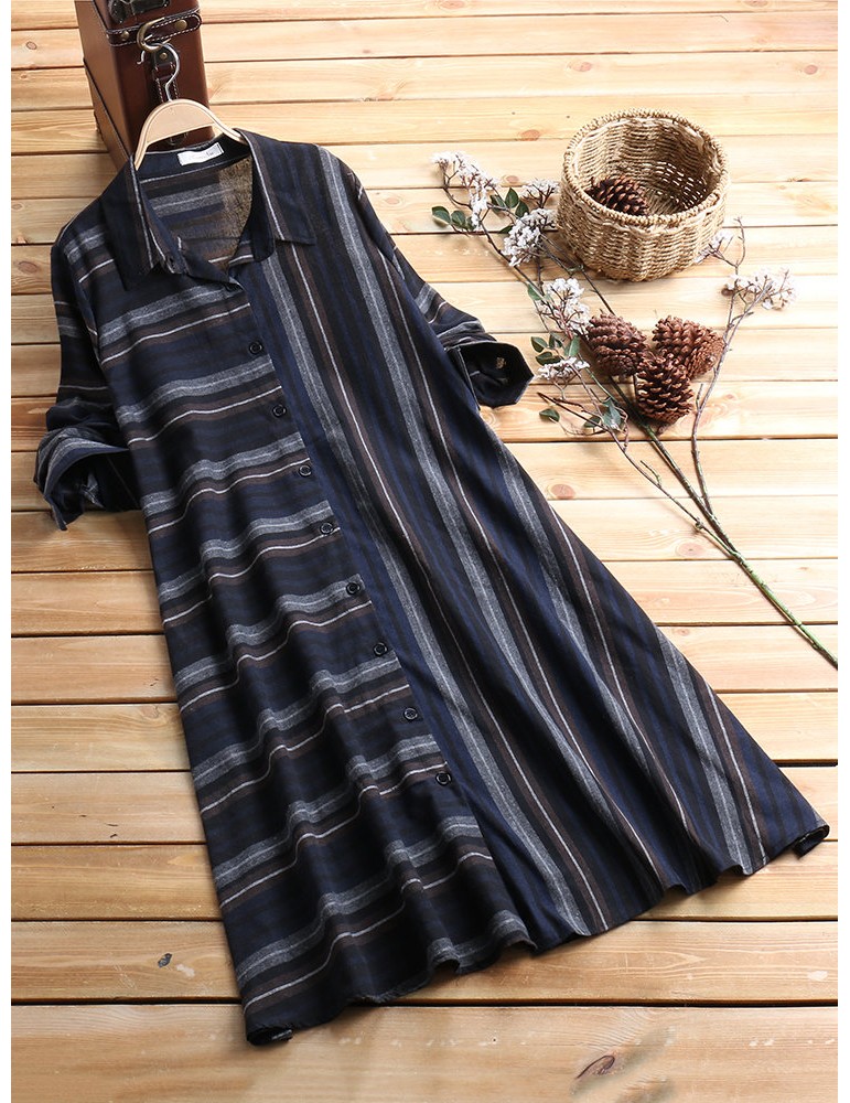 Patchwork Stripe Long Sleeve Lapel Vintage Shirt Dresses
