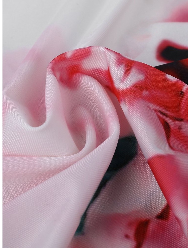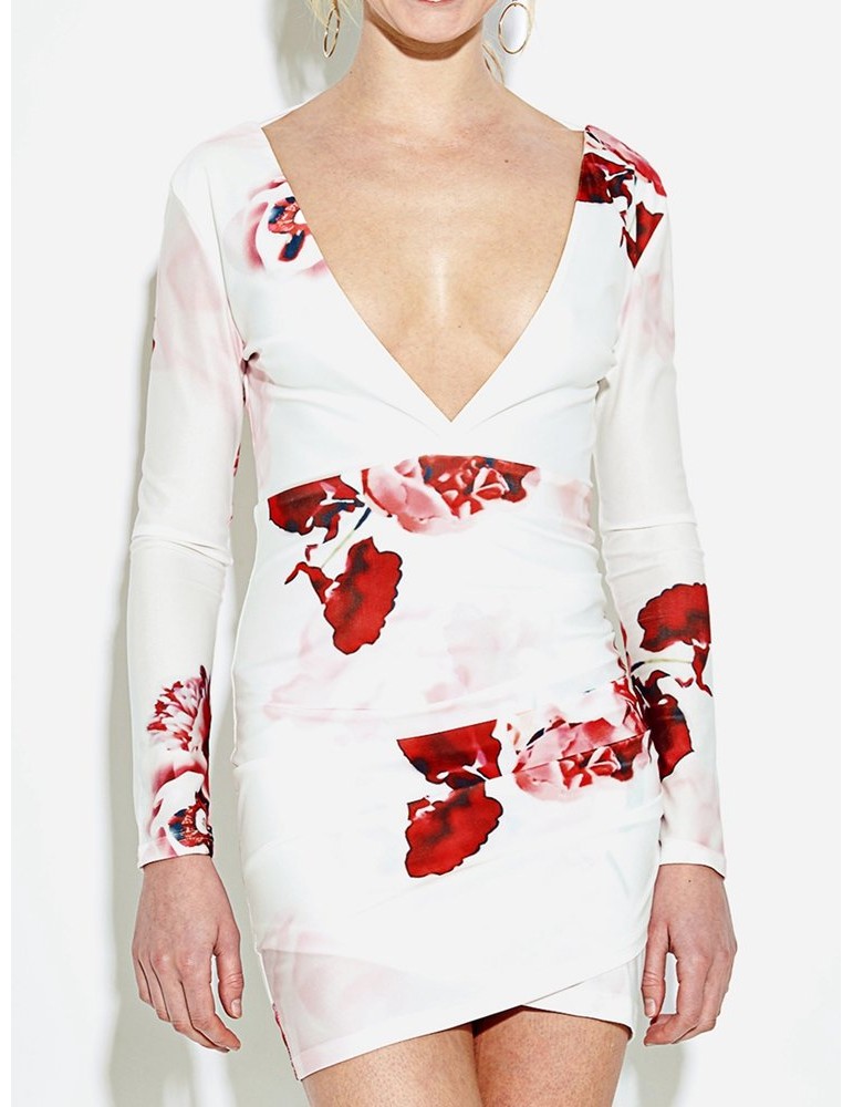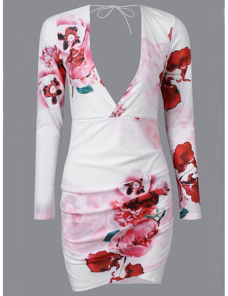 Ink Floral Print Backless V-neck Long Sleeve Women Mini Dress