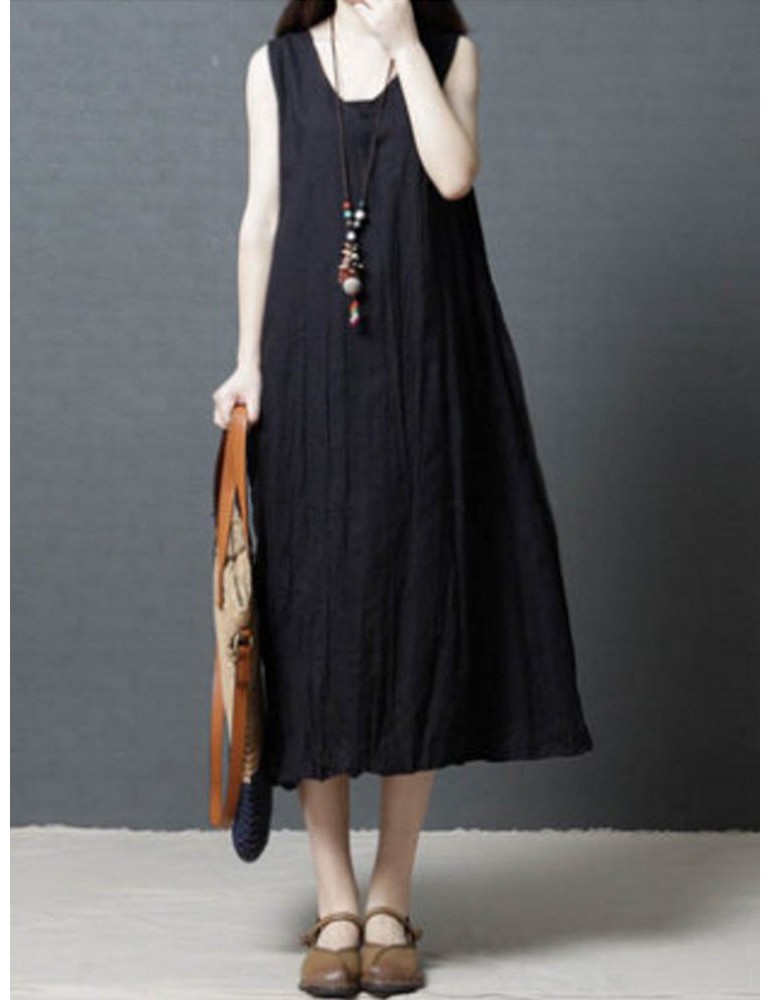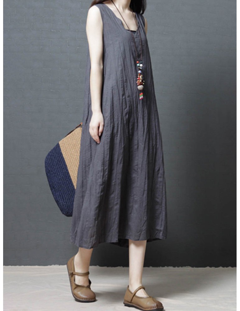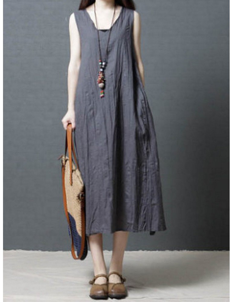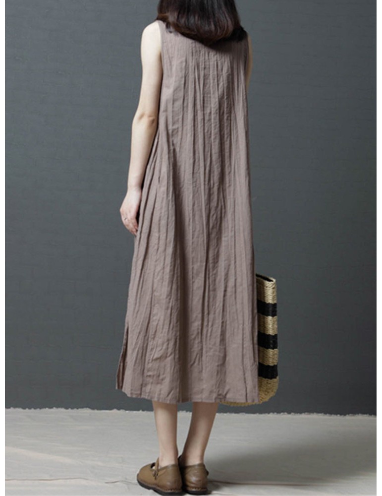 Loose Pockets Pure Color Pleated Sleeveless Vintage Dresses
