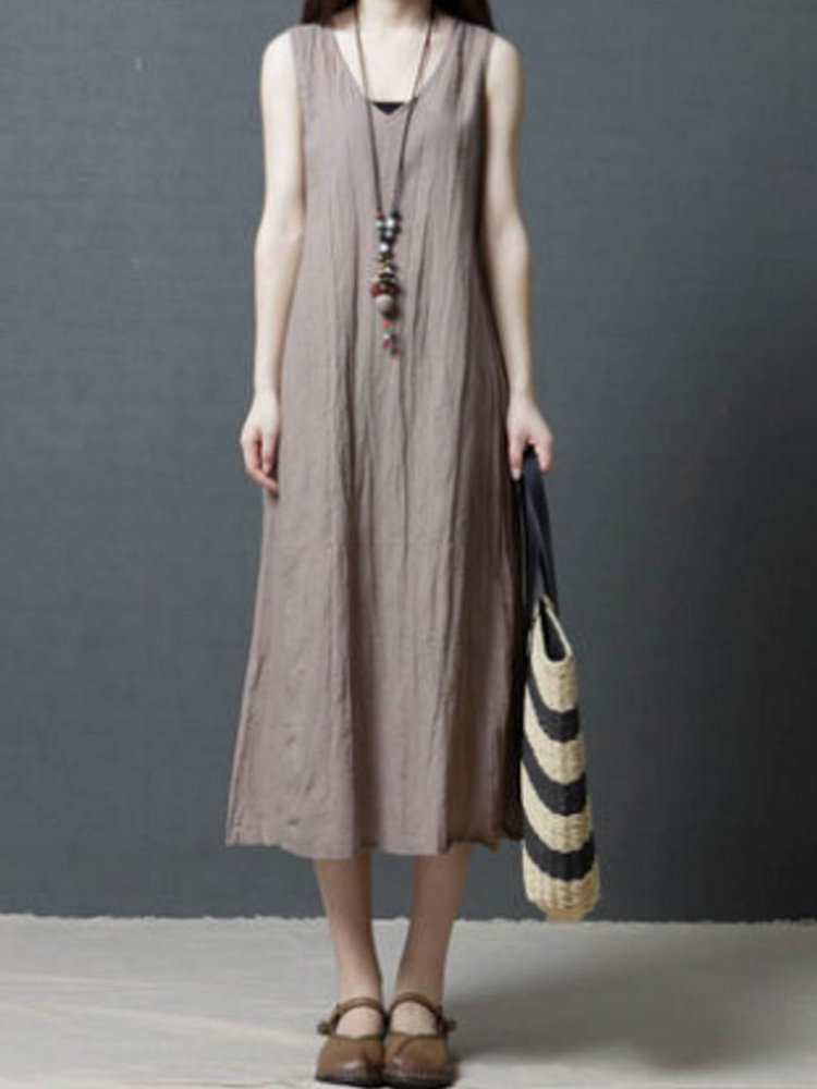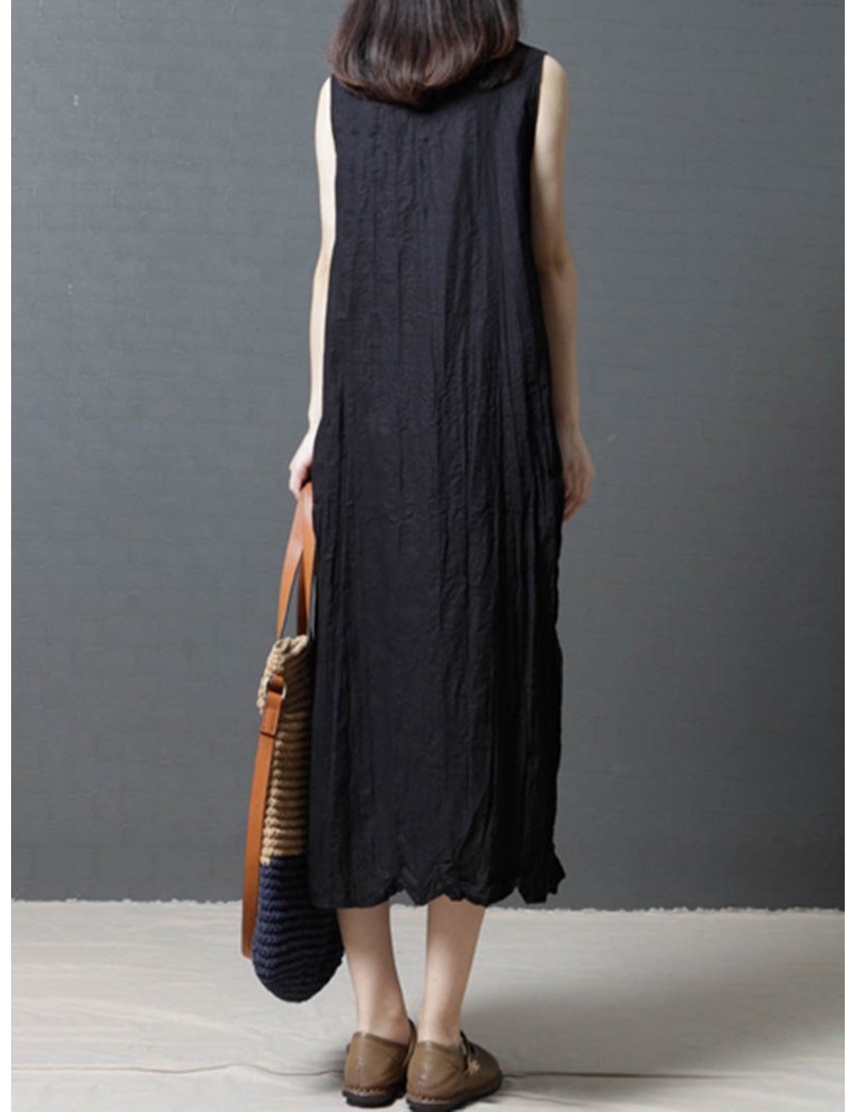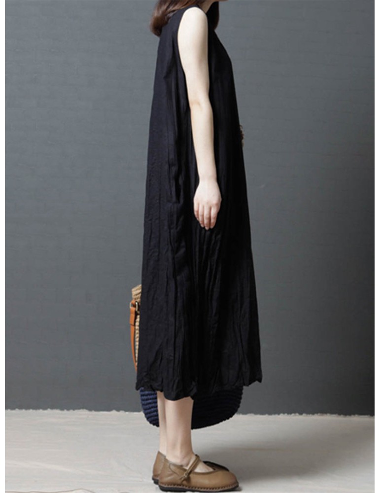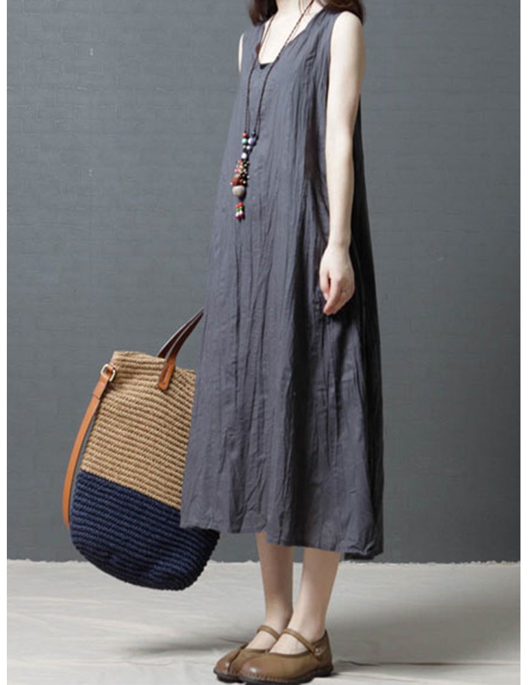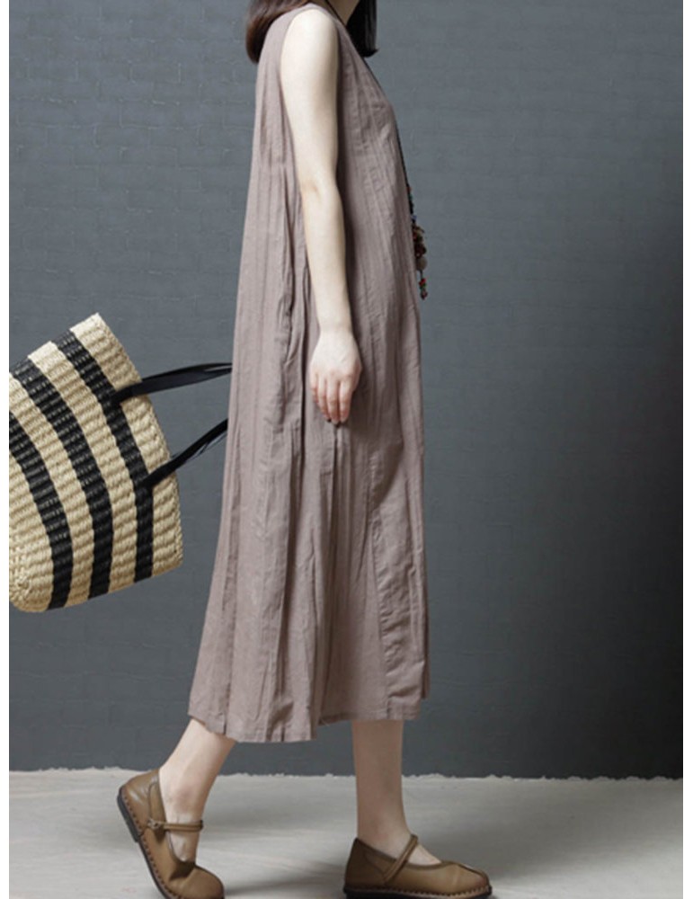 Loose Pockets Pure Color Pleated Sleeveless Vintage Dresses