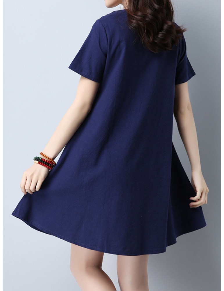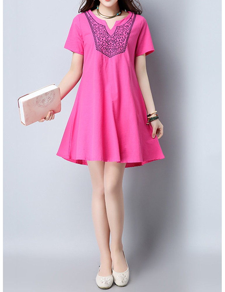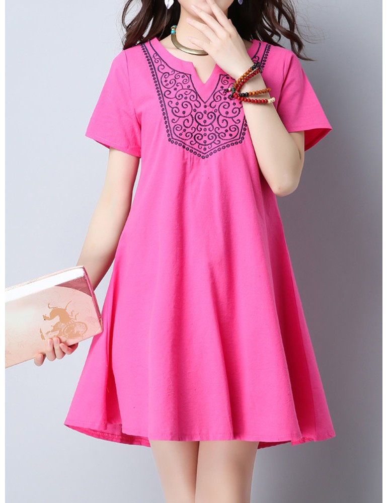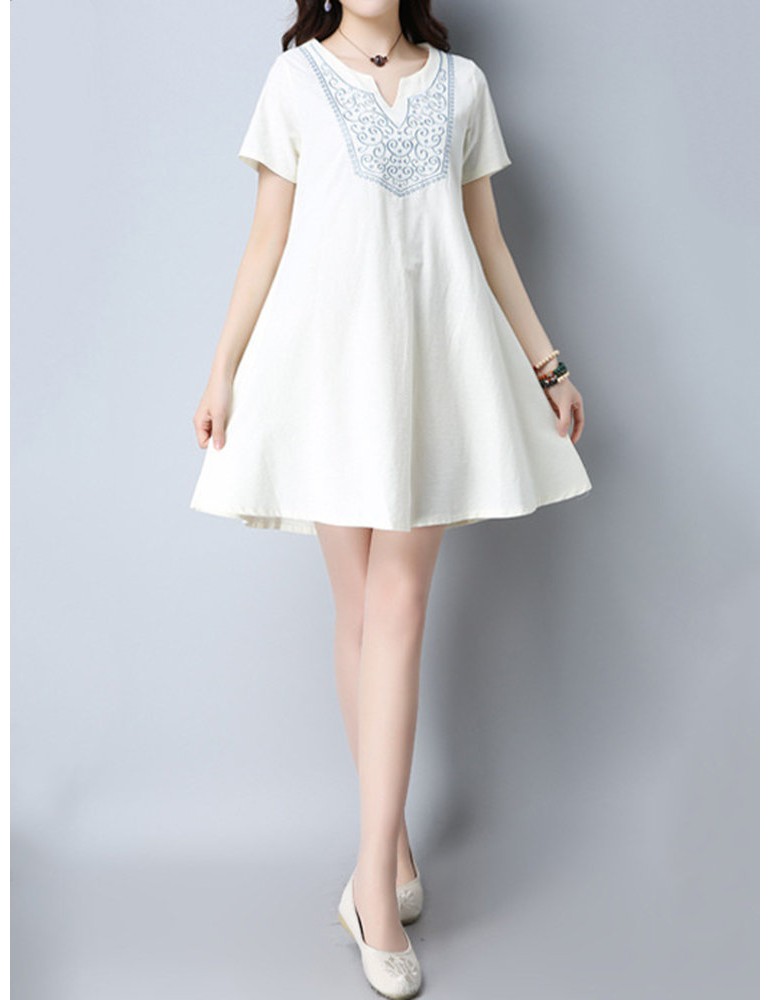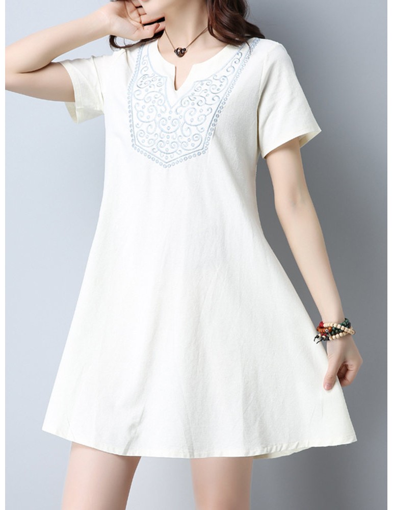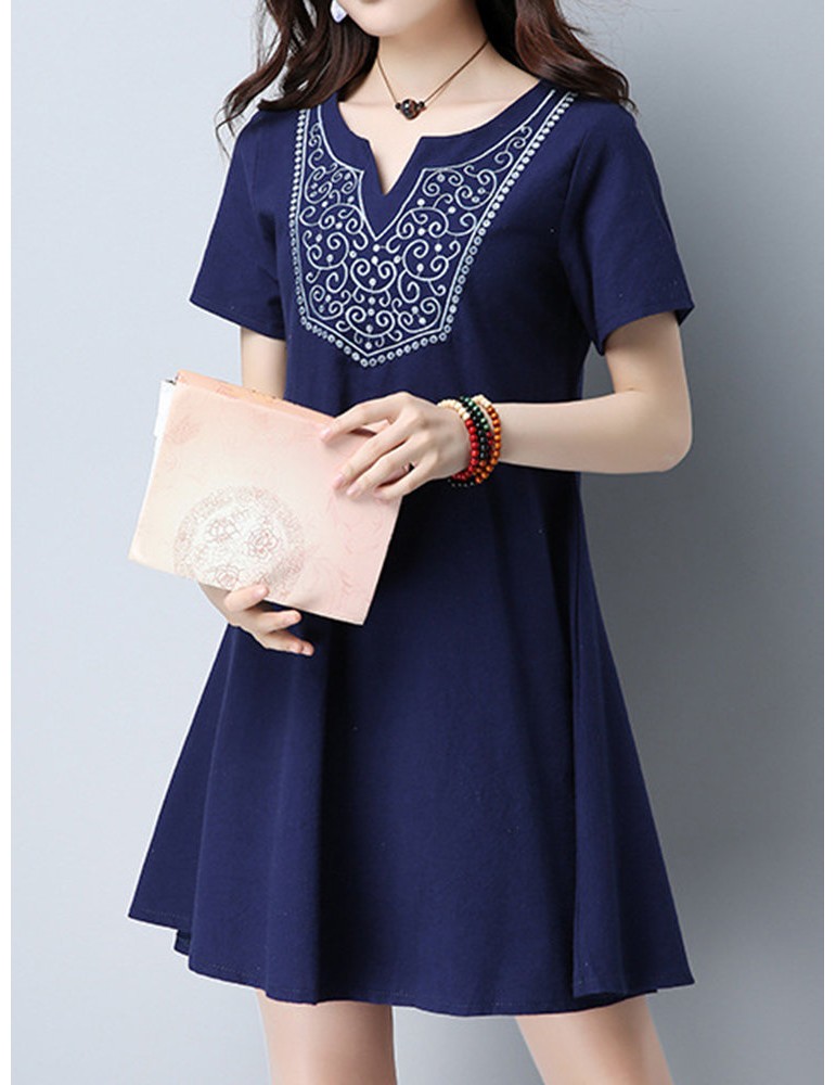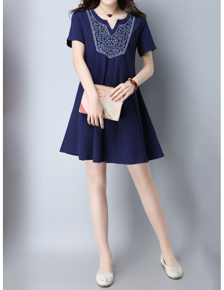 Vintage Women Embroidered V-Neck Short Sleeve Dresses