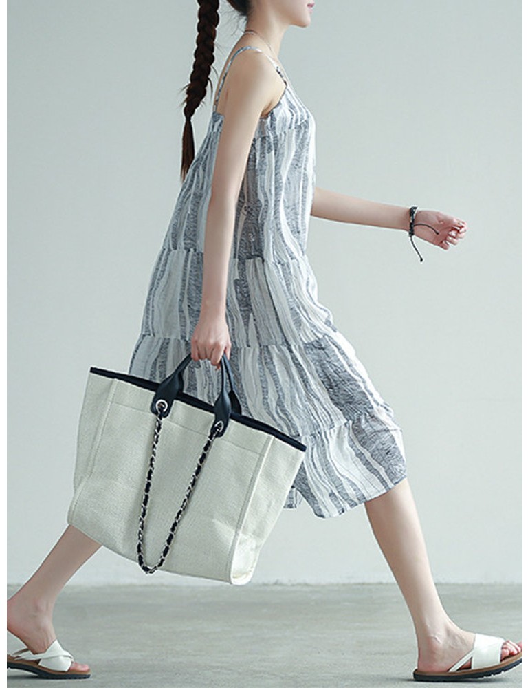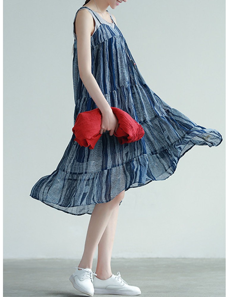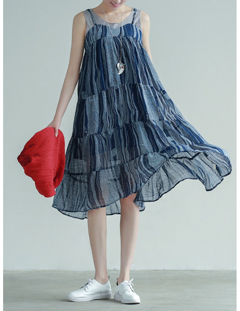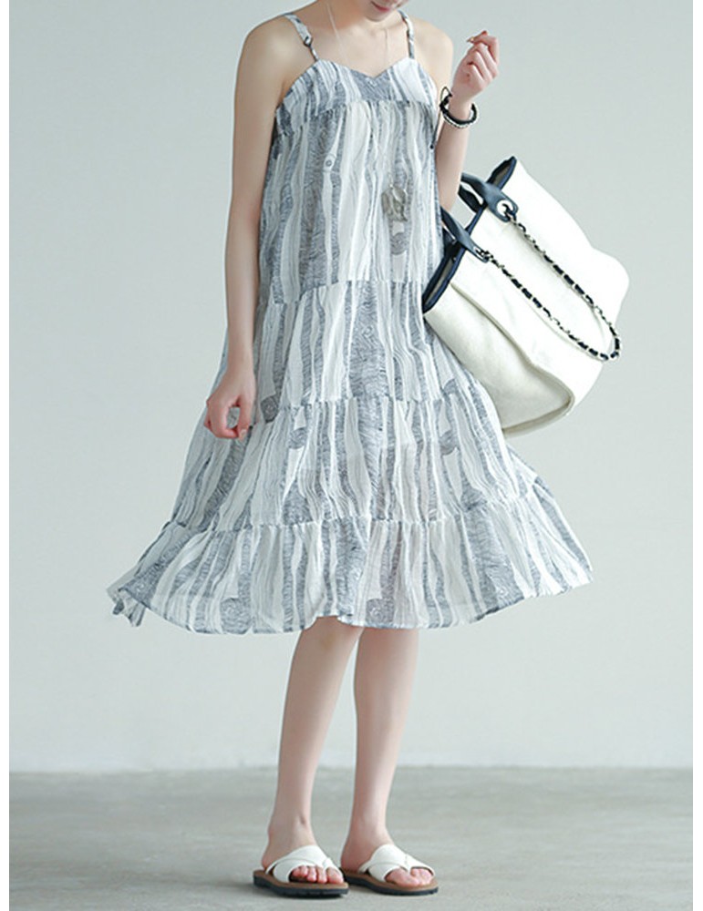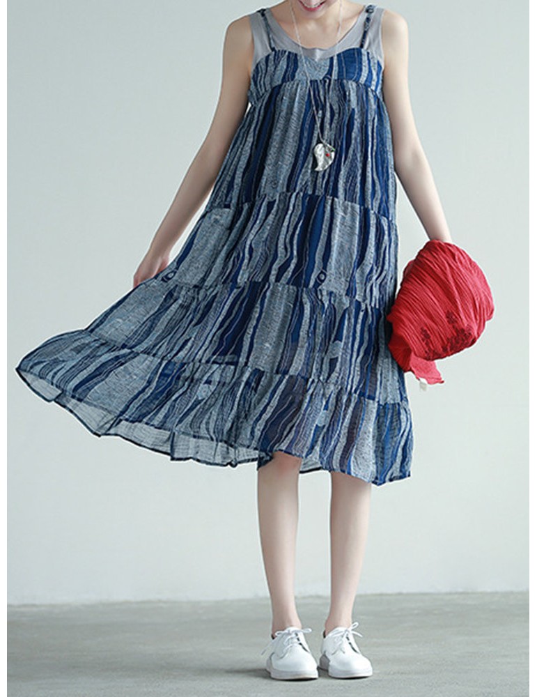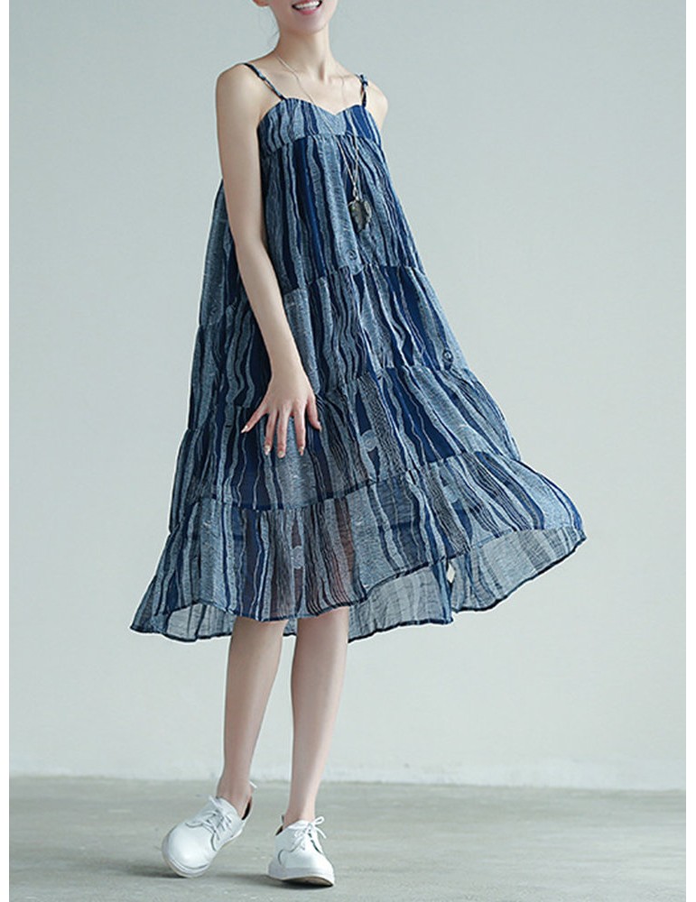 Stripe Patchwork Spaghetti Strap Vintage Mid-calf Dresses