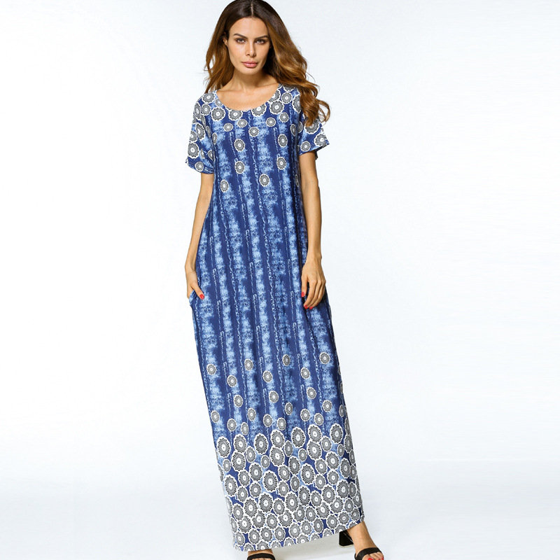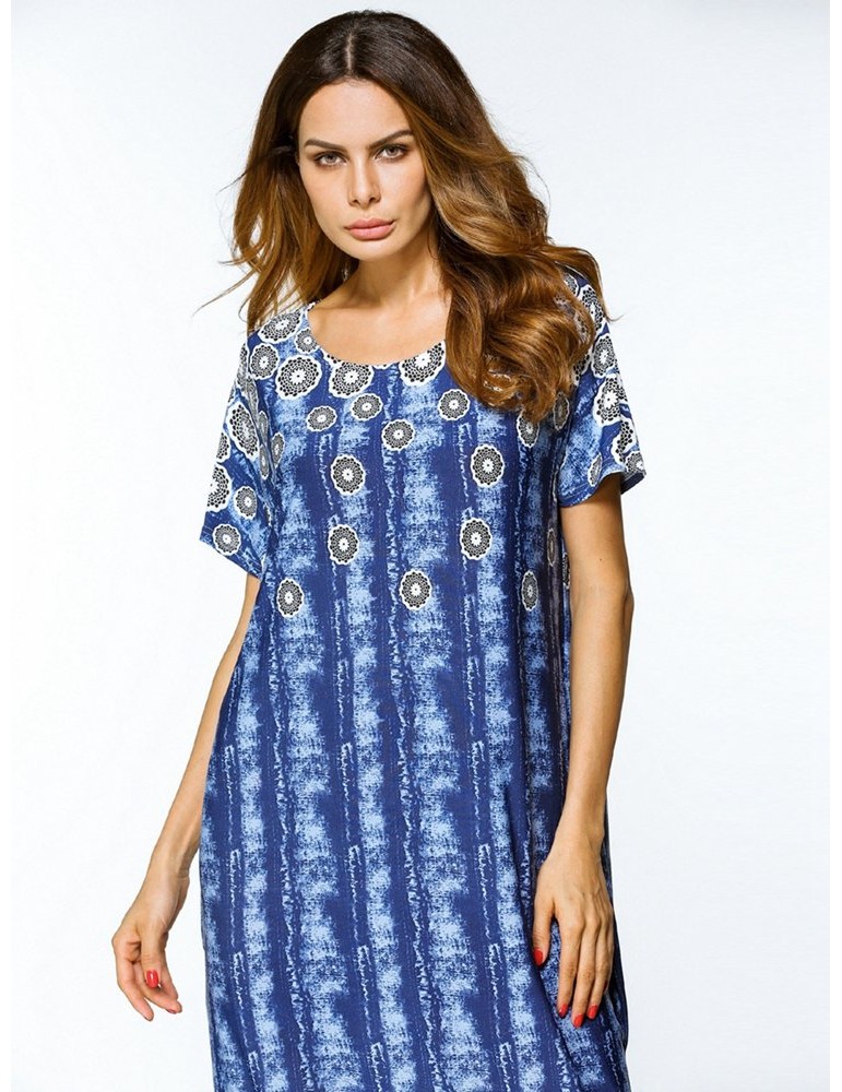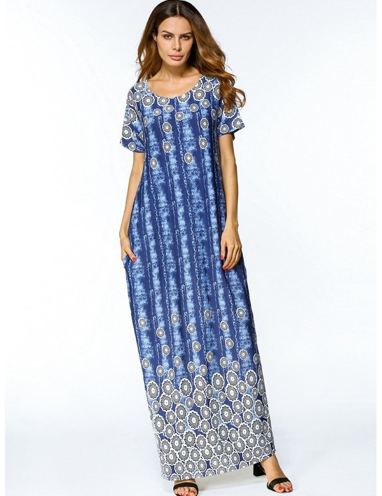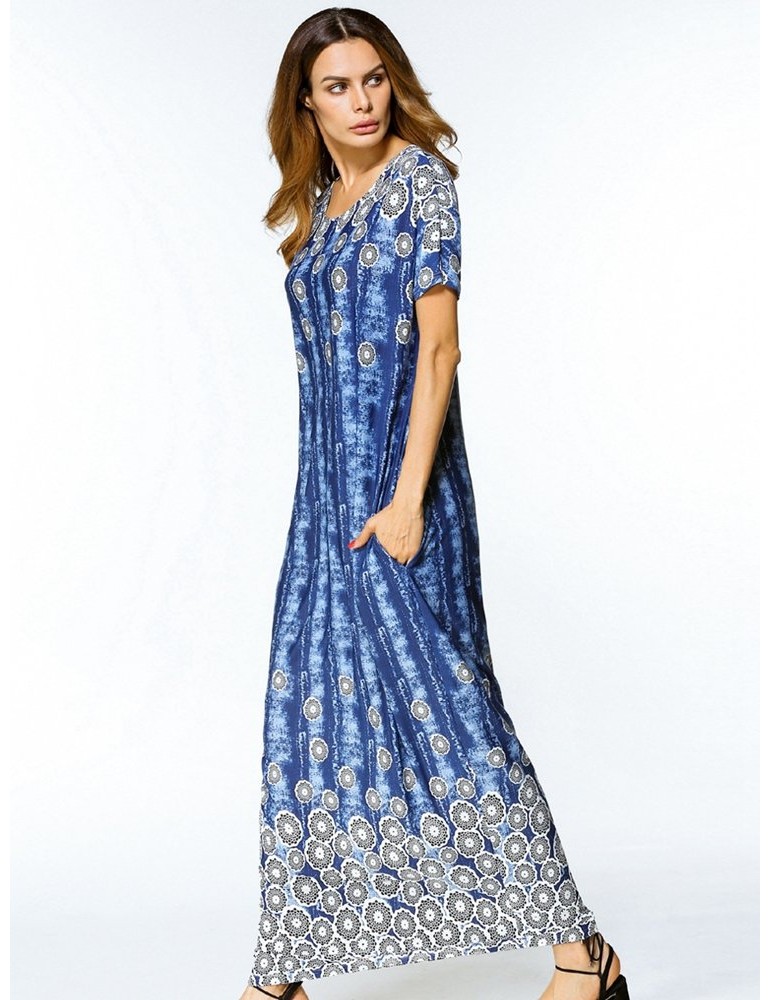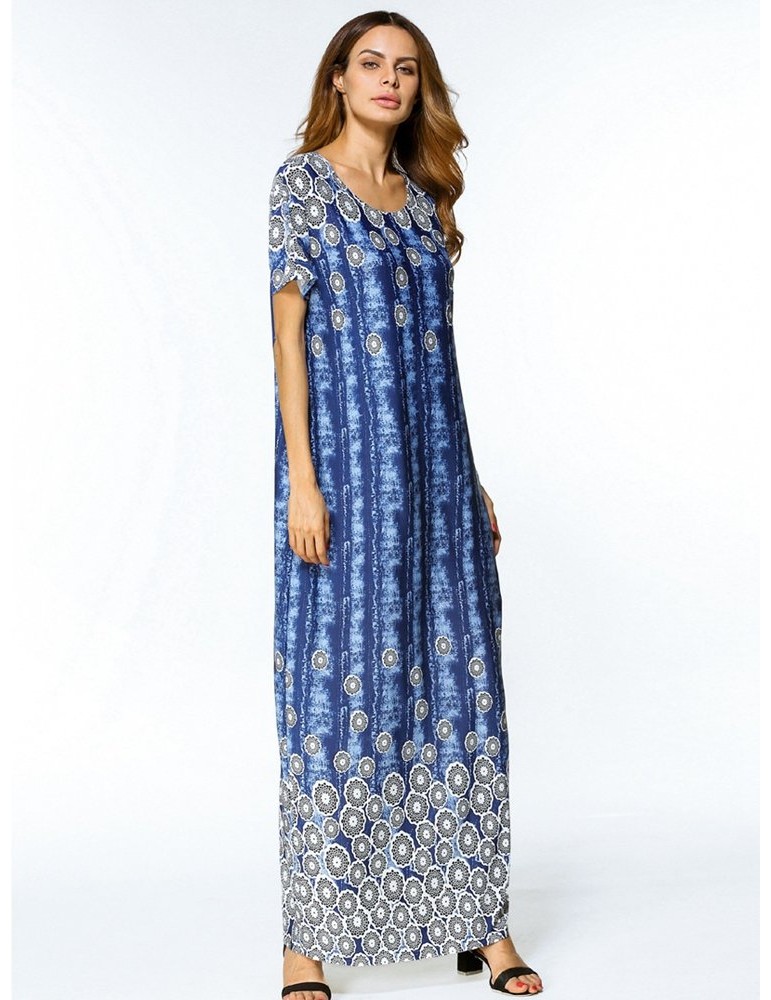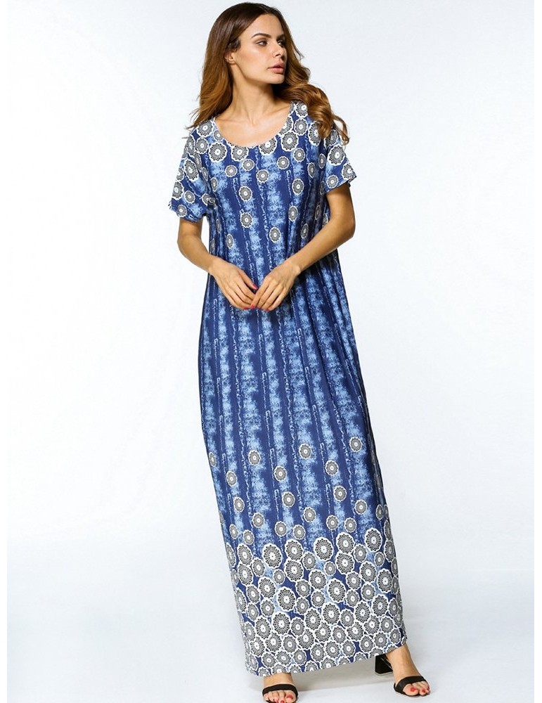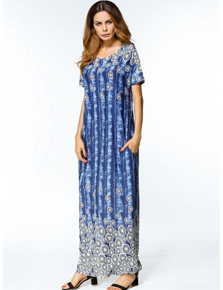 Casual Print O-neck Loose Short Sleeve Maxi Dresses For Women