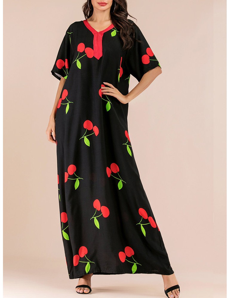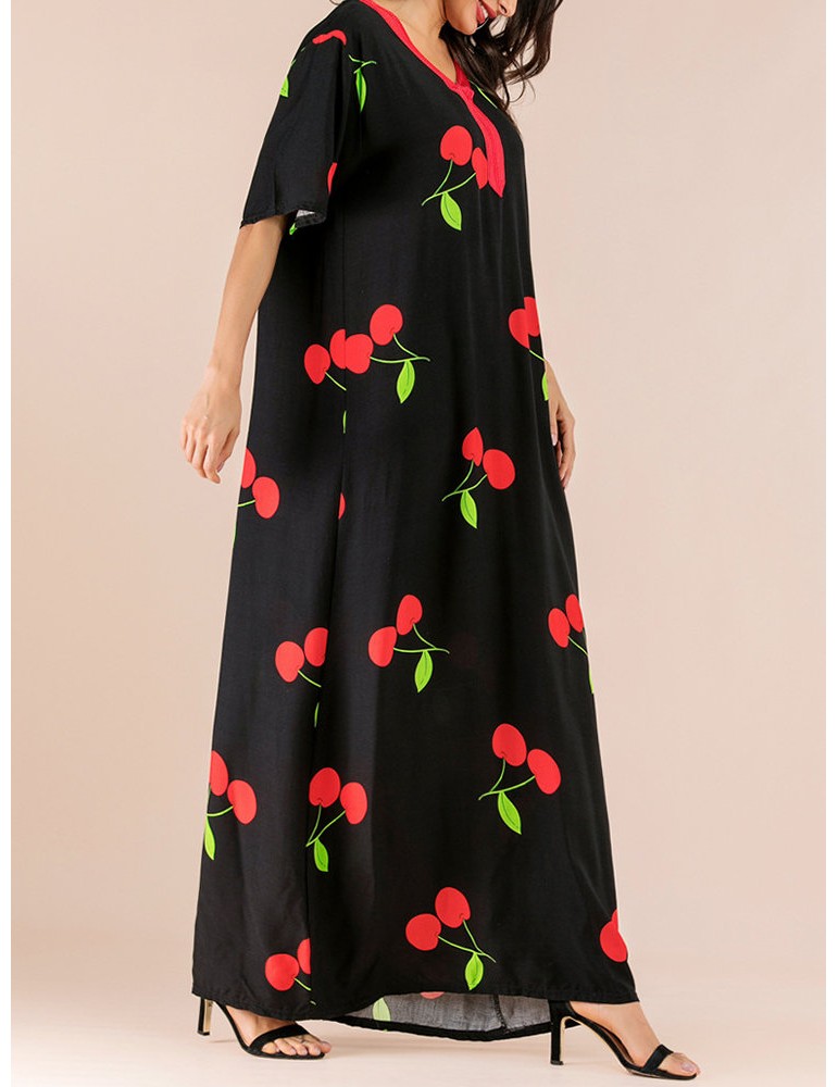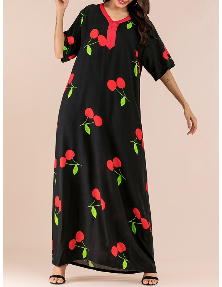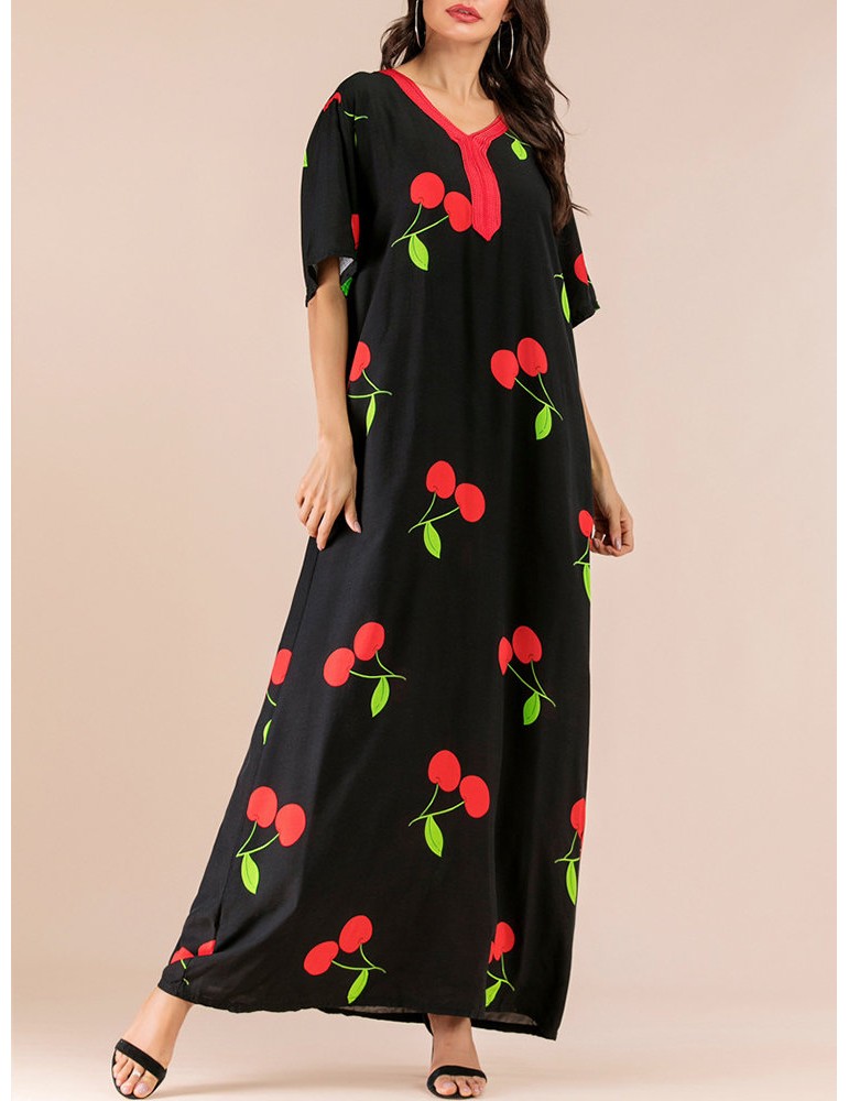Vintage Print Cherry V-neck Overhead Maxi Dress