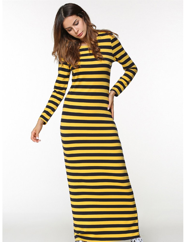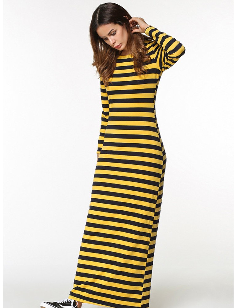 Women Casual Long Sleeve Stripe O-Neck Long Maxi Dresses