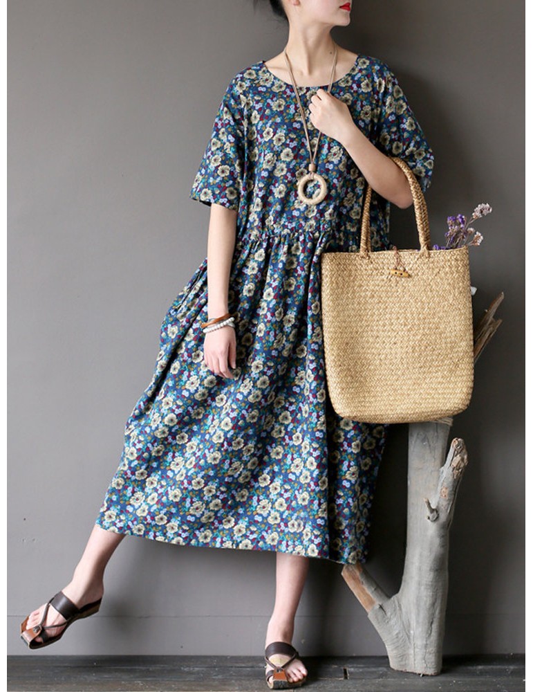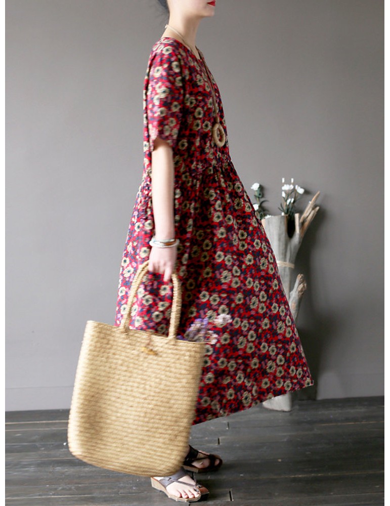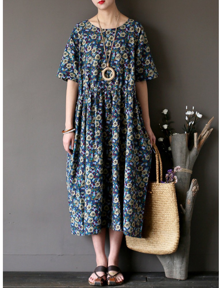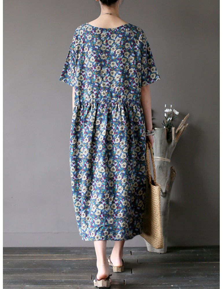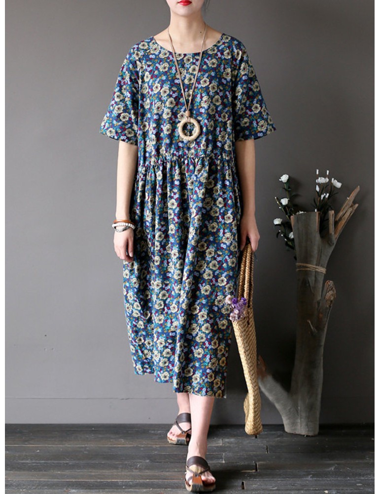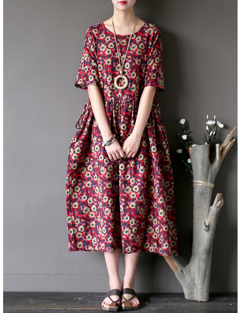 Vintage Casual Women Short Sleeve Floral Print Dresses