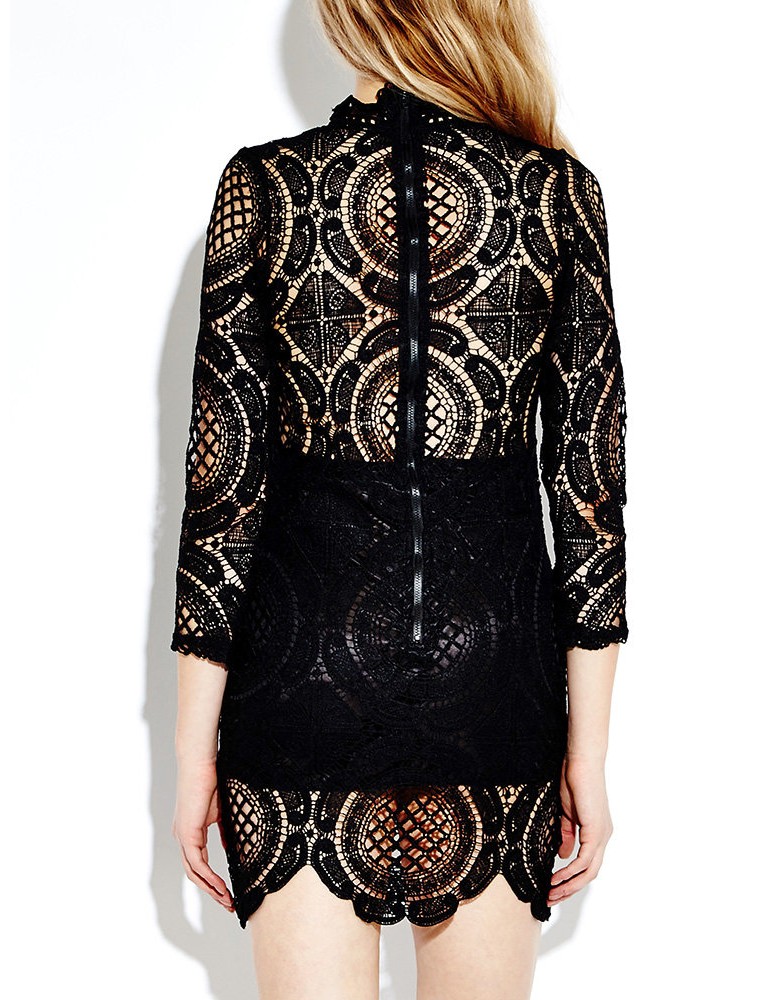 Solid Lace Crochet Hollow Out Splicing Long Sleeve Mini Dresses