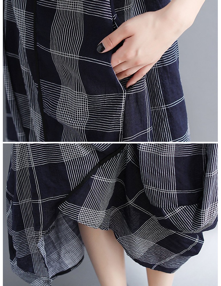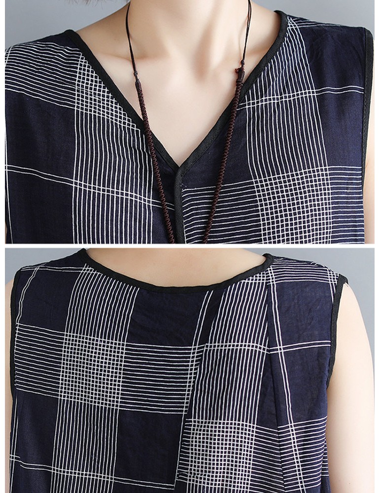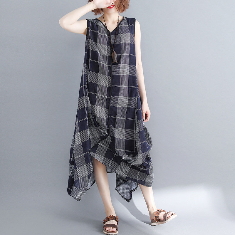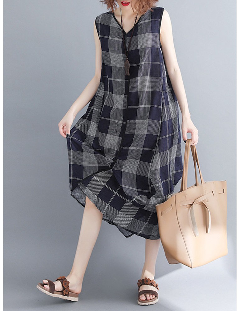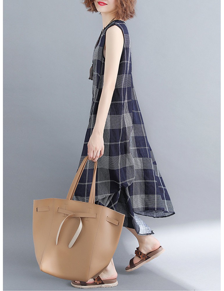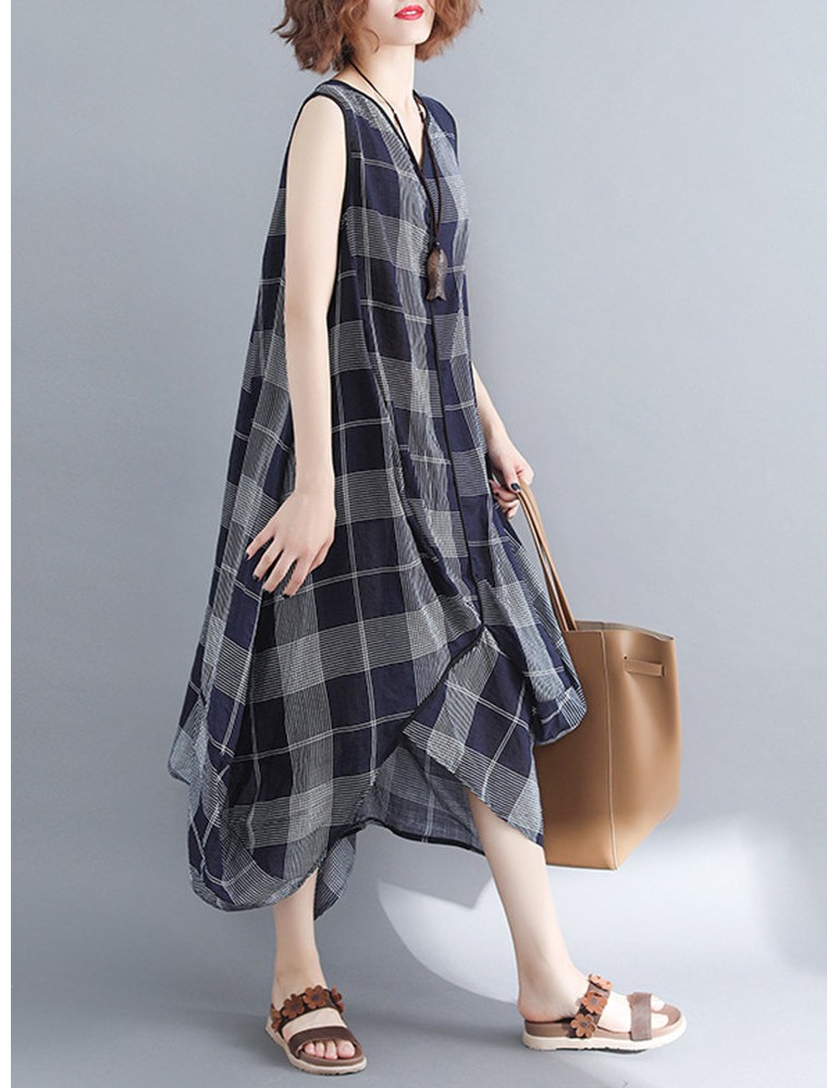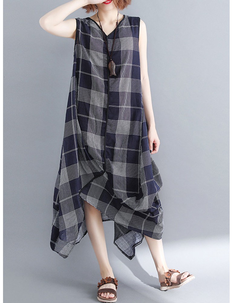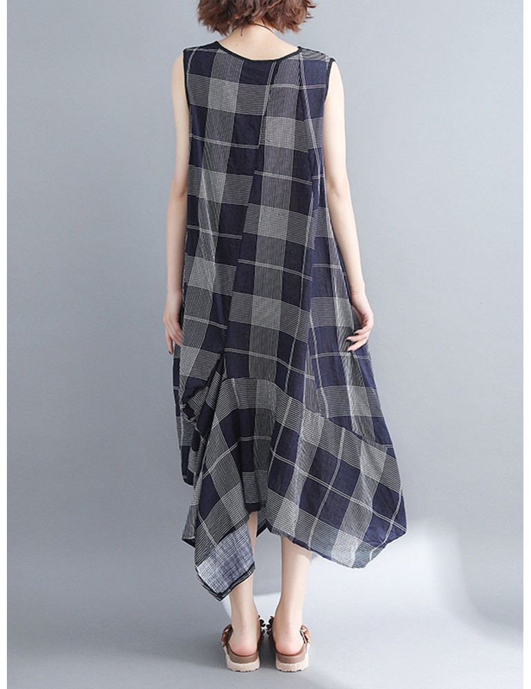 Sleeveless Plaid Print Irregular O-neck Vintage Dresses