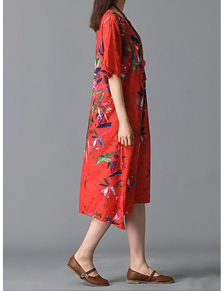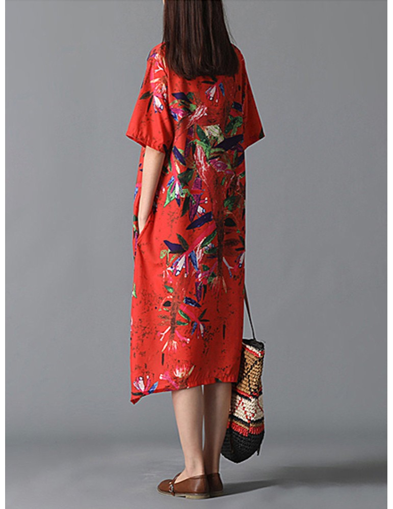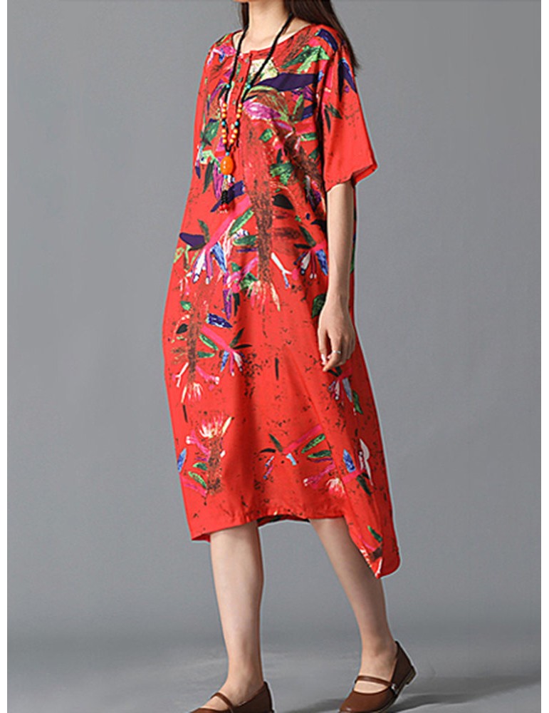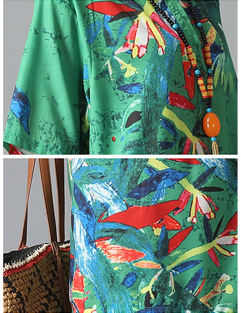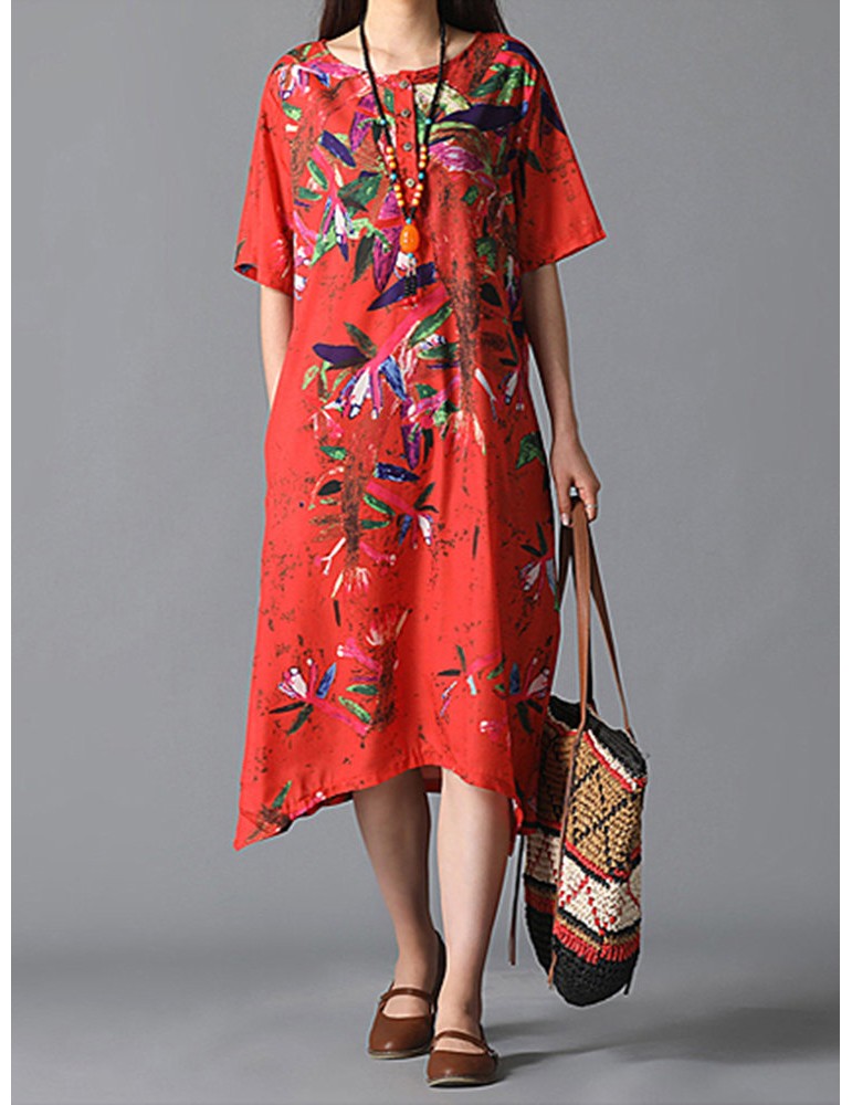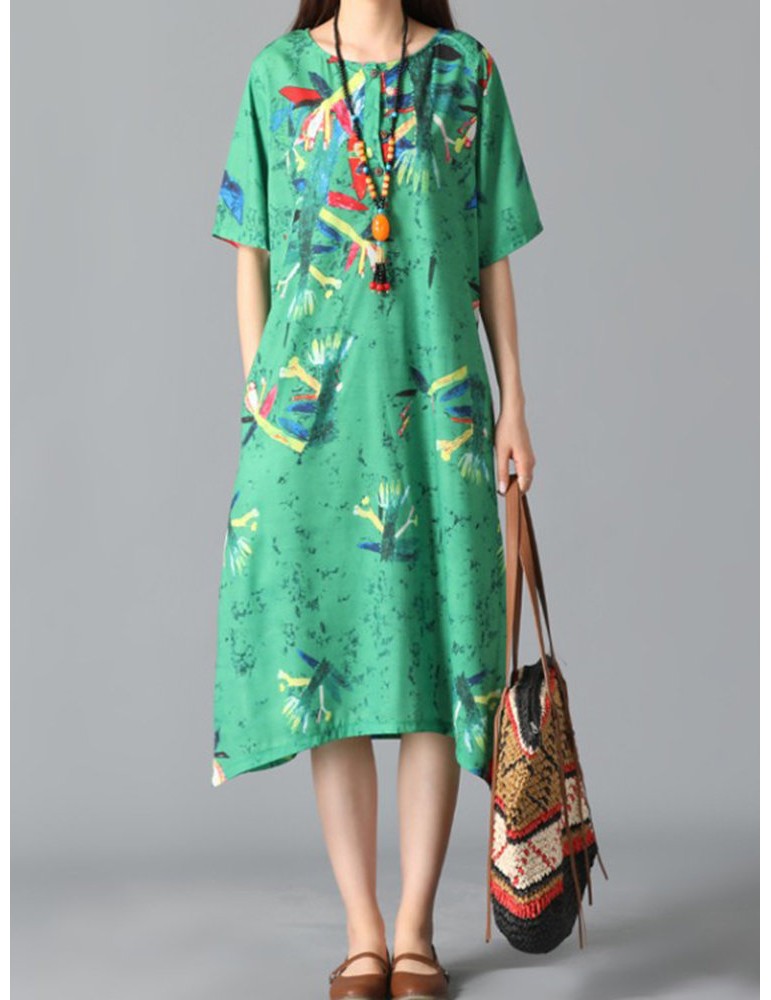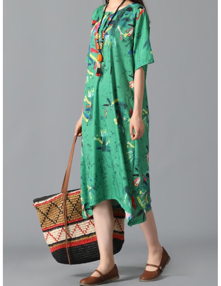 Graffiti Leaves Print Short Sleeve Irregular Vintage Dresses