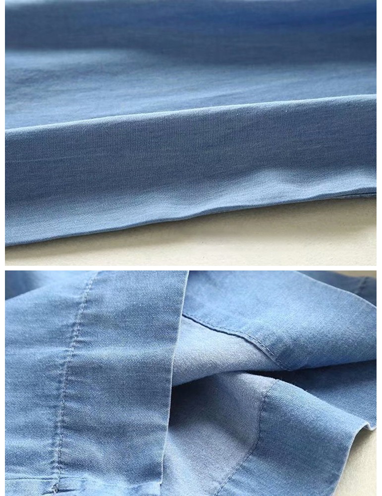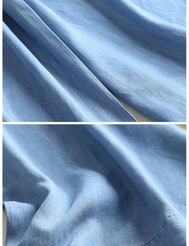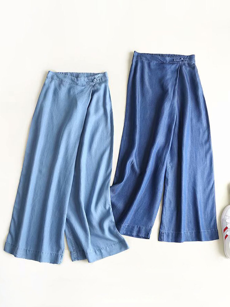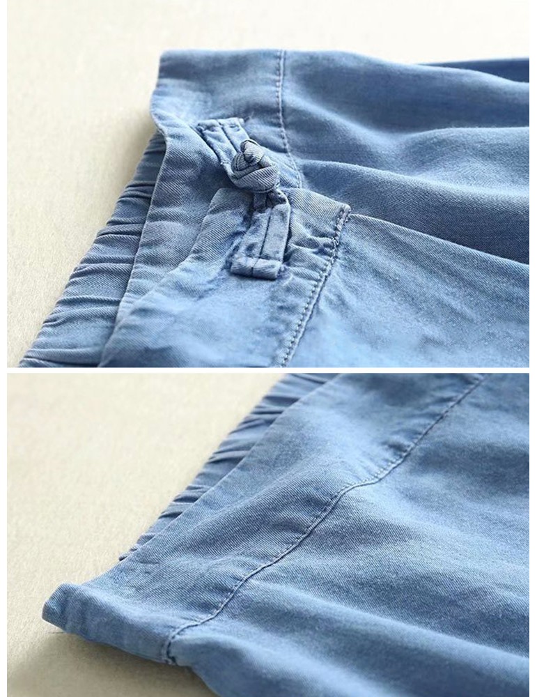 Frog Button Denim Pure Color Elastic Waist Casual Pants