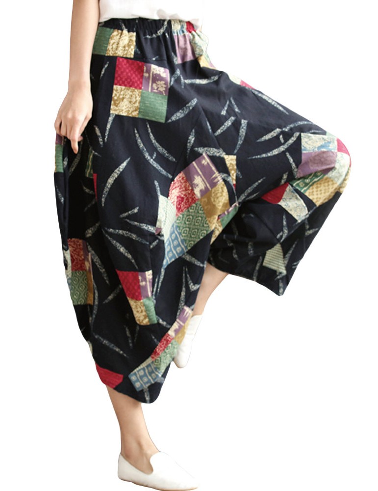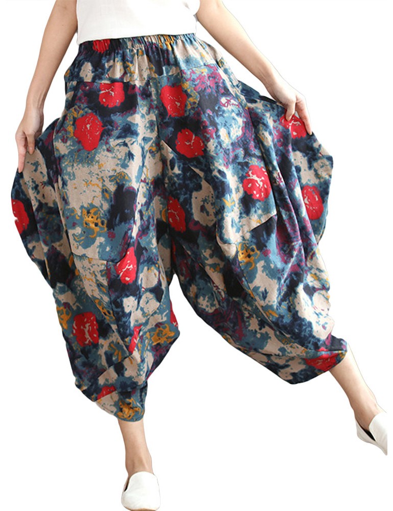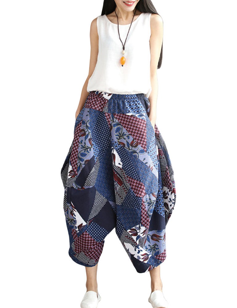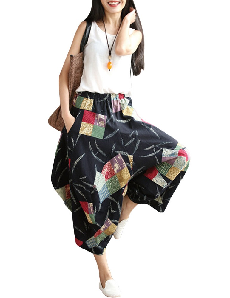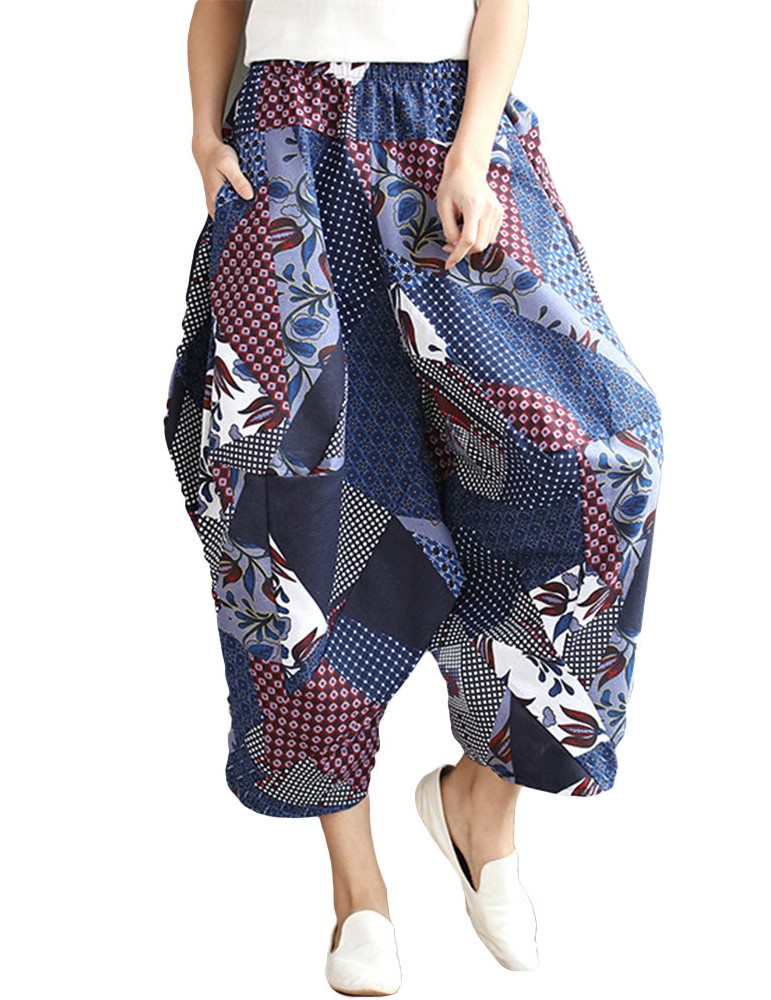 Leisure Loose Folk Print Pocket Harem Women Pants