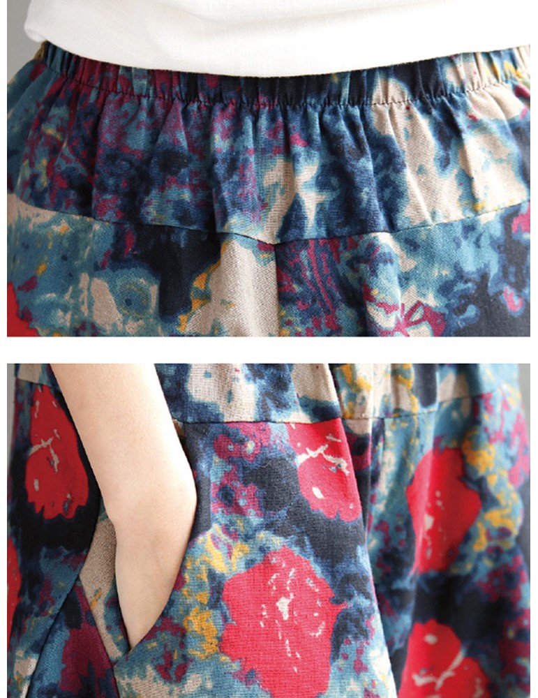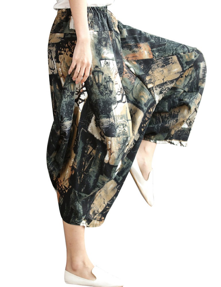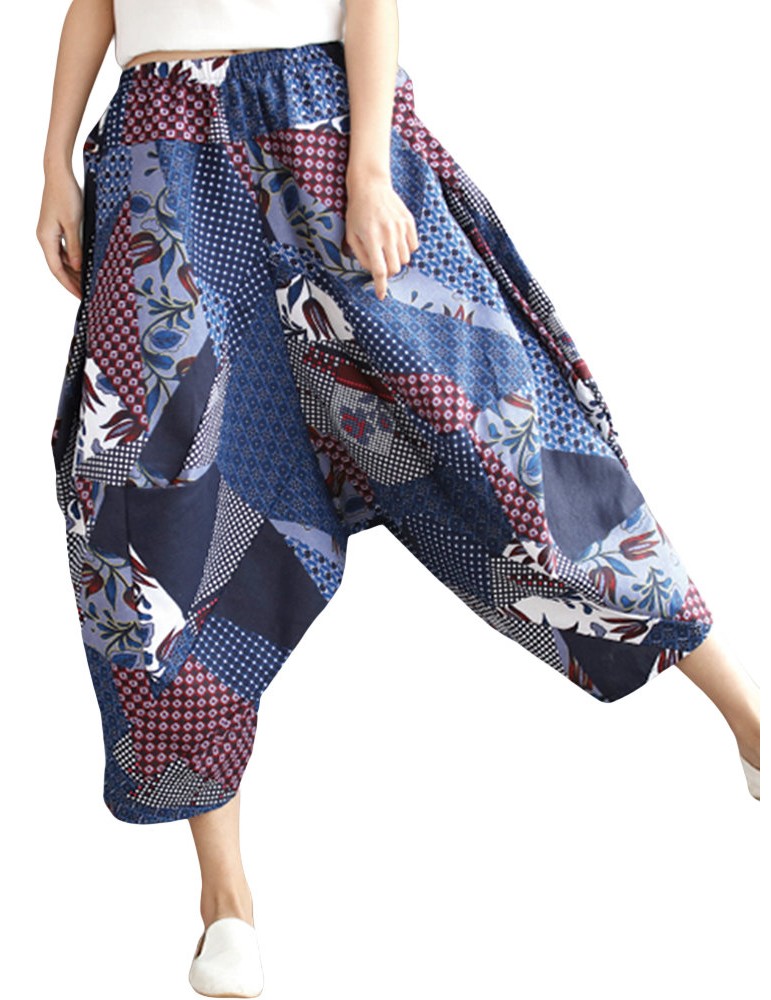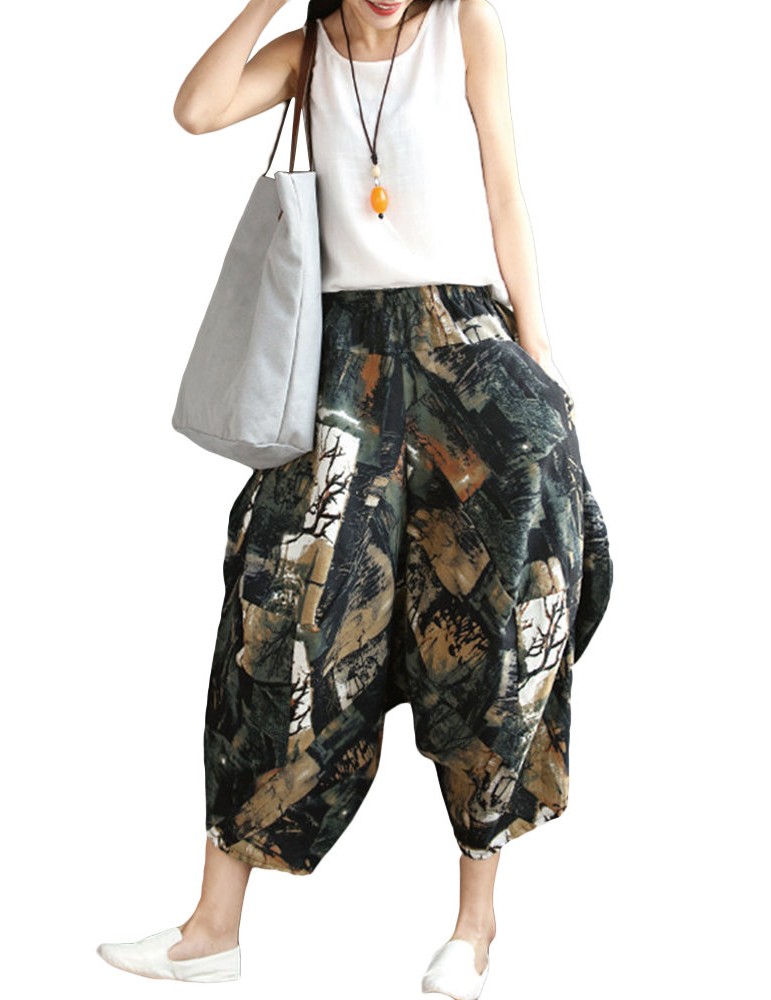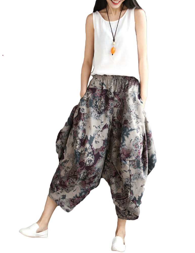 Leisure Loose Folk Print Pocket Harem Women Pants