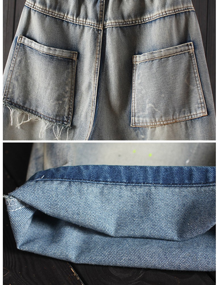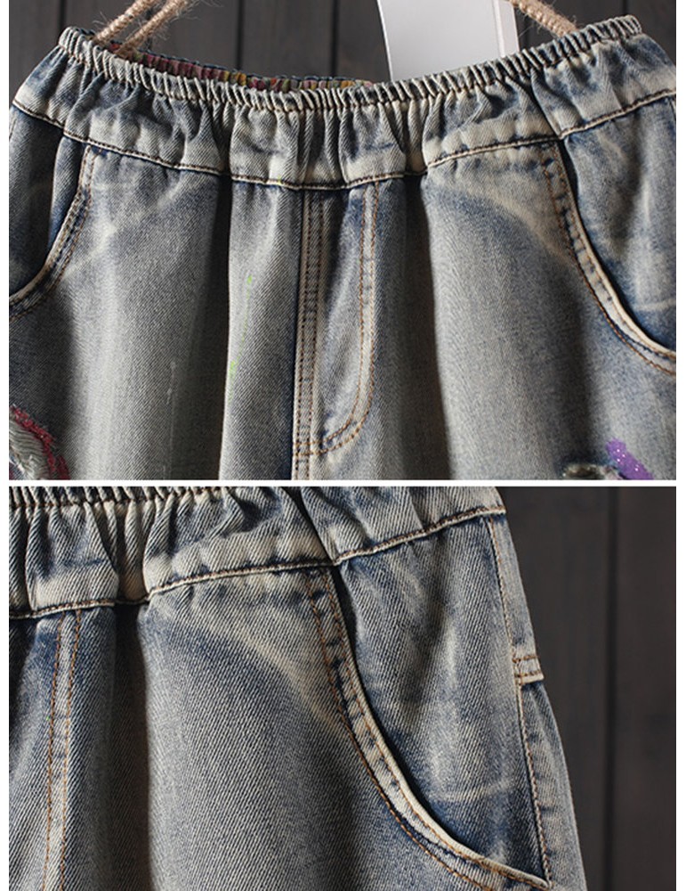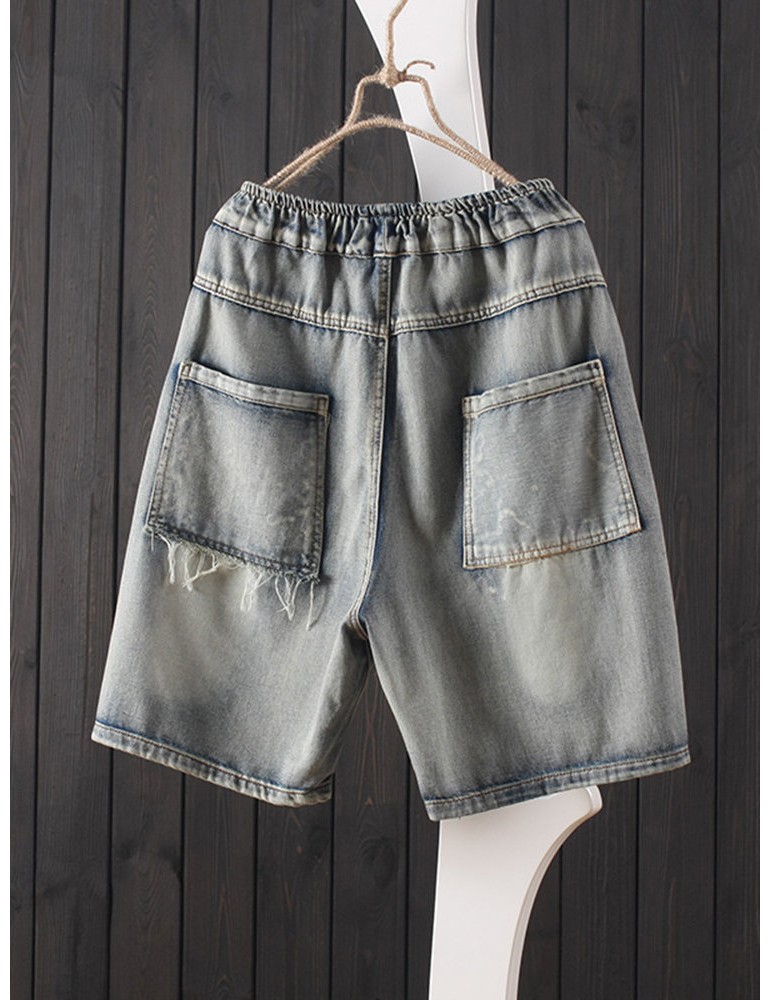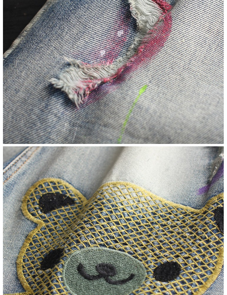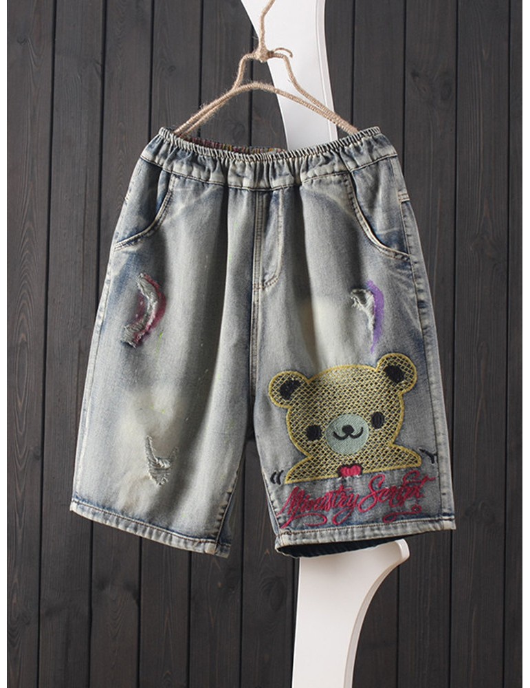 Cartoon Bear Embroidery Ripped Short Jeans For Women