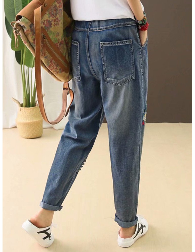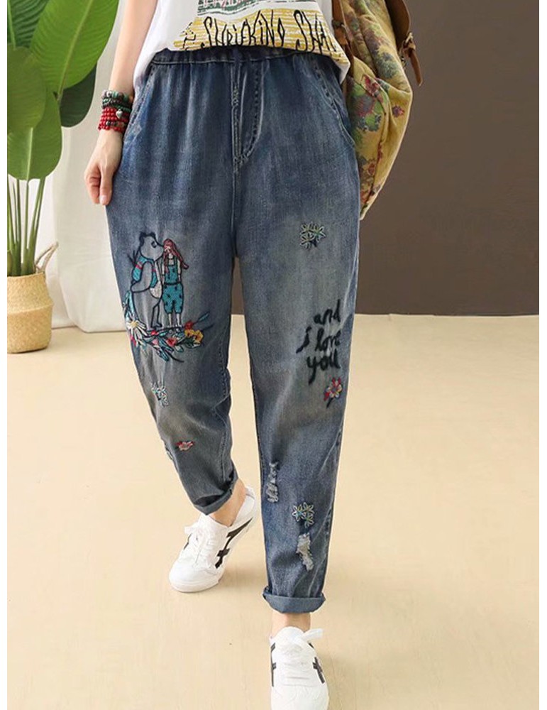 Casual Washed Old Embroidery Beautiful Letters Hole Loose Jeans