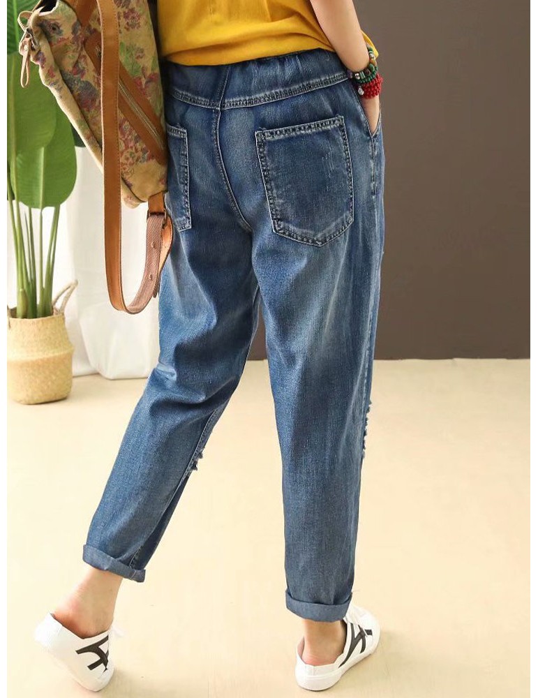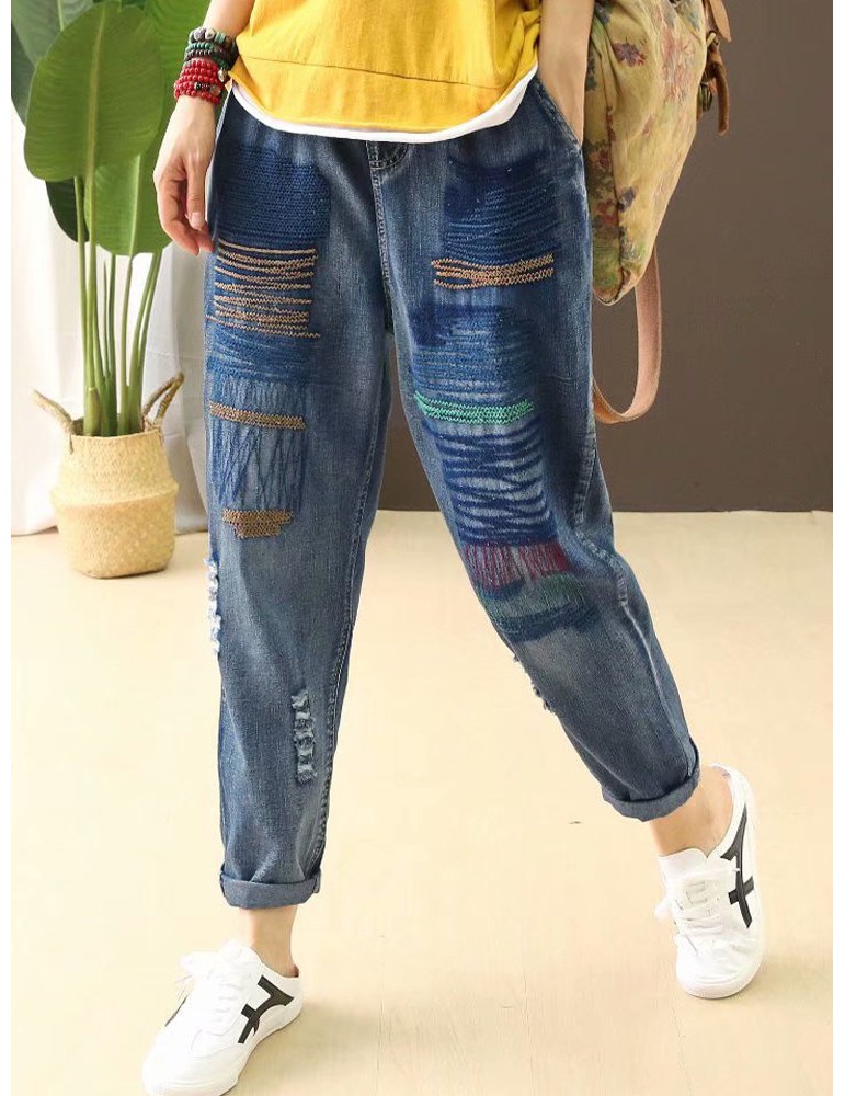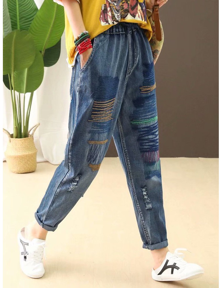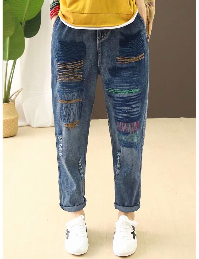 Stripe Embroidered Elastic Waist Ripped Jeans For Women