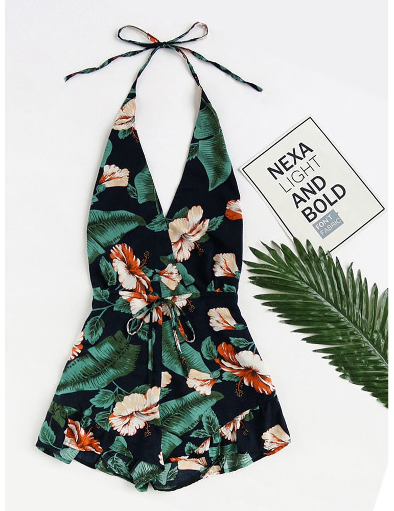 Sexy Backless Halter Floral Printed Bohemian Short Jumpsuits