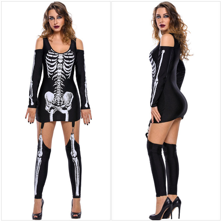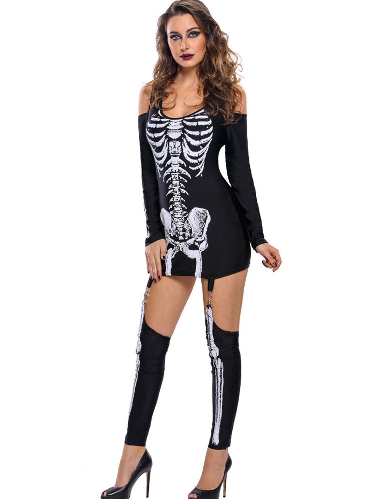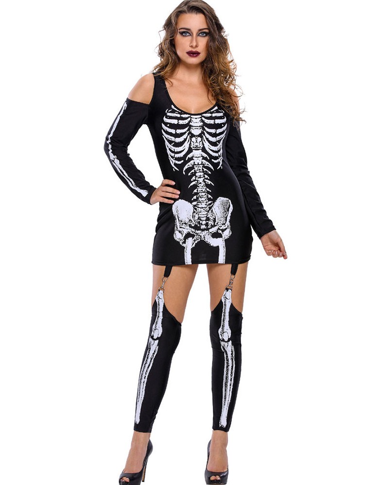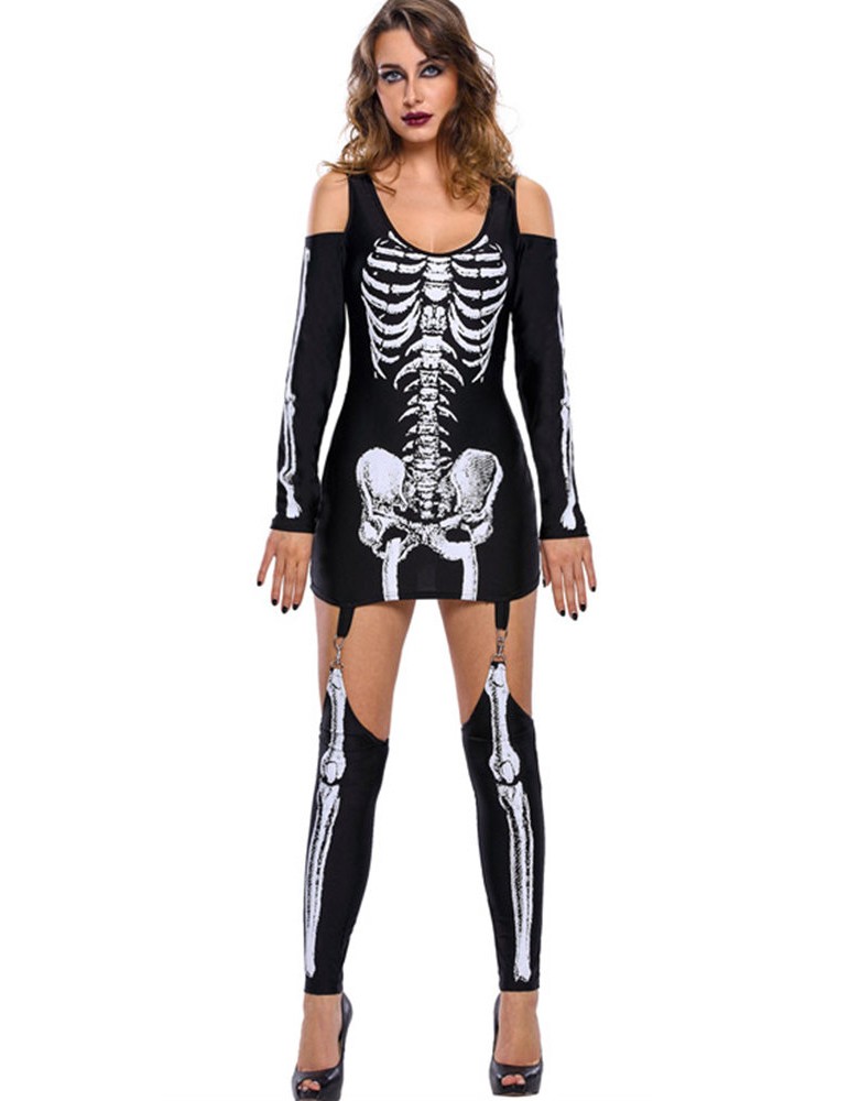Halloween Skeleton Print Cold Shoulder Long Sleeve Women Jumpsuits