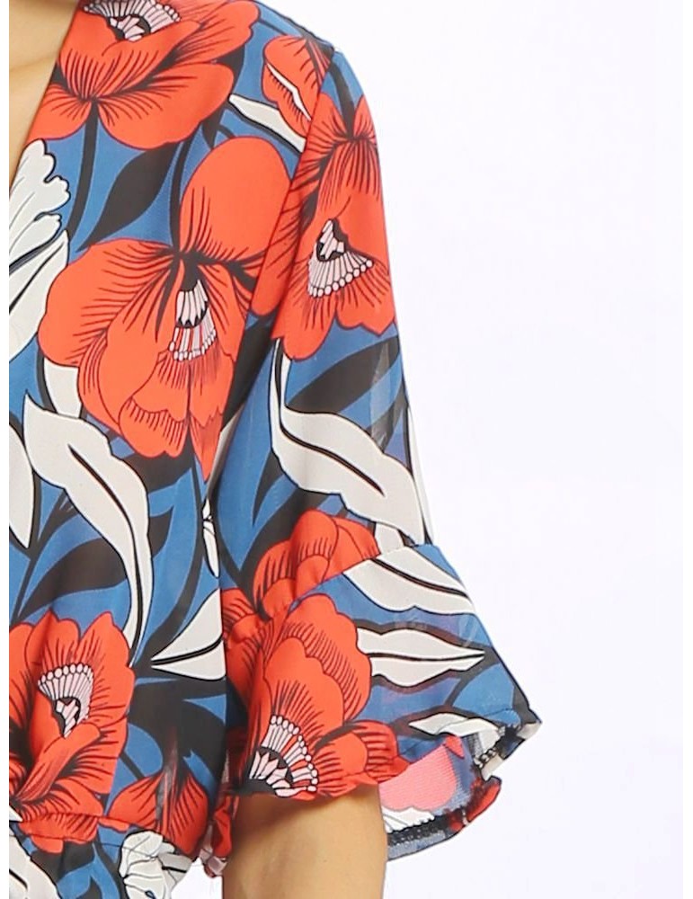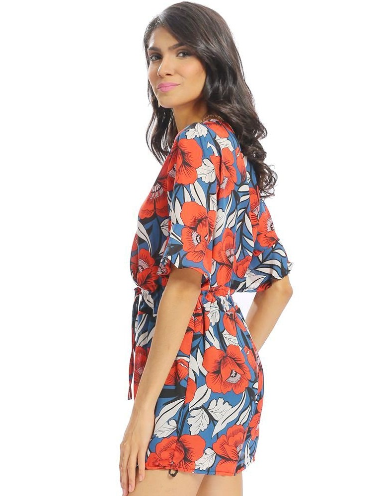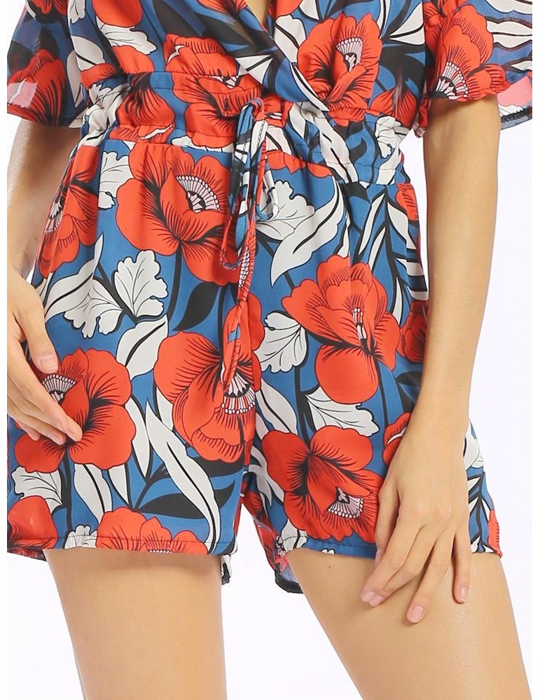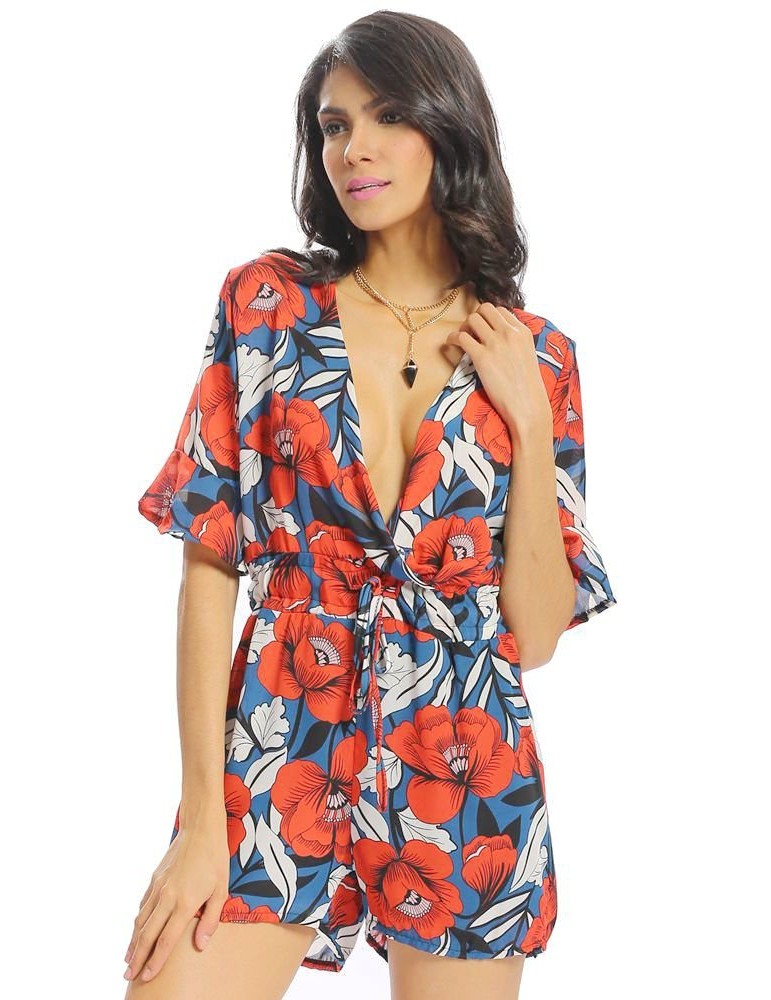 Women Vintage Floral Print V-neck Half Sleeve Short Jumpsuit