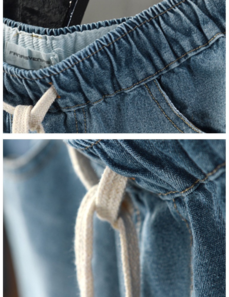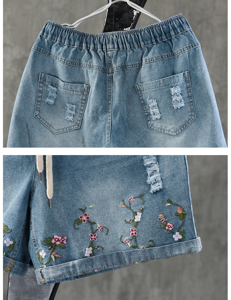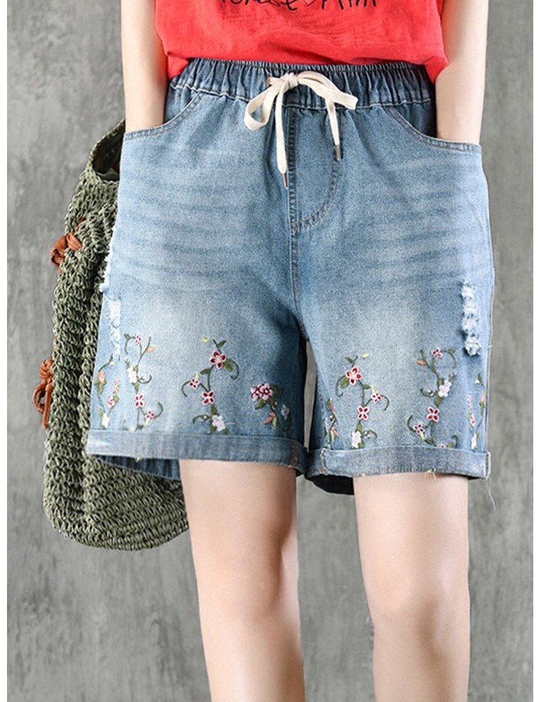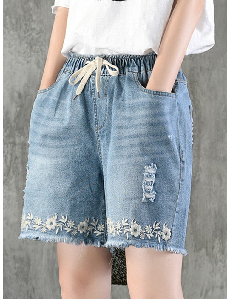 Embroidery Drawstring Ripped Short Jeans