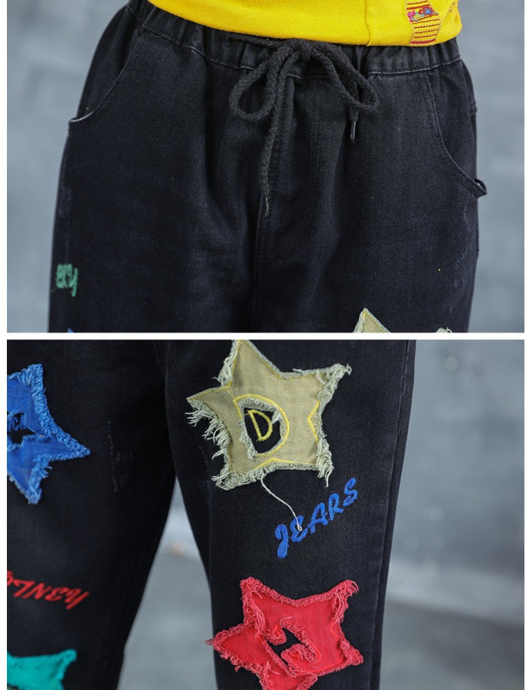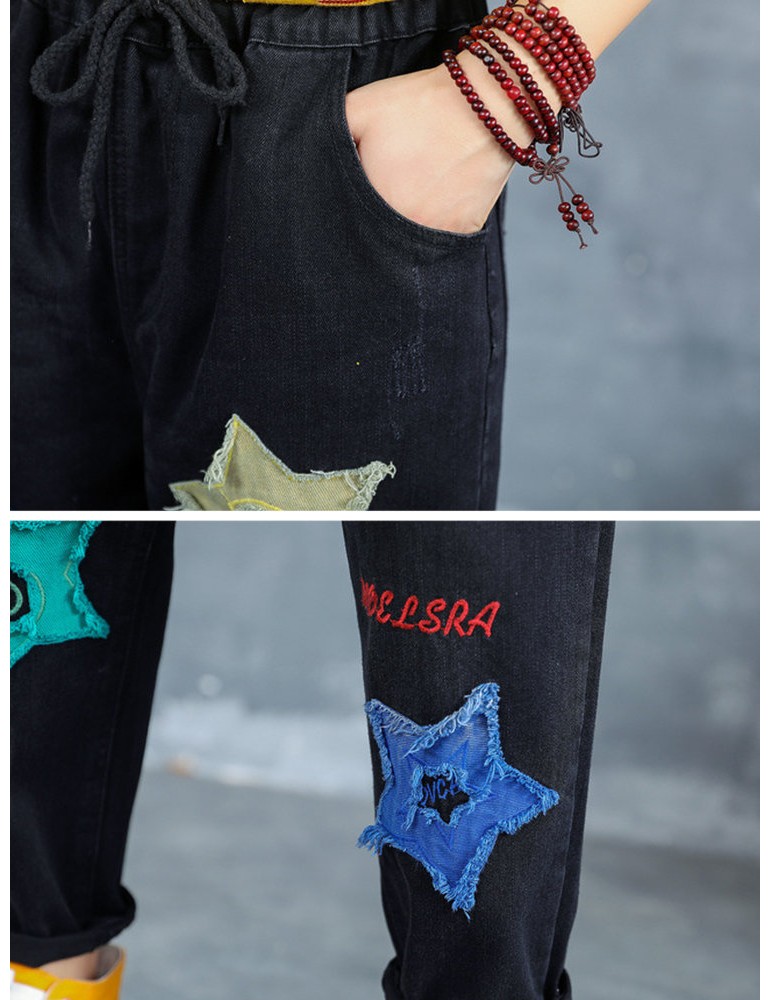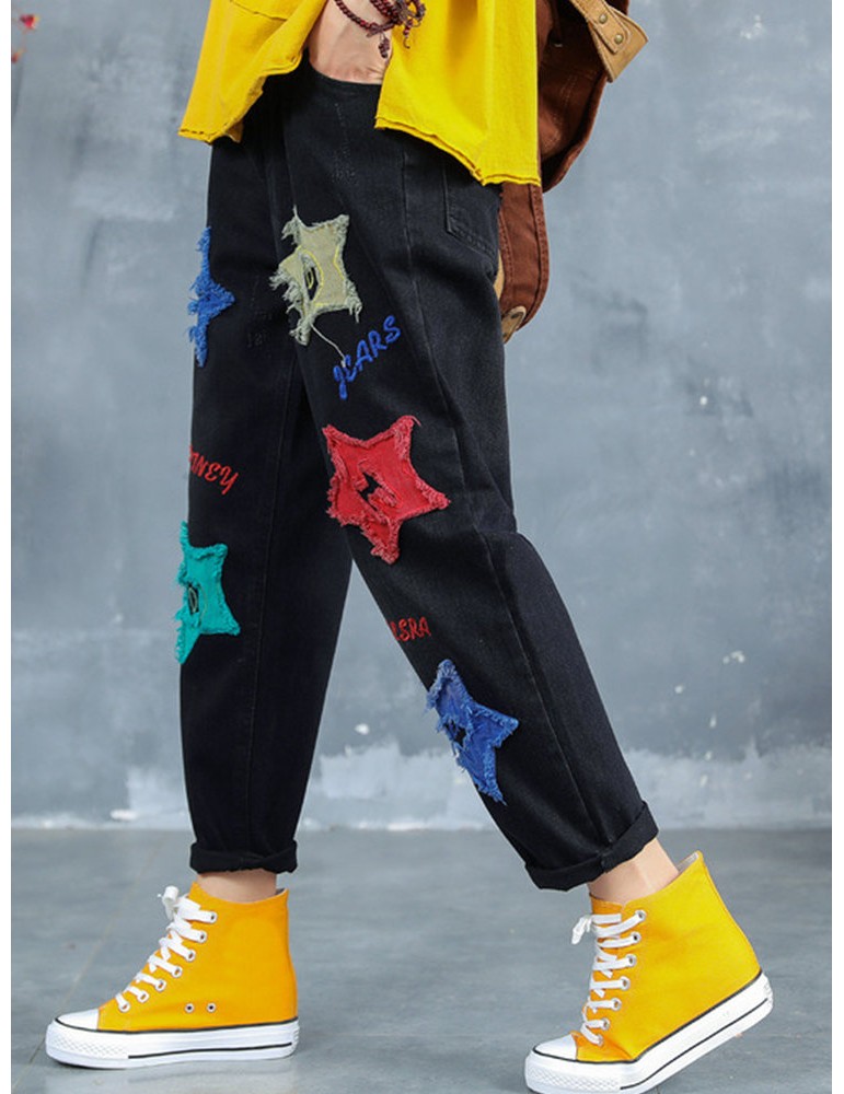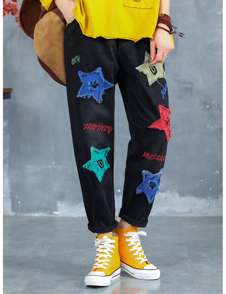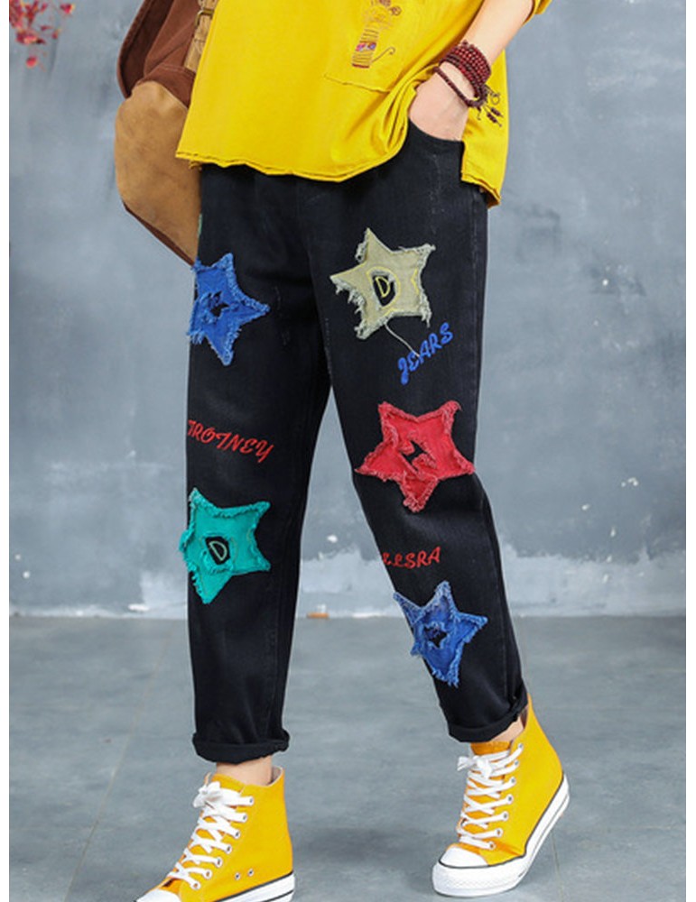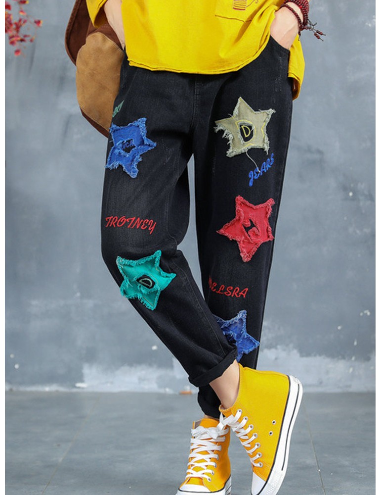 Letter Embroidered Stars Patch Jeans For Women