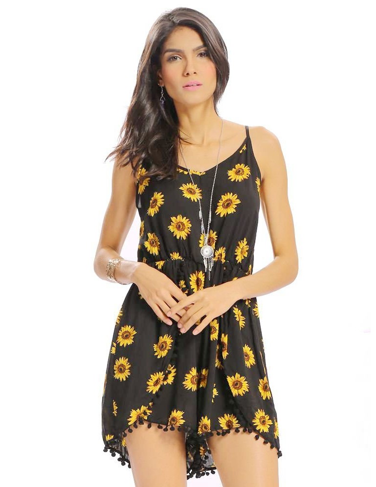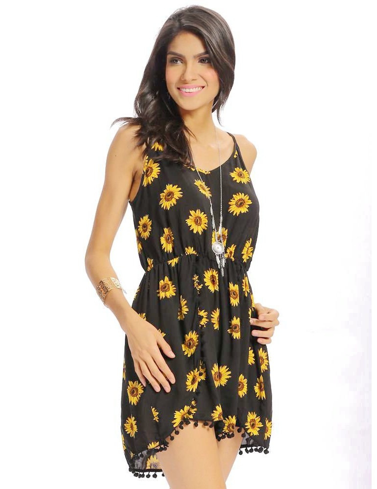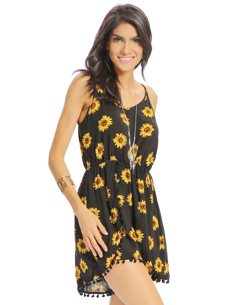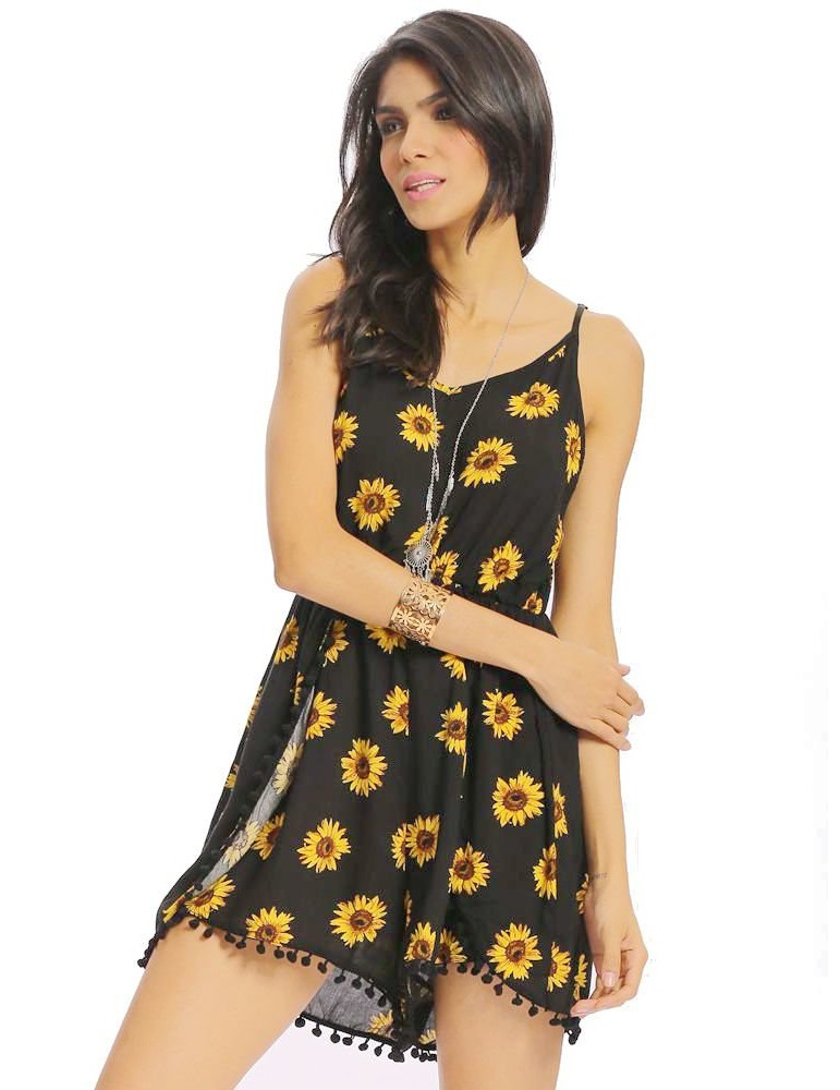 Women Casual Loose Sunflower Print Spaghetti Strap Backless O-neck Jumpsuit
