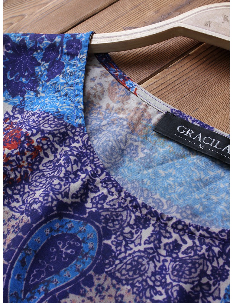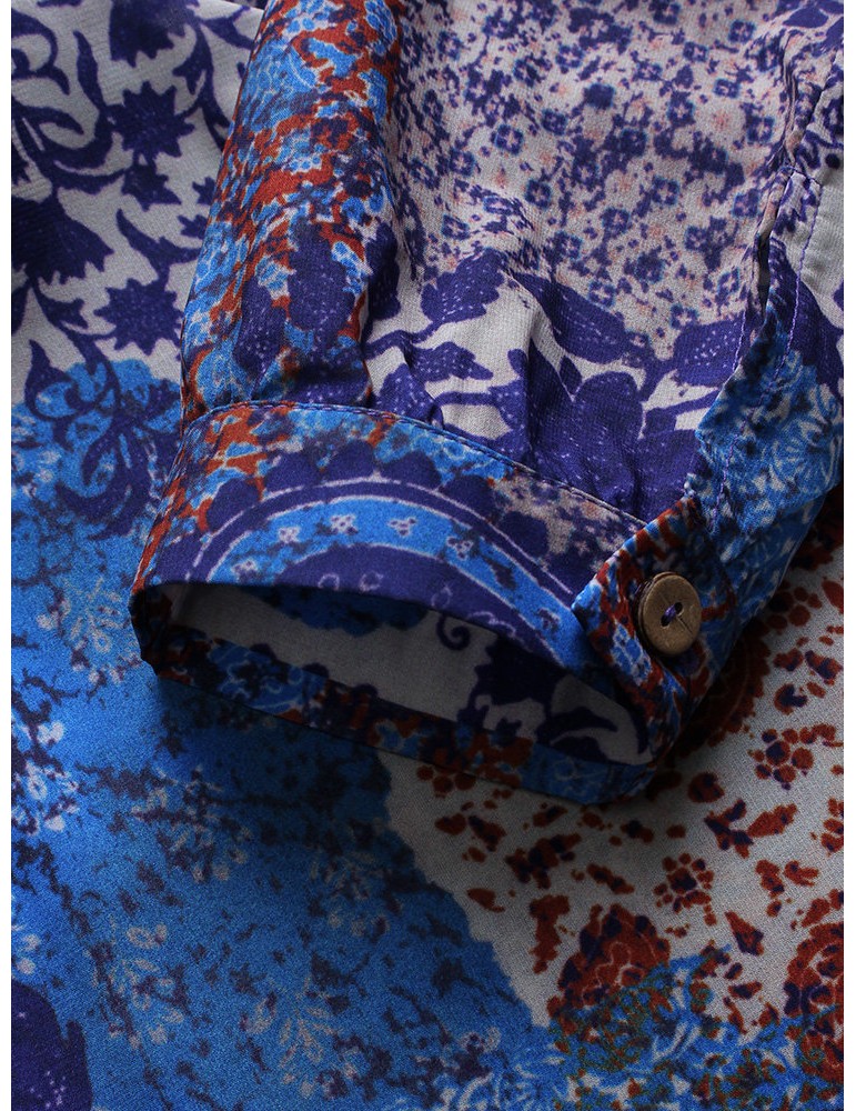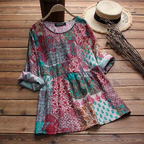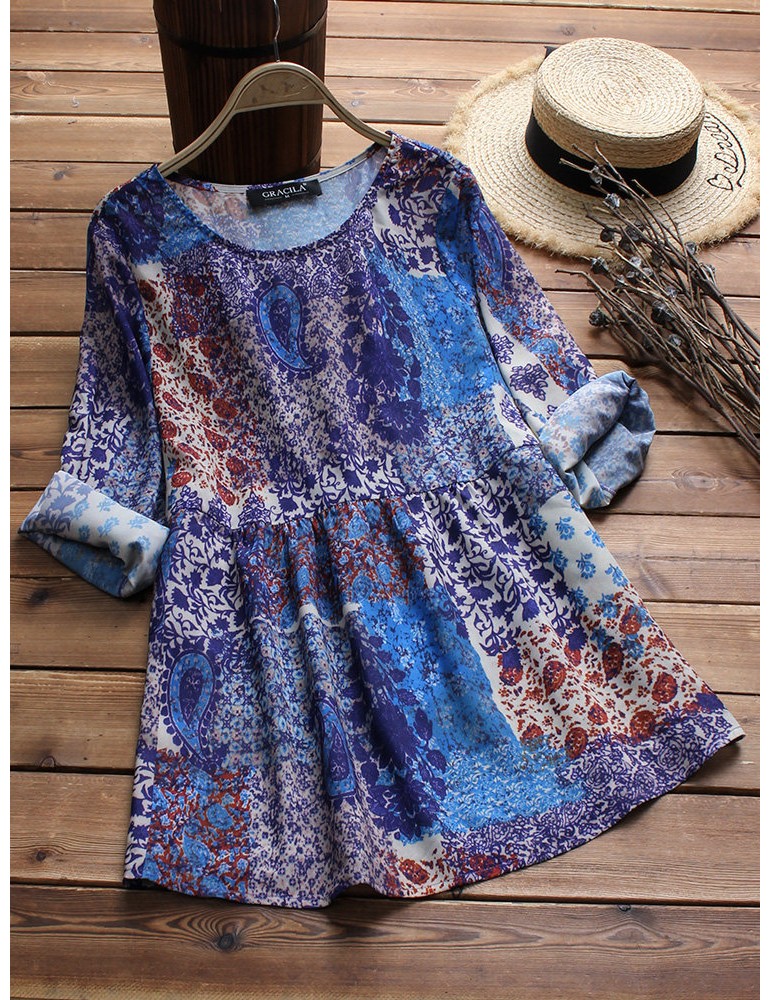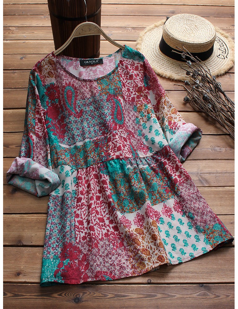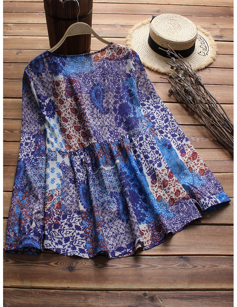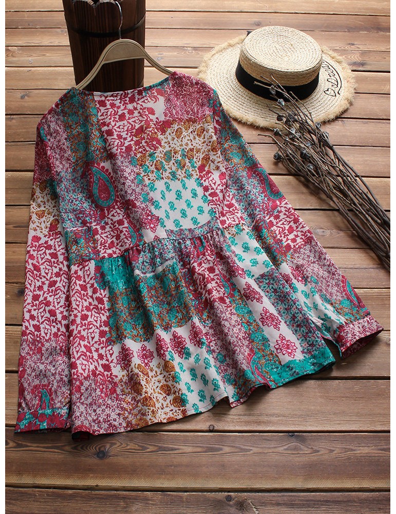 Folk Style Patchwork Print Long Sleeve Vintage T-shirts