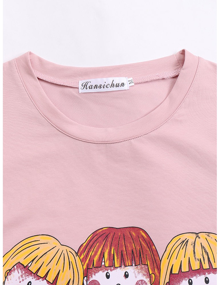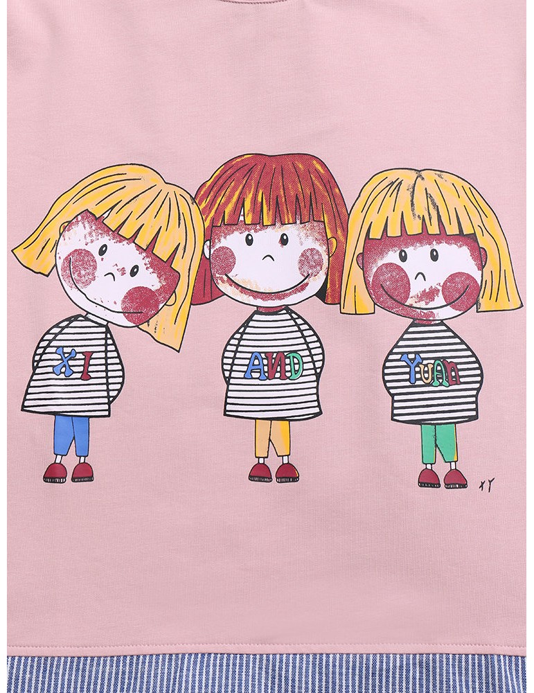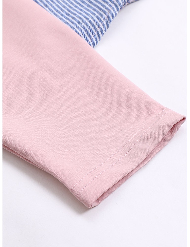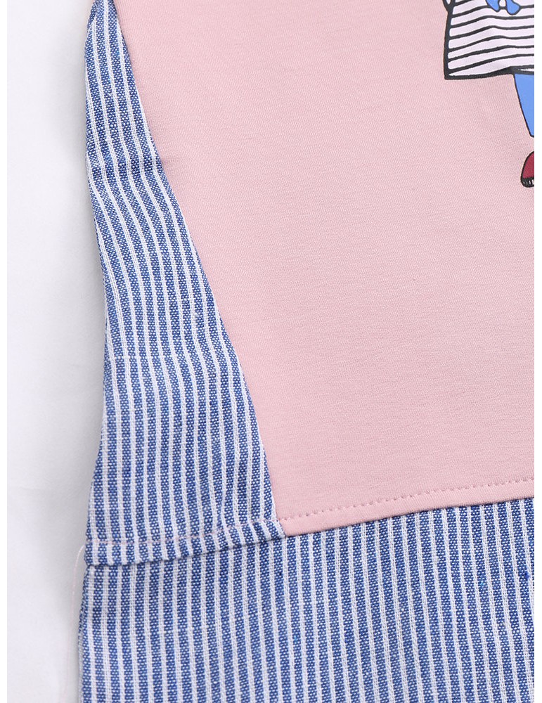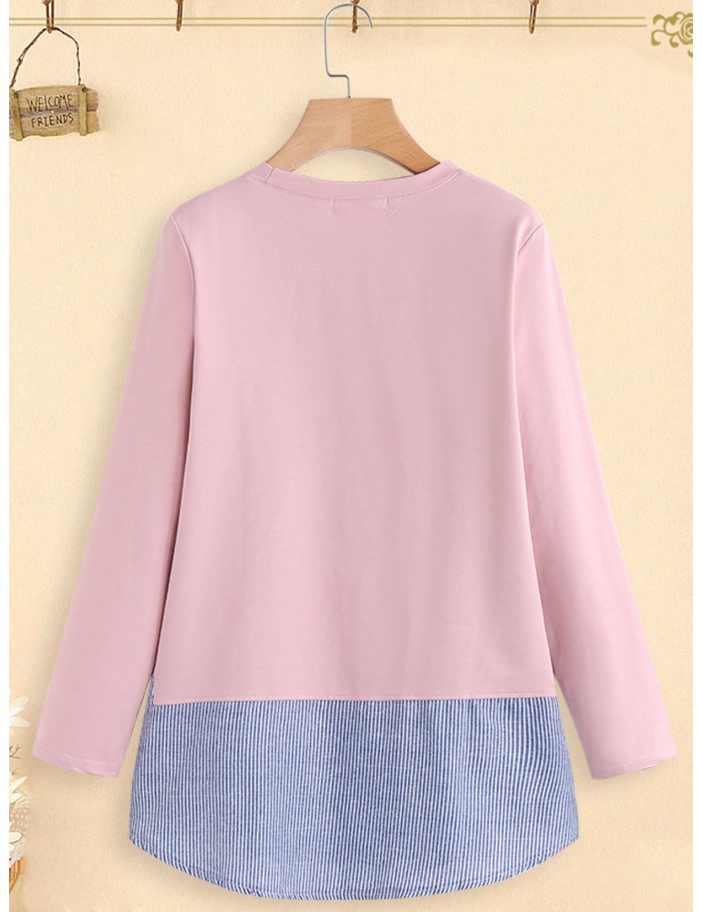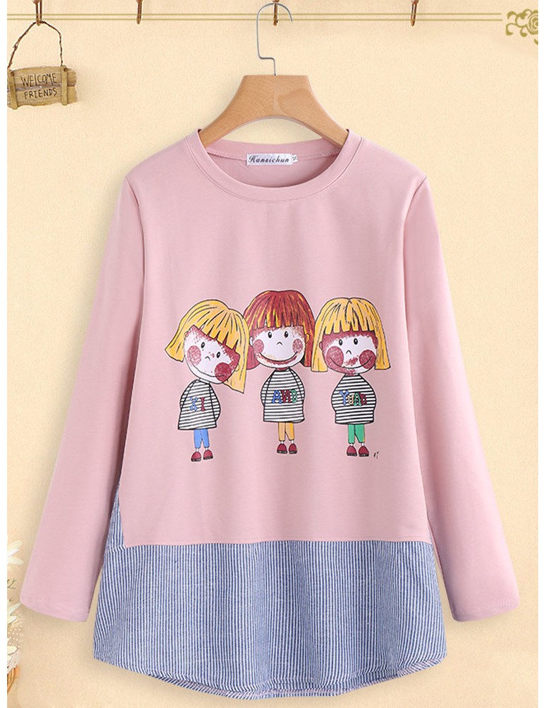 Cartoon Print Stripe Patchwork Long Sleeve Women T-shirt