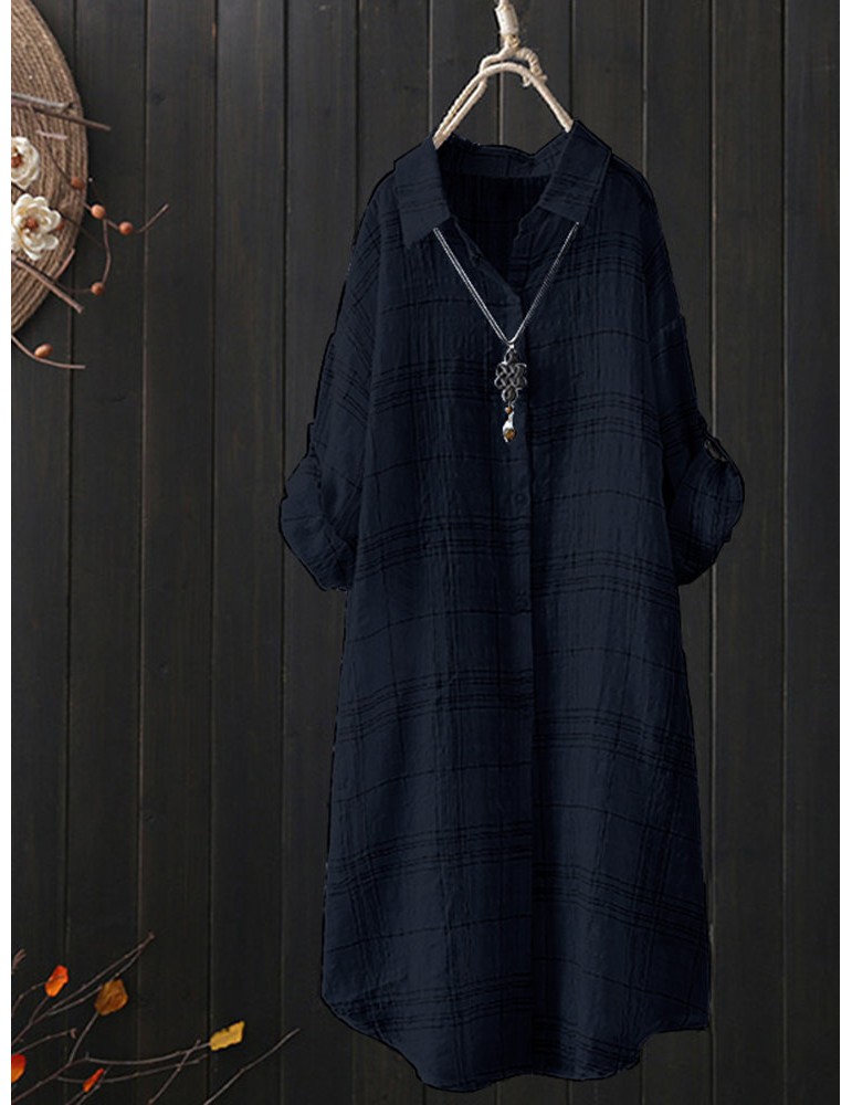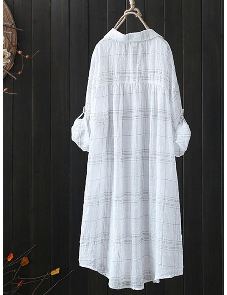 Women Loose Plaid Print Irregular Long Sleeve Casual Blouse
