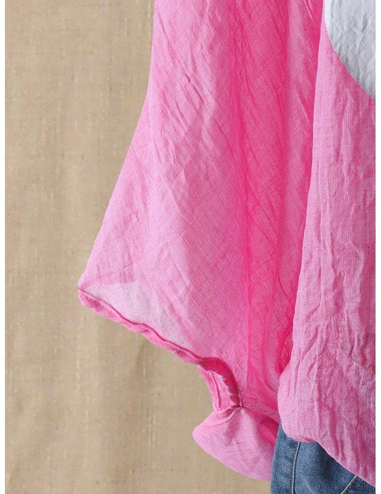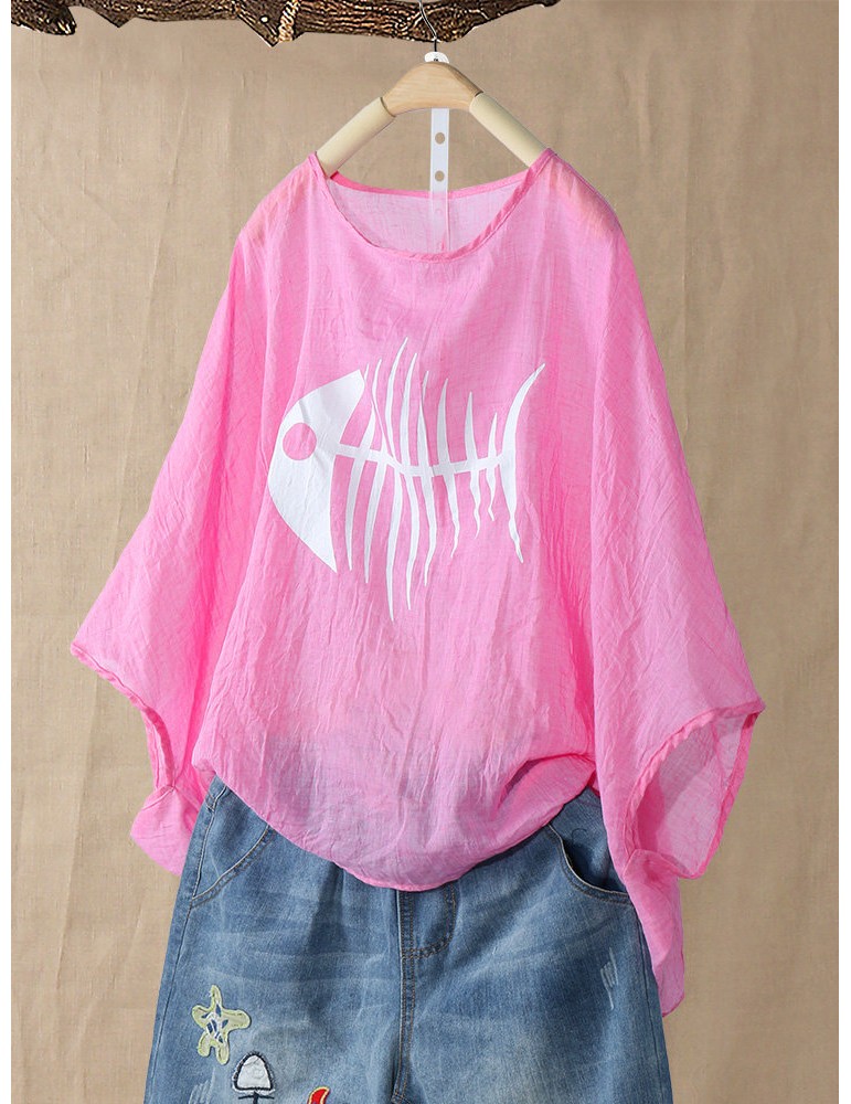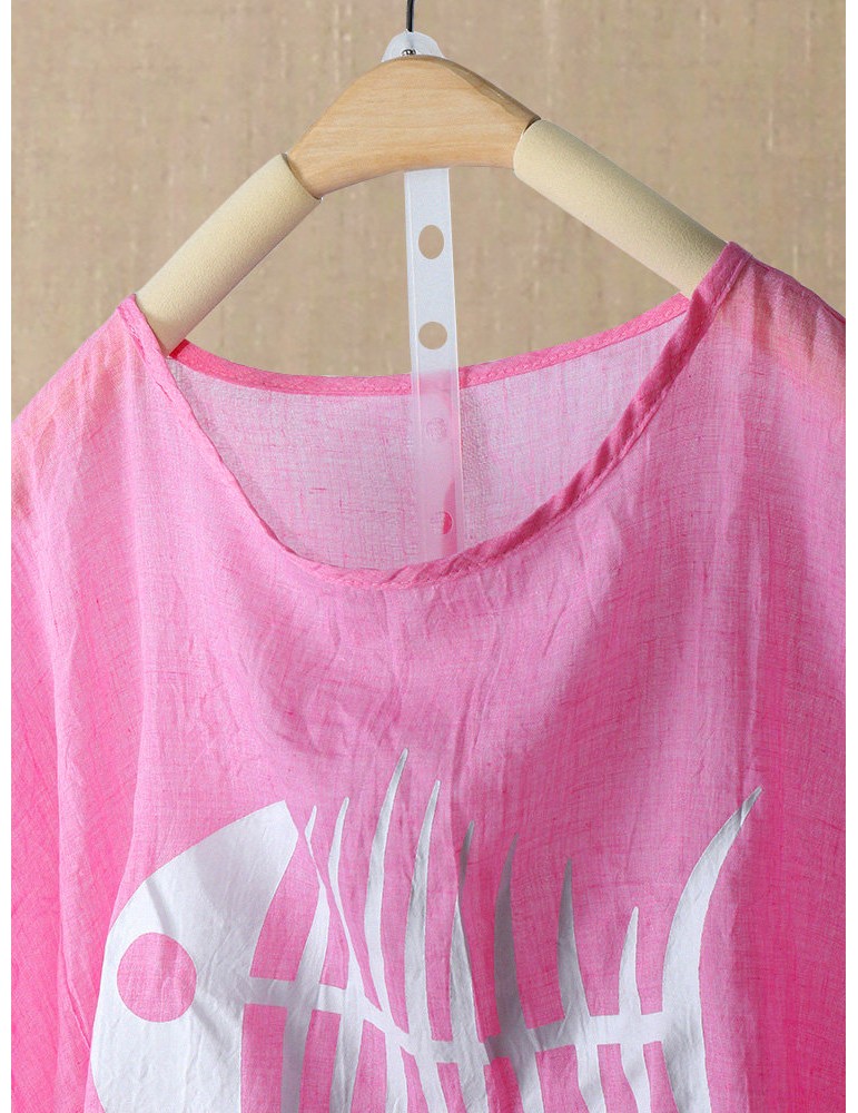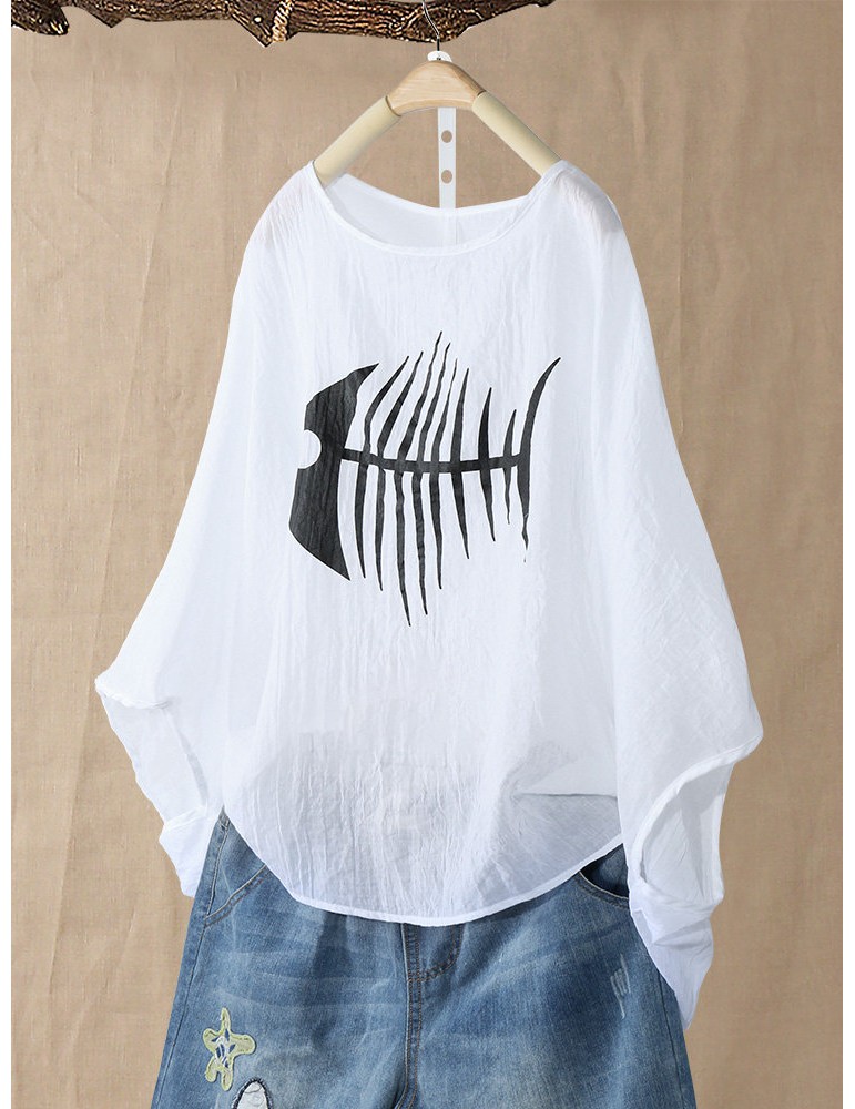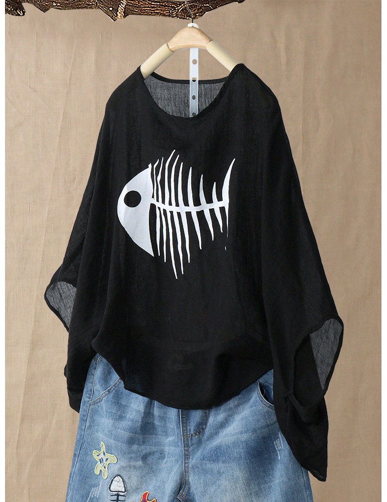 Casual Fish-bone Print 3/4 Sleeve Oversize T-Shirt