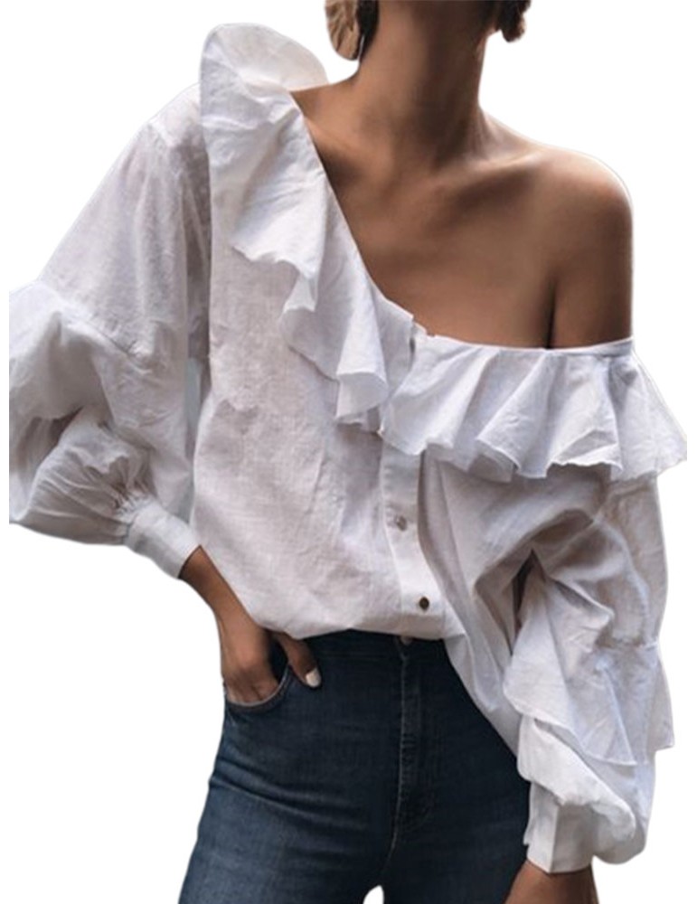 Chic Skew Collar Bishop Long Sleeve Button Blouse