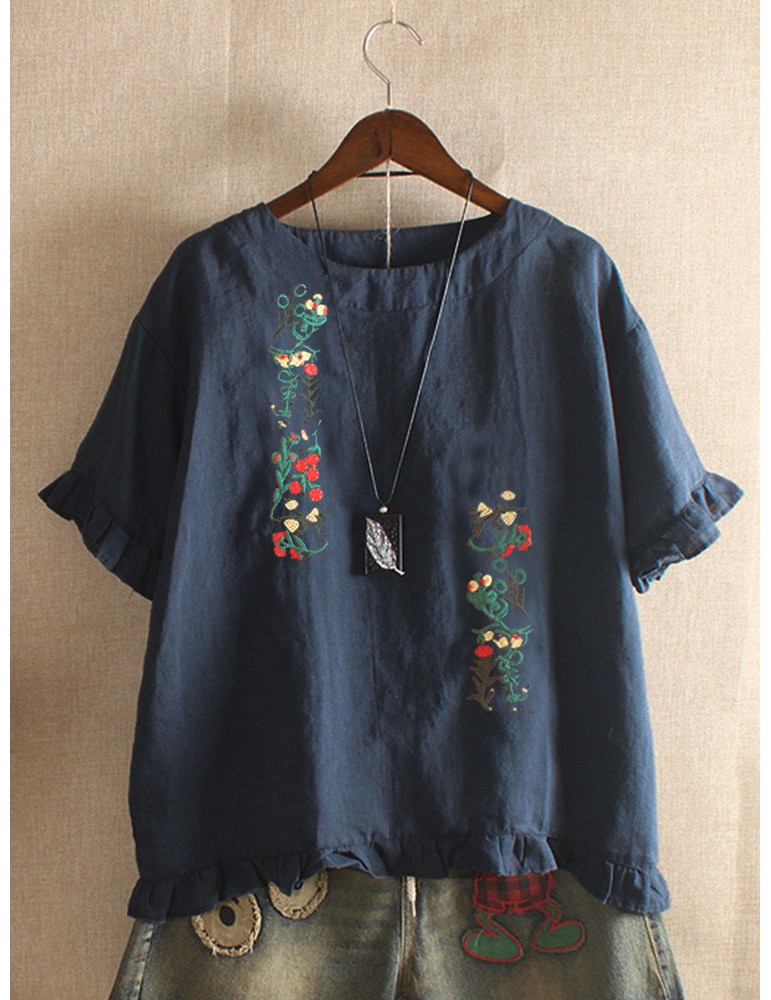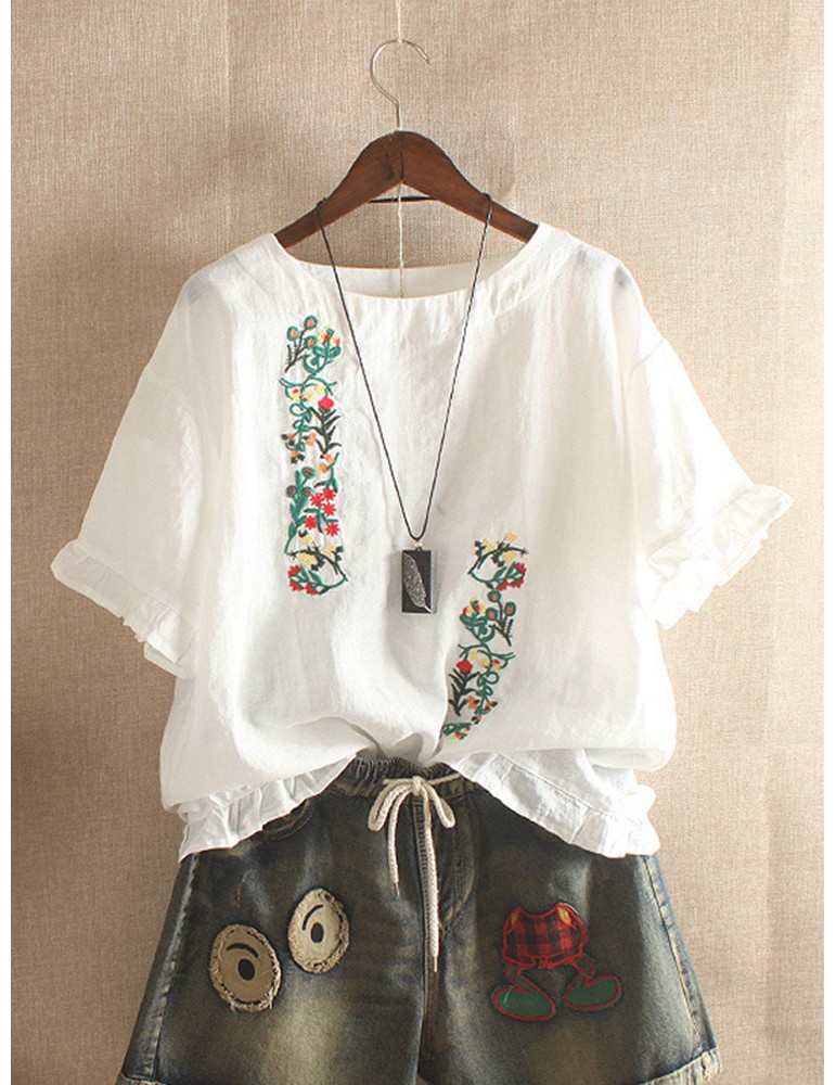 Embroidery Stringy Selvedge Short Sleeve Vintage Blouse