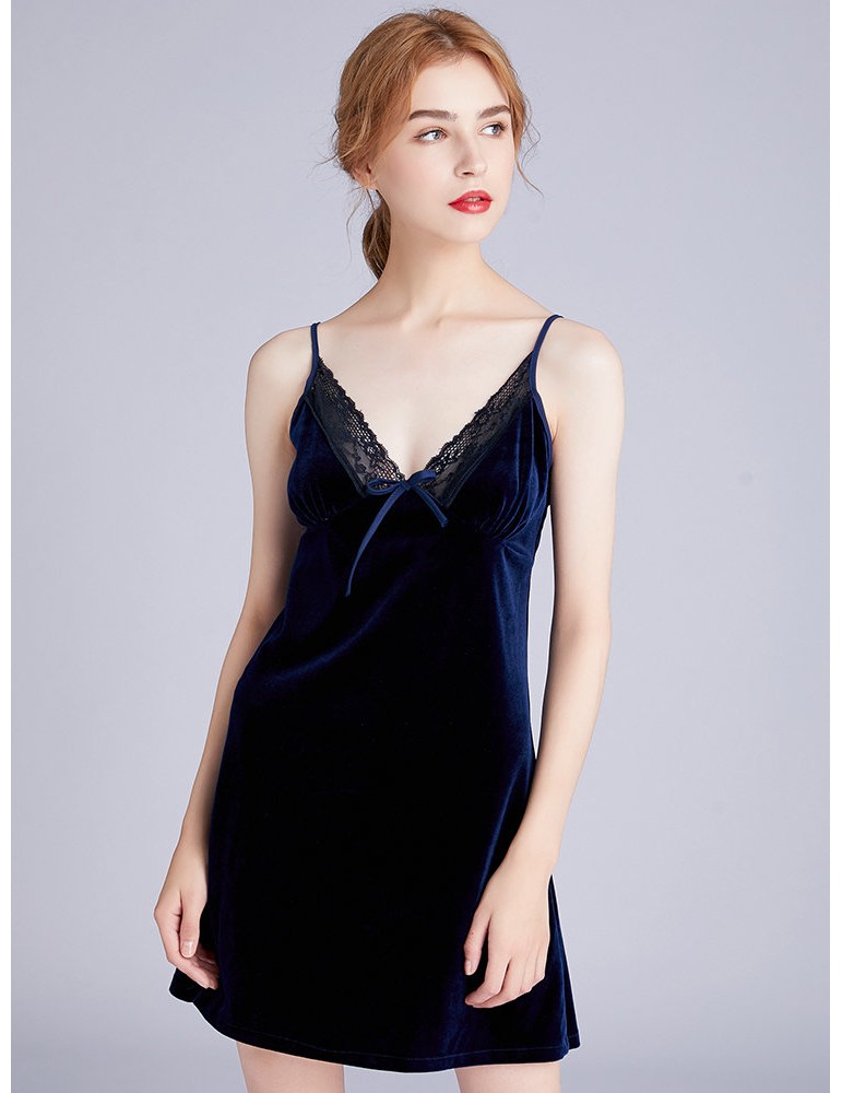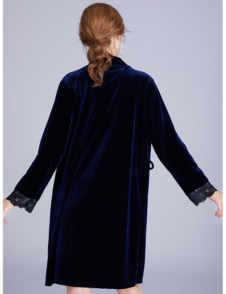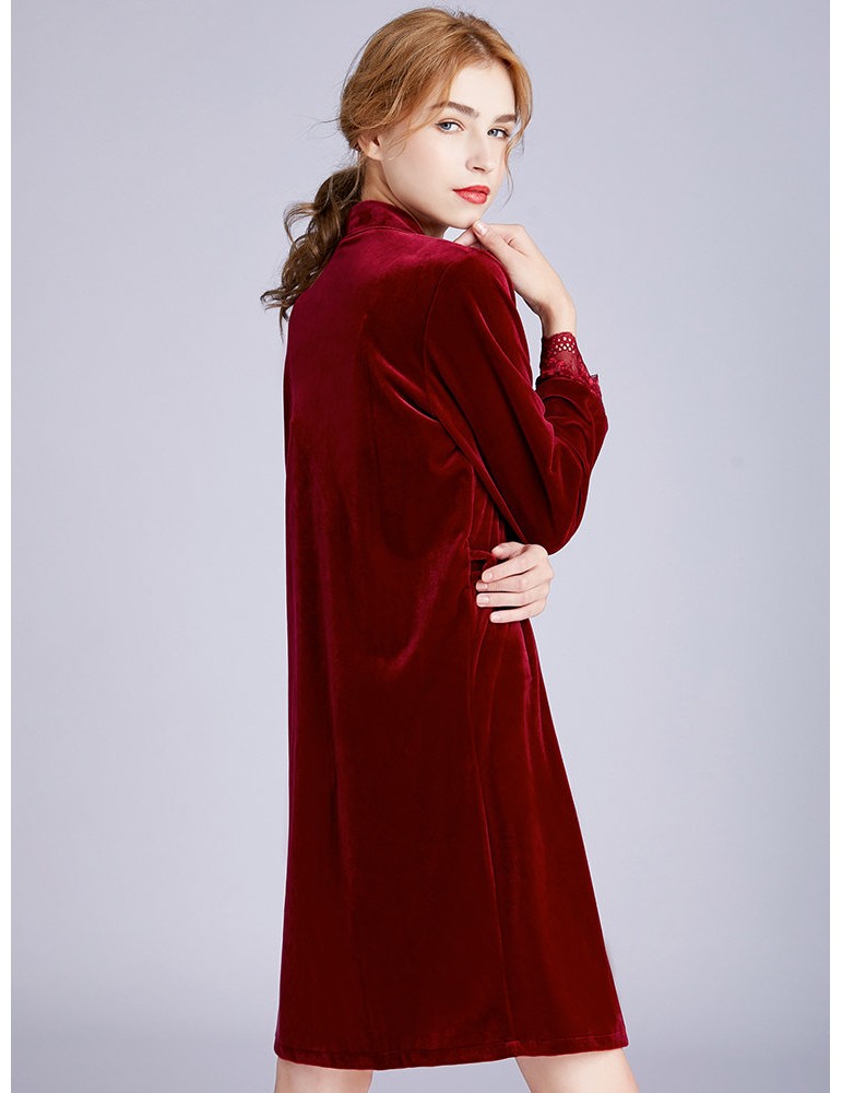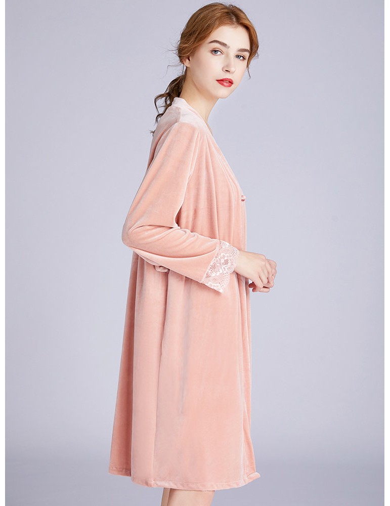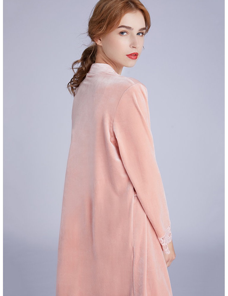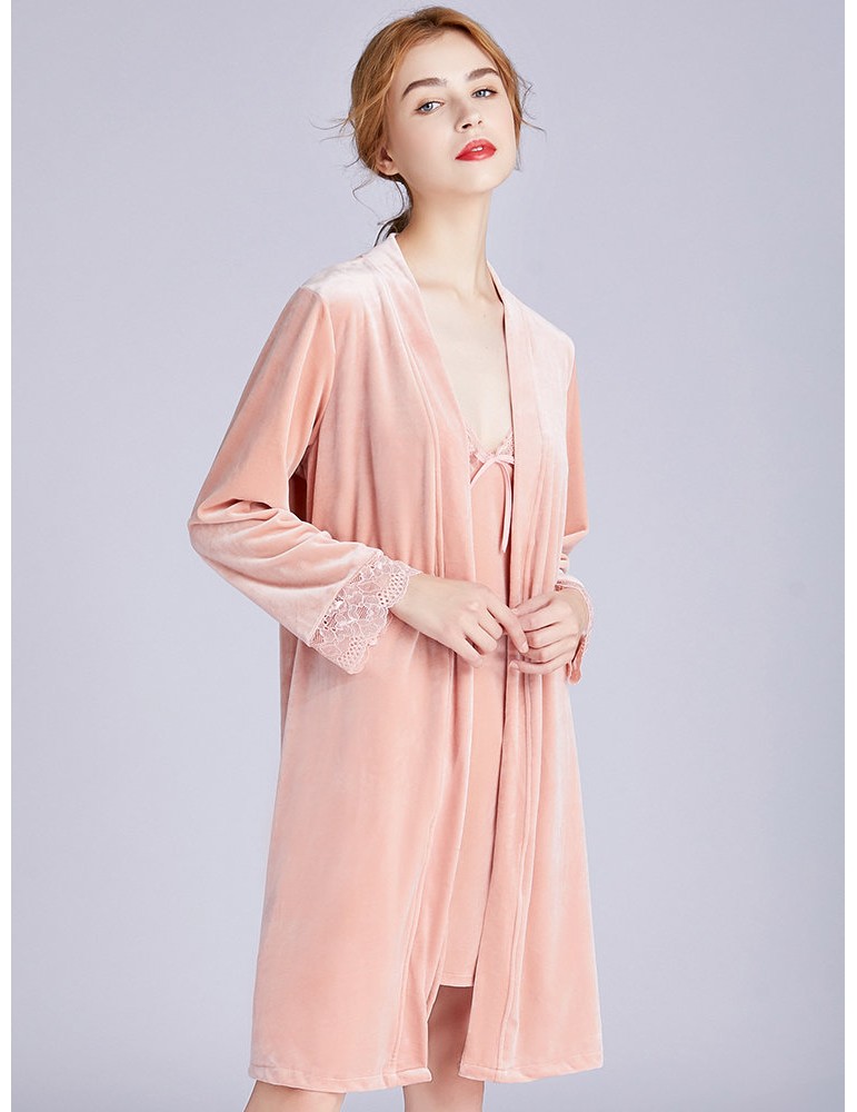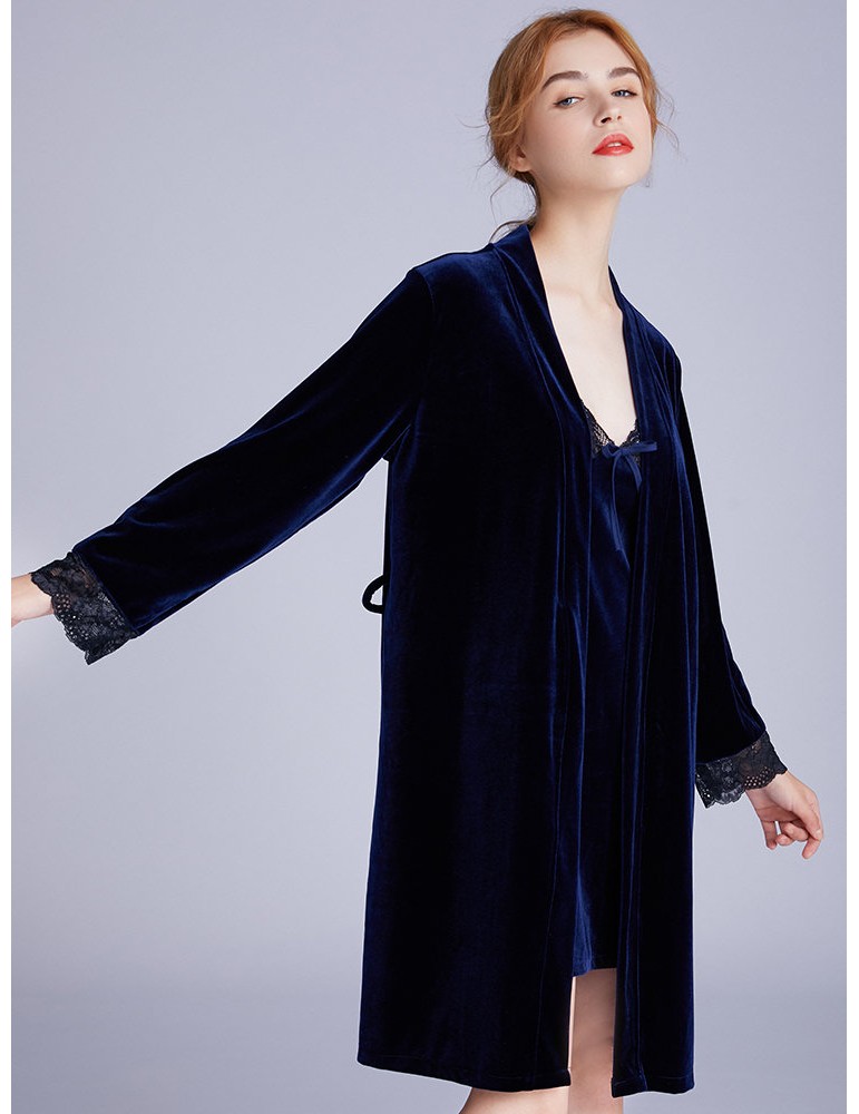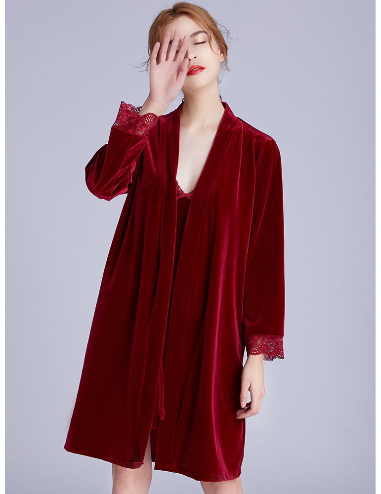Velvet Long Sleeves Red Robe With Sling Lace Patchwork Soft Pajamas Two Pieces