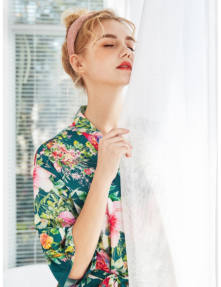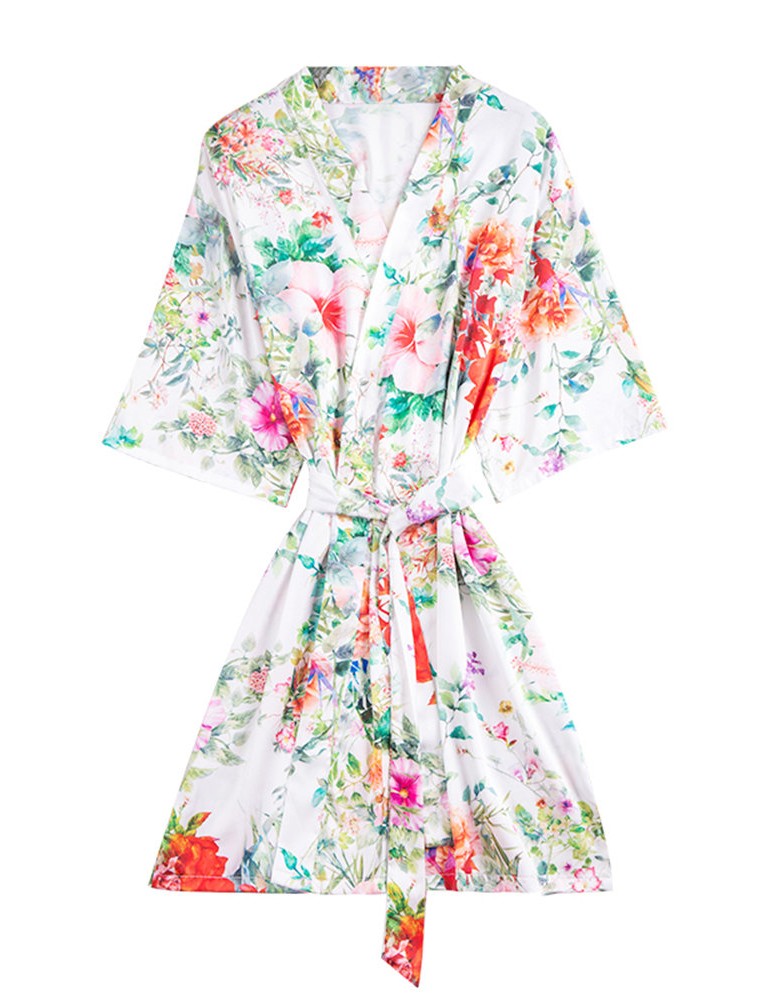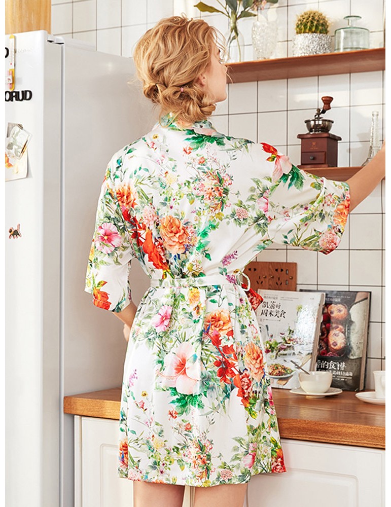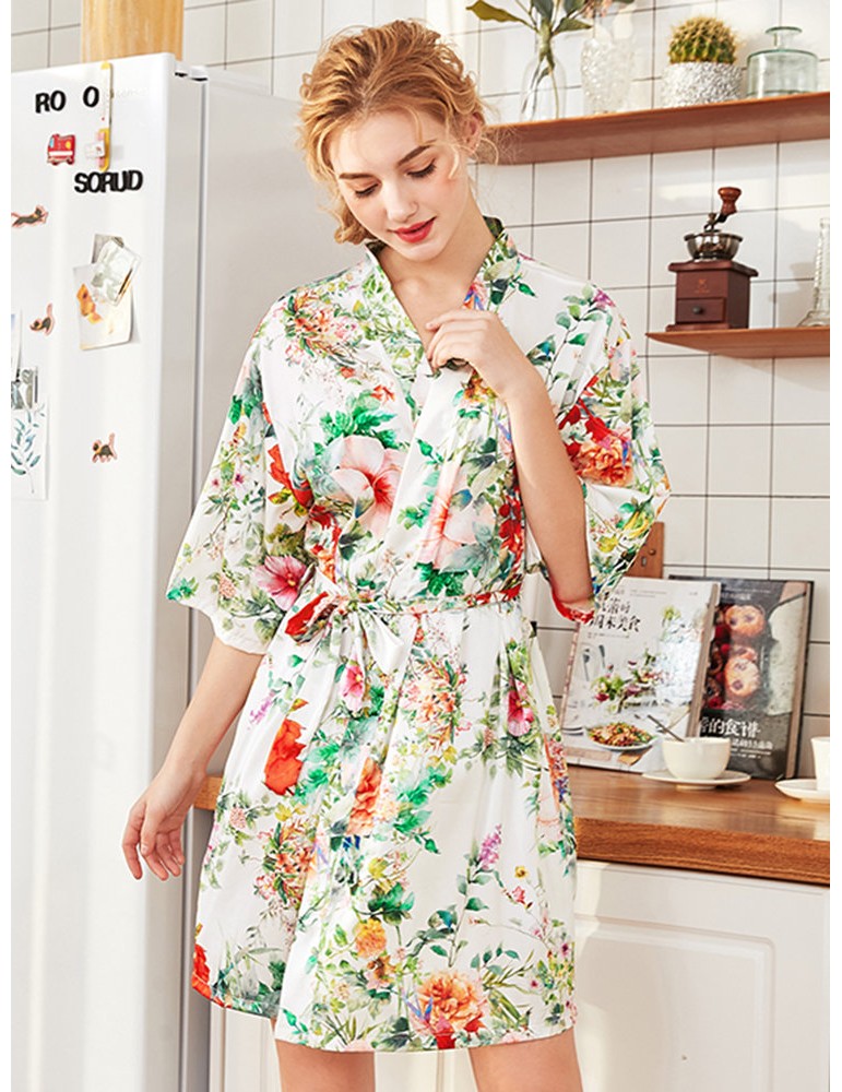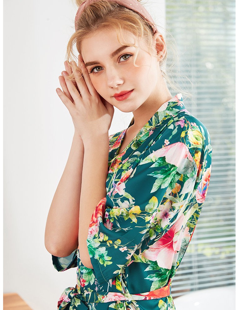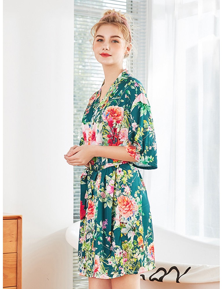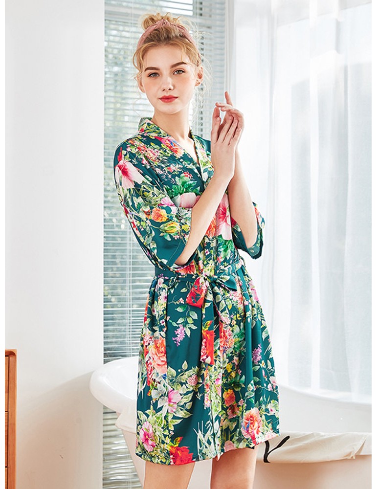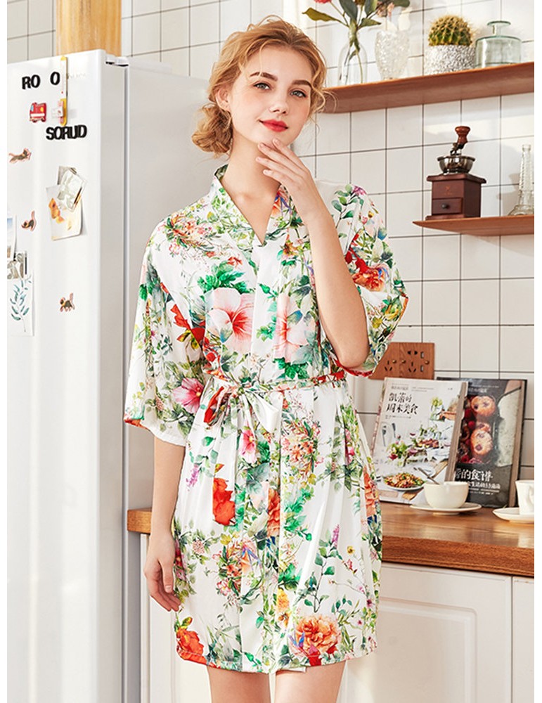 Home Pajamas Silk Robe Floral Print V-Neck Knee Loose Sleepwear