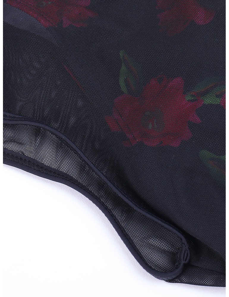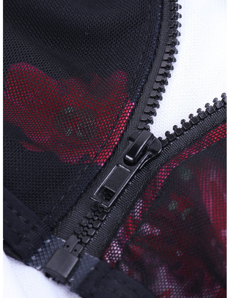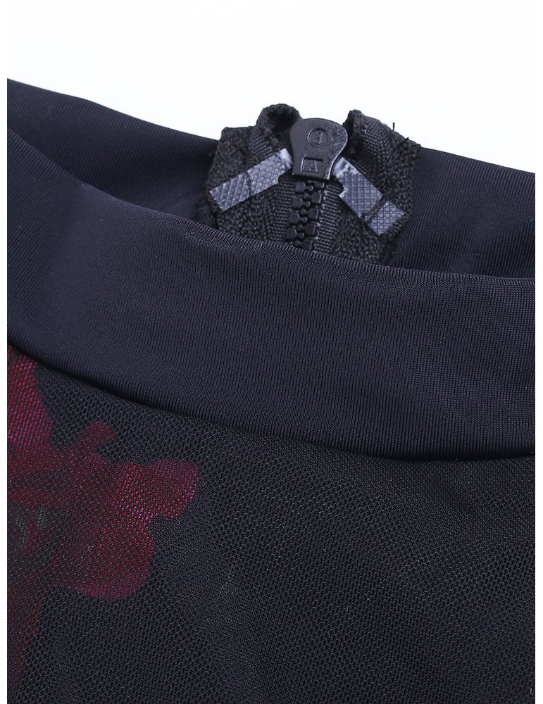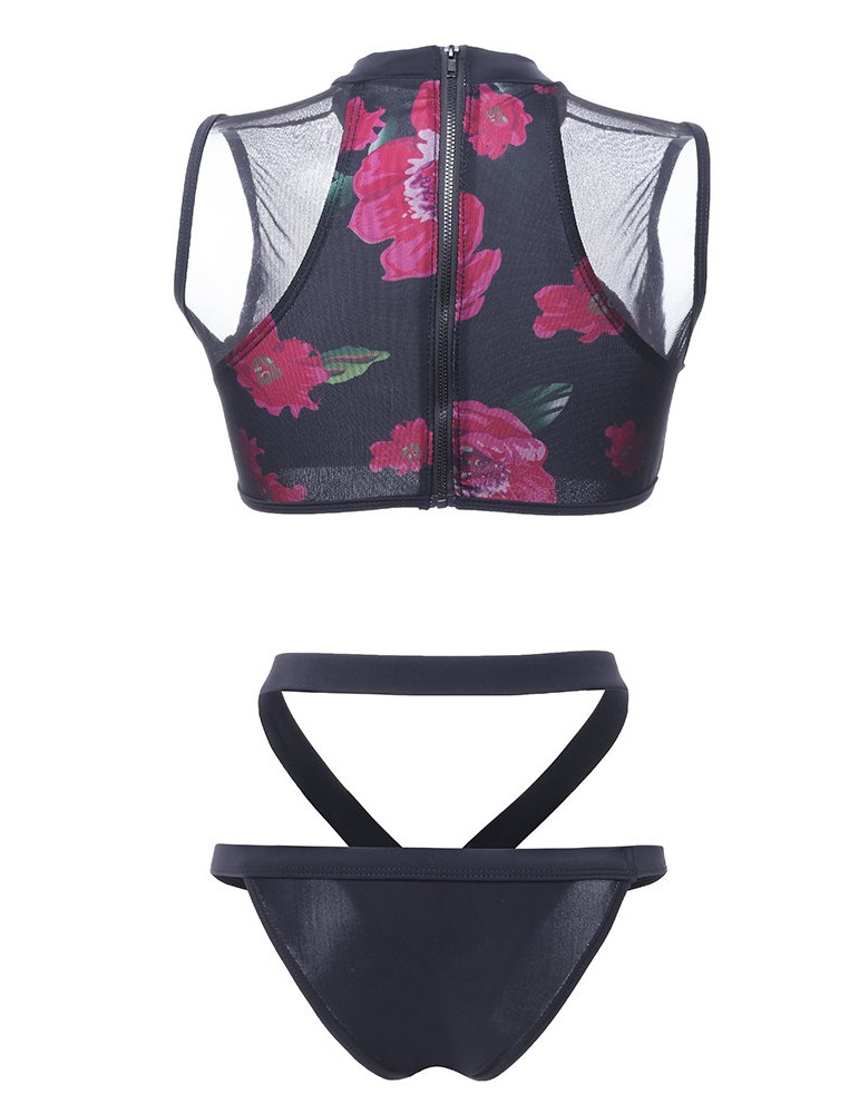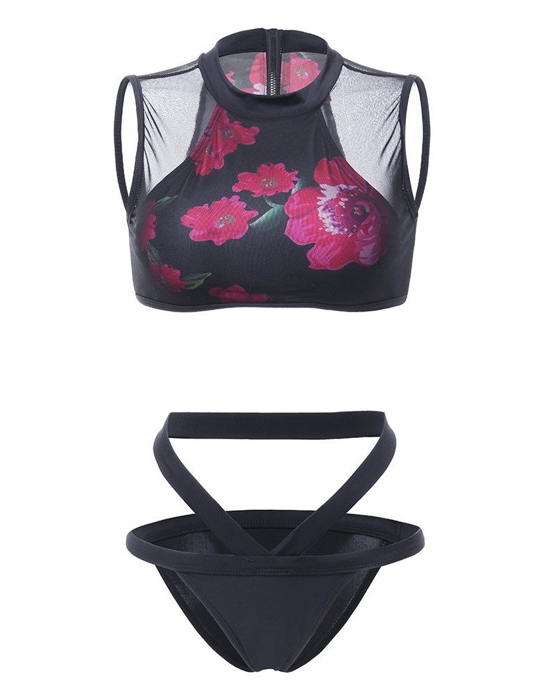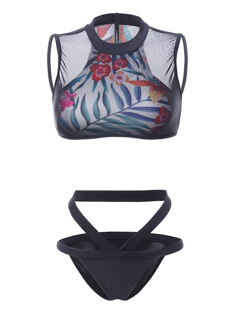 Sexy High Neck Printing Mesh Zipper Strappy Hollow Tankinis Swimwear