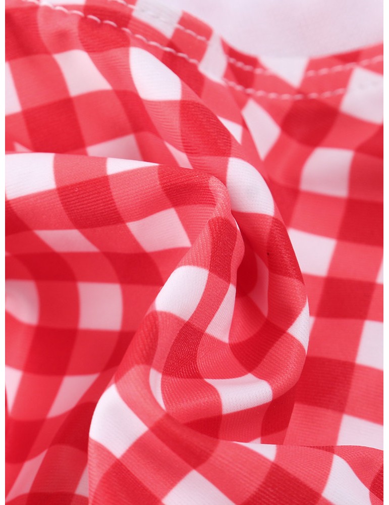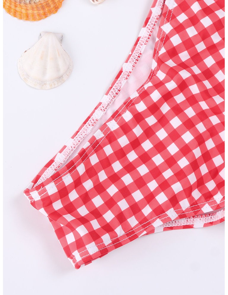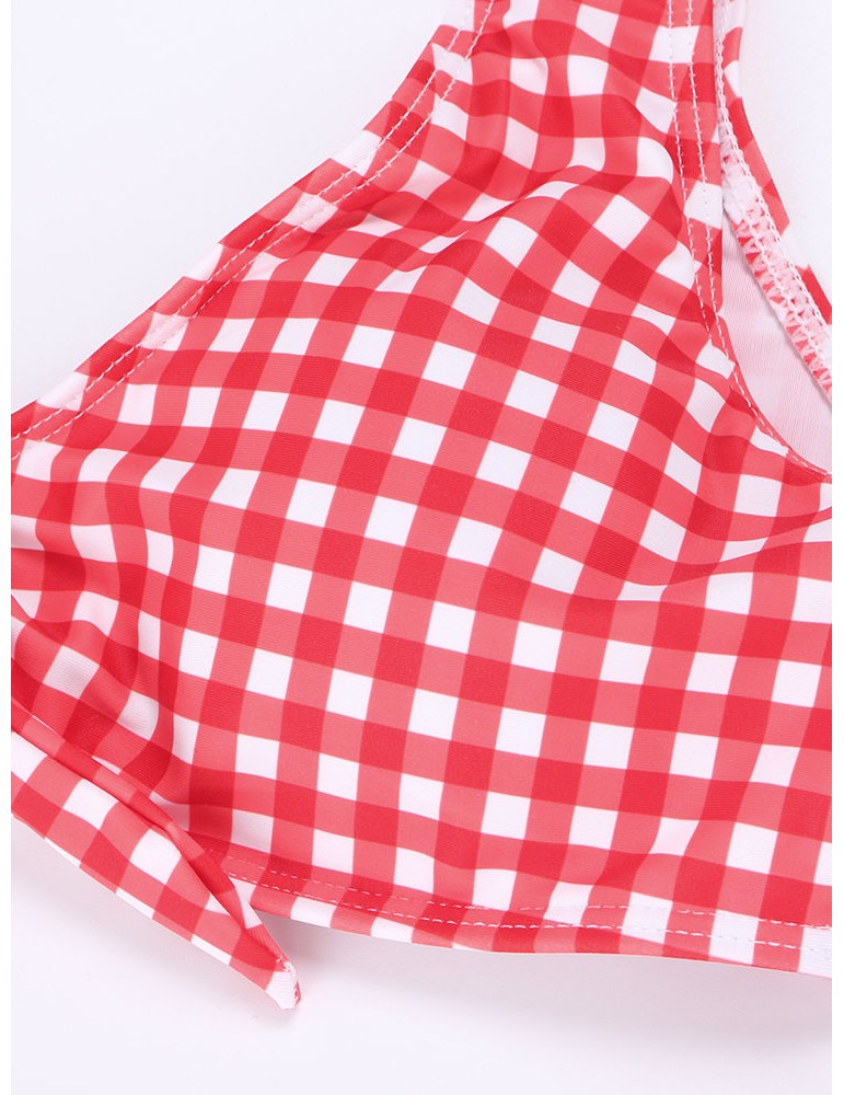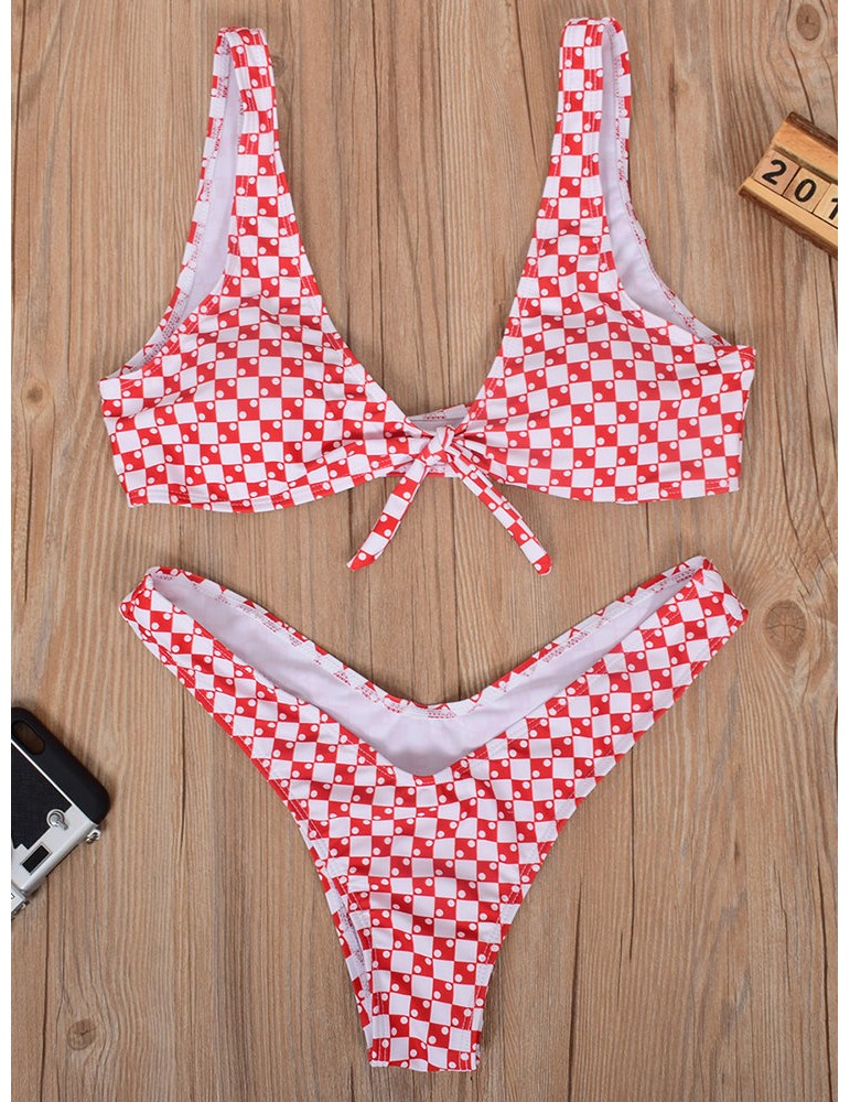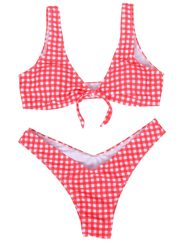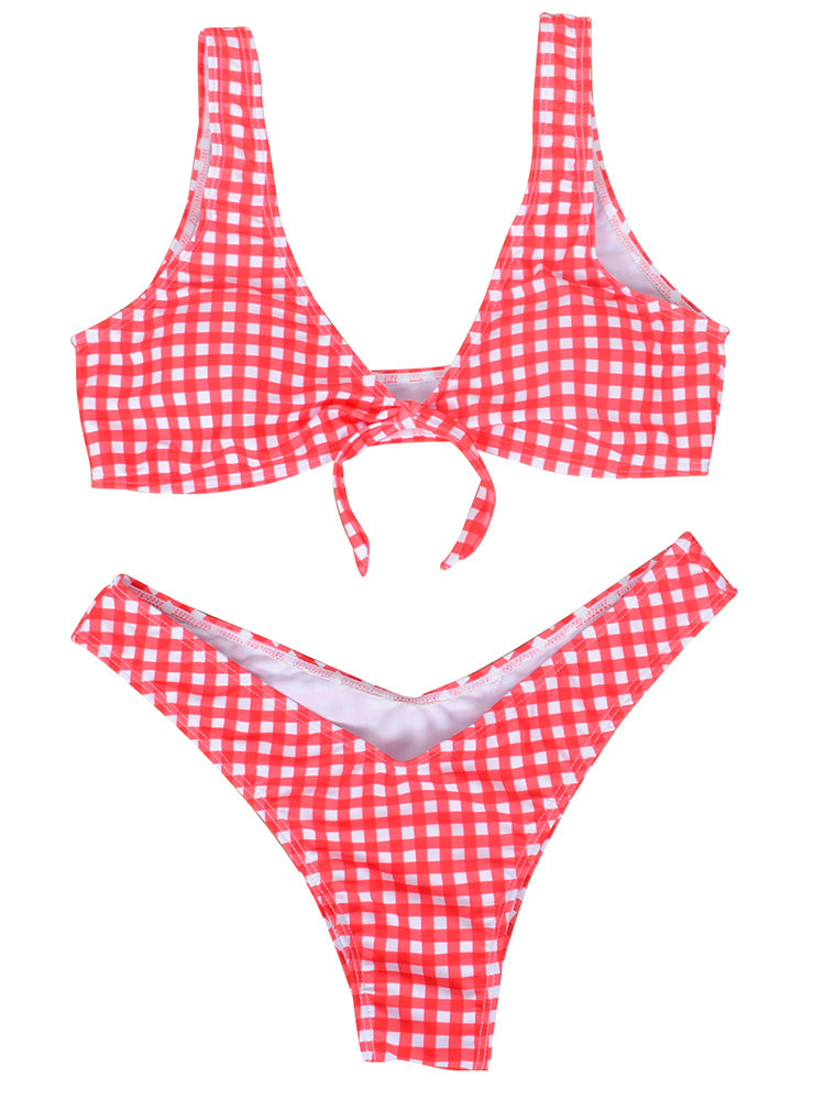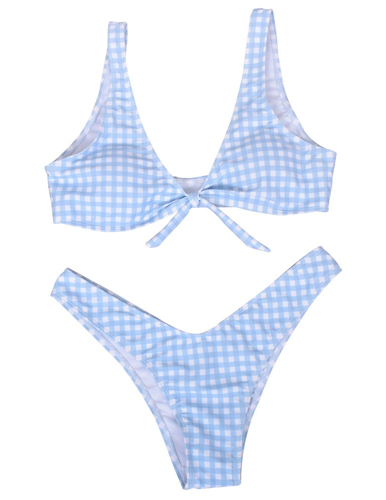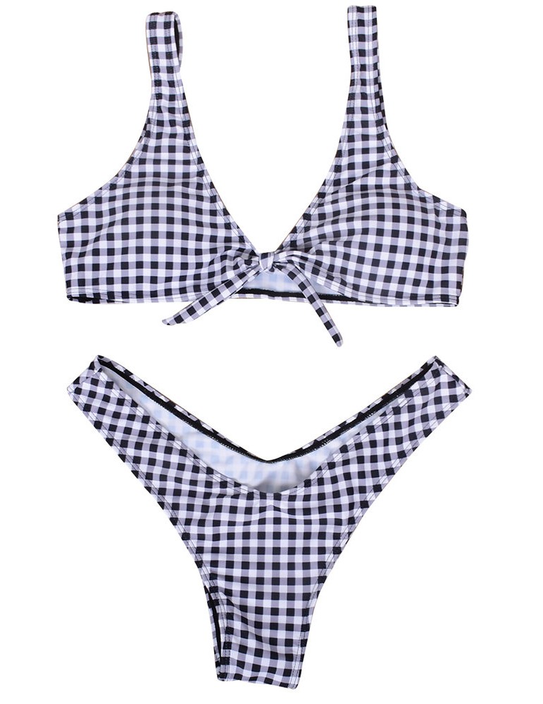 Lacing Bow Plaid Deep V String Bikini Sets Swimwear For Women