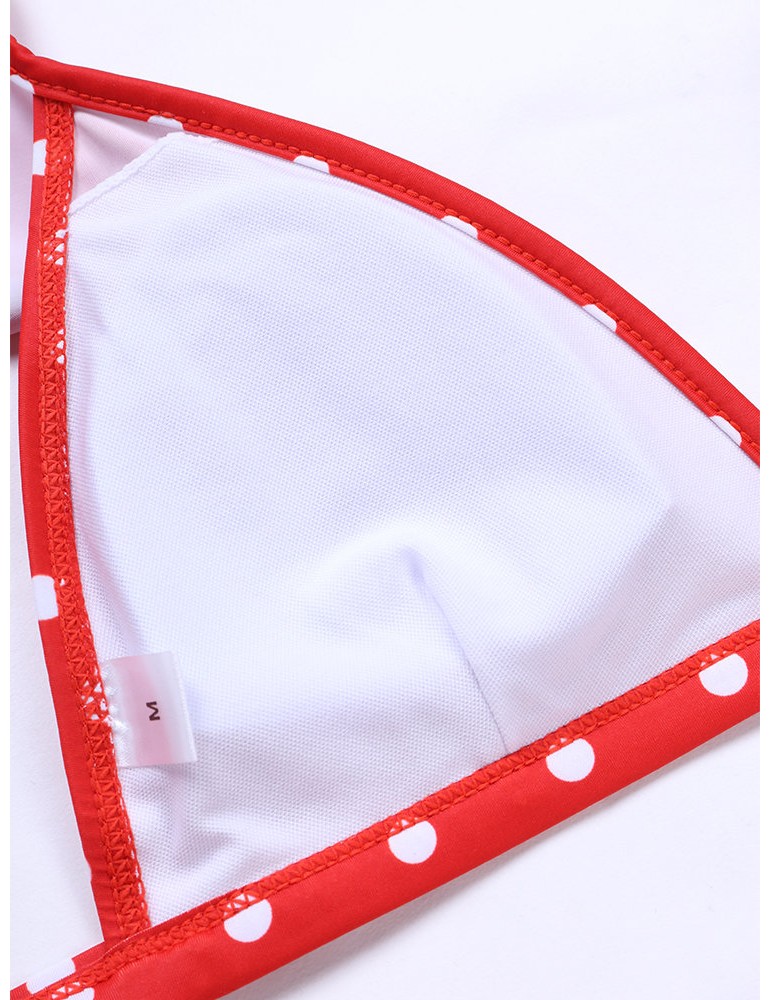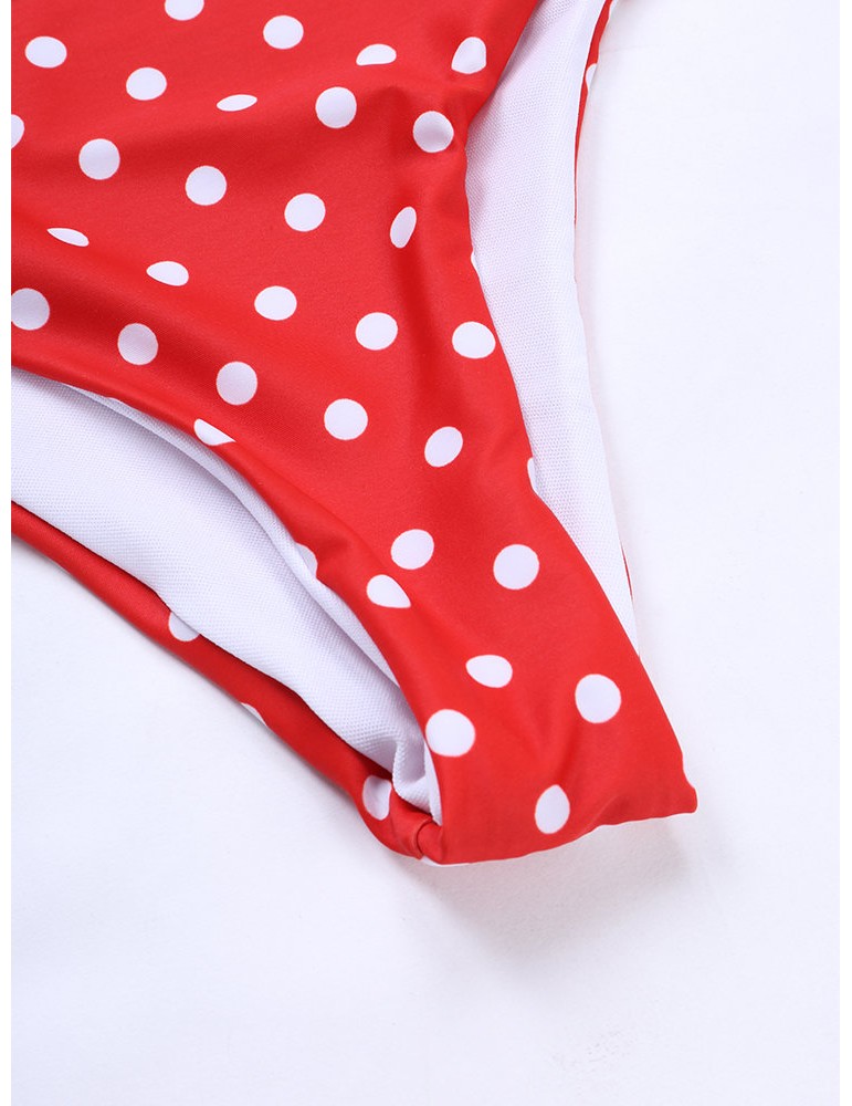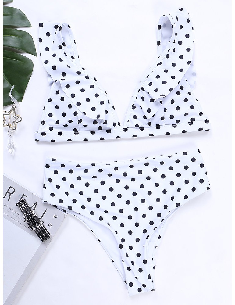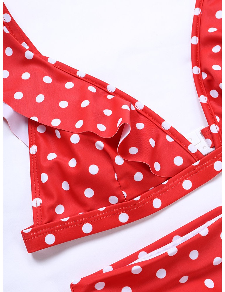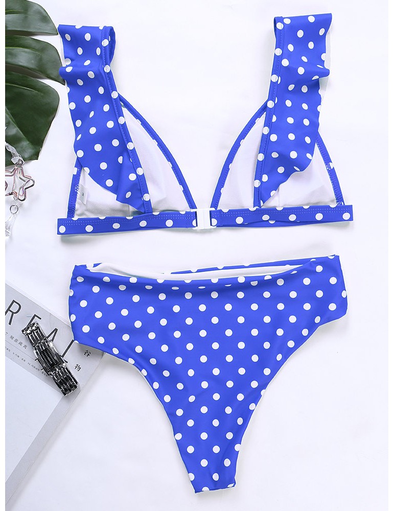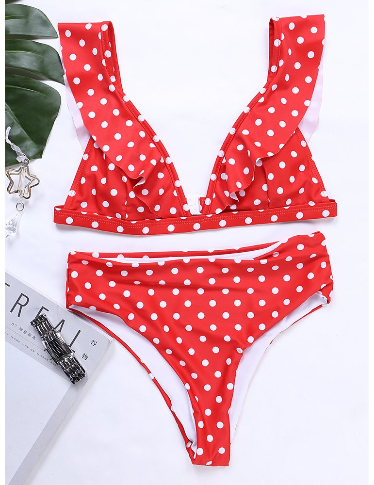 Lotus Leaf Polka Dot Deep V Sexy Elastic Backless Bikinis Swimwear For Women