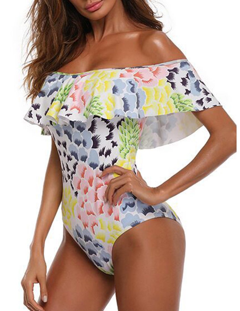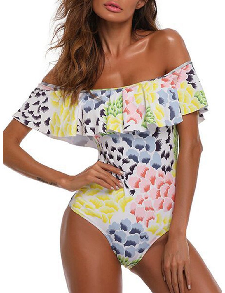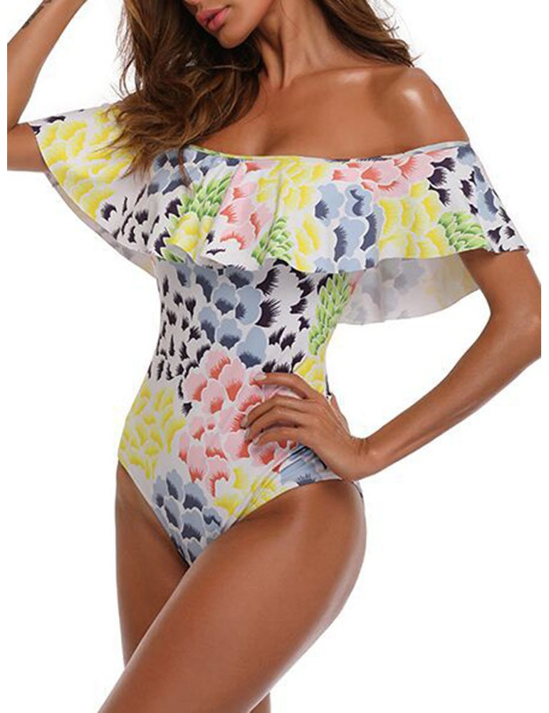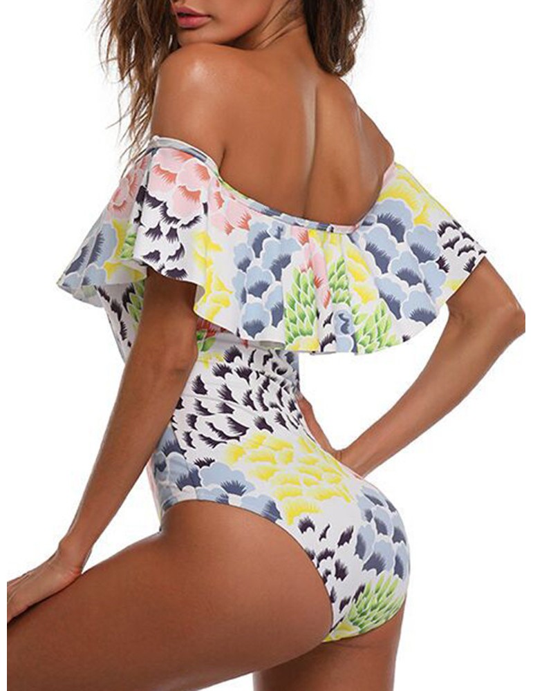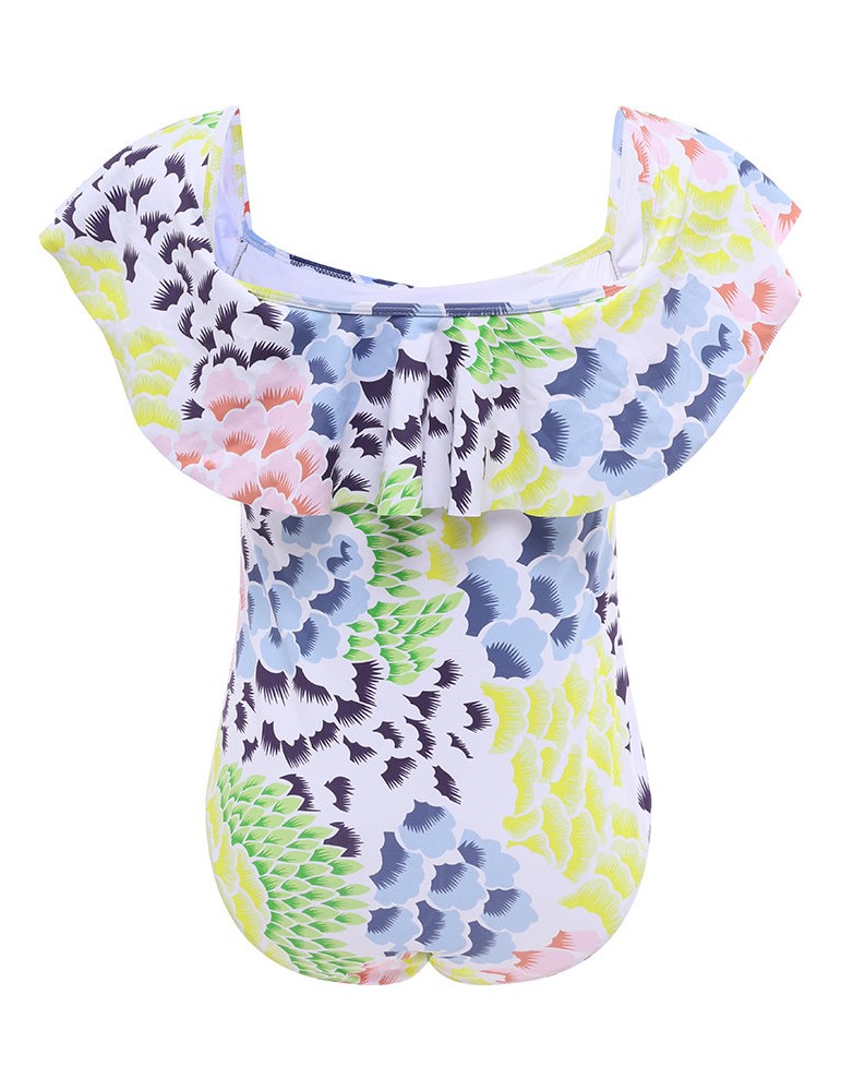 Floral Printed Lotus Leaf Word Shoulder One Piece Swimwear Swimsuit For Women