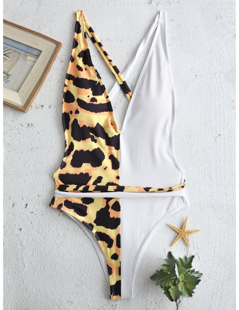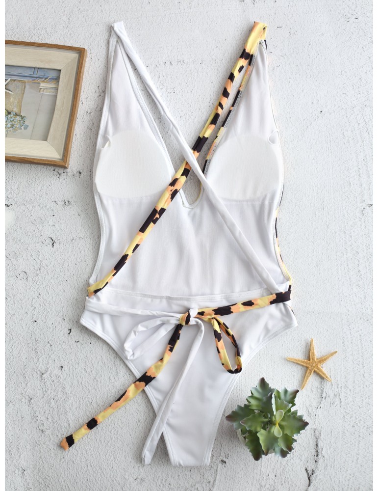 Leopard Print Slimming One Piece Patchwork Tie Belt Backless Sexy Women Swimwear