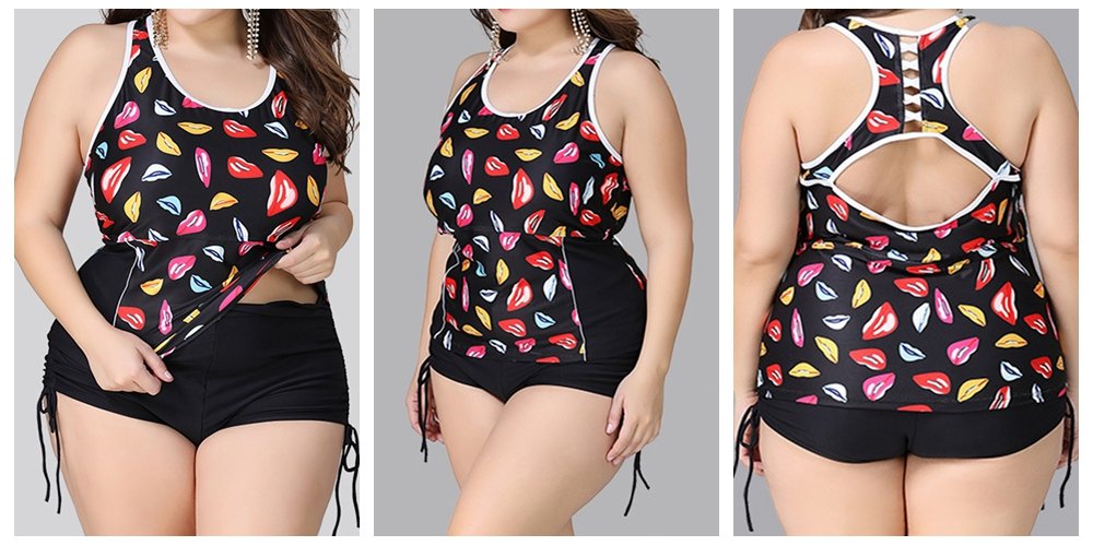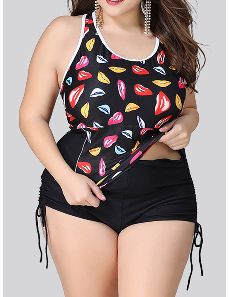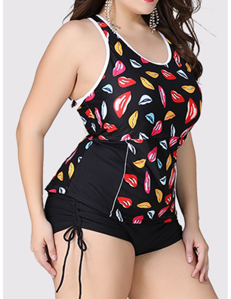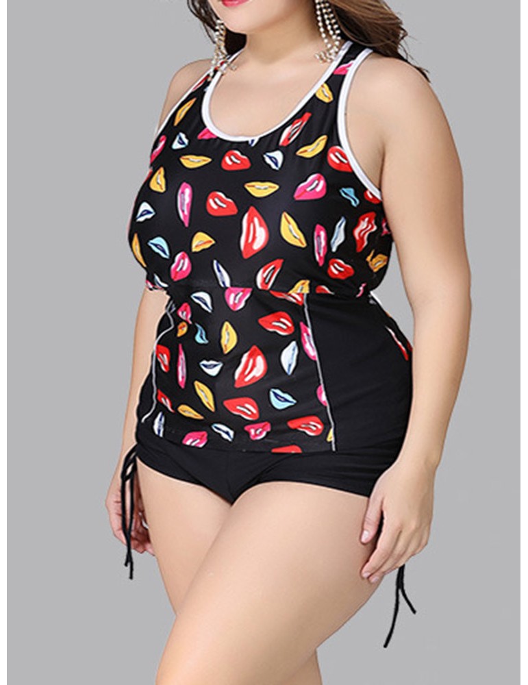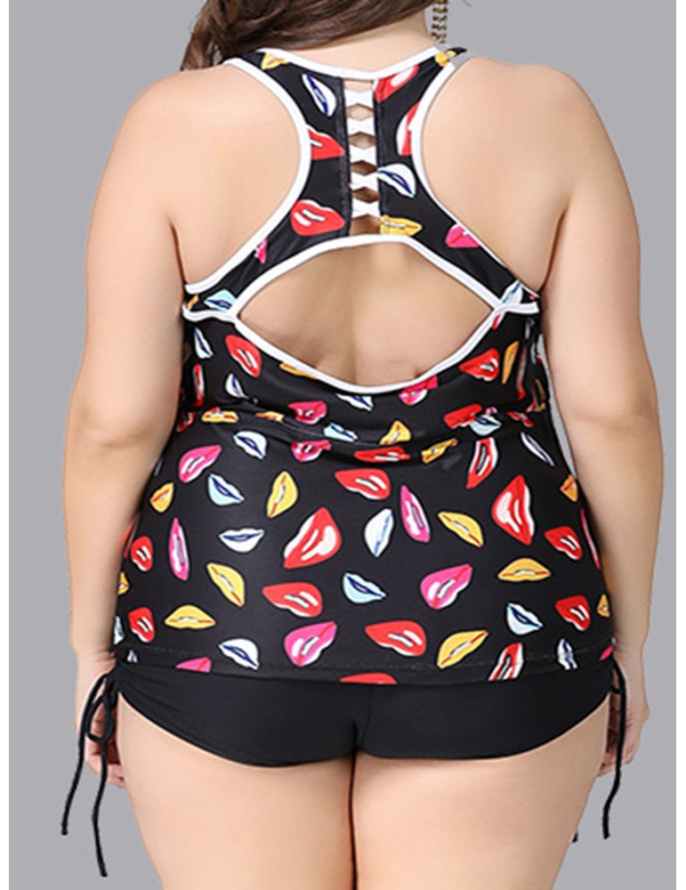 Plus Size Kiss Printed Hollow Out String Adjustable Vest Sports Tankinis Swimsuits For Women
