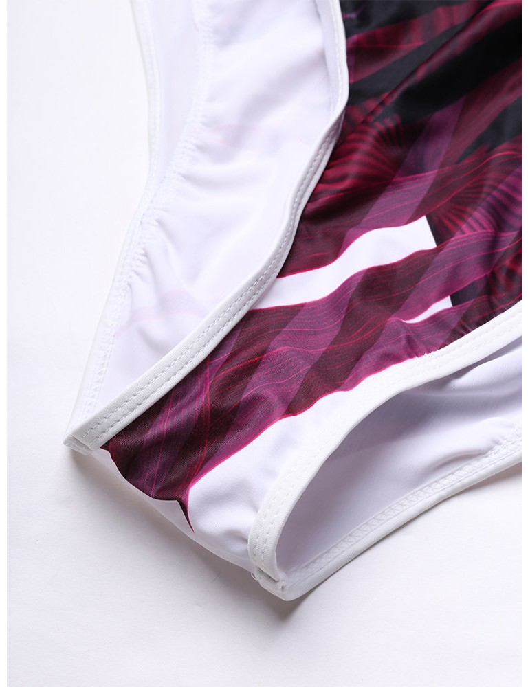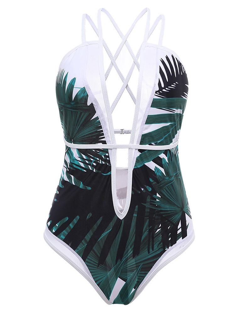 Sexy Deep V Palm Leaf Printed Strappy Back Monokini Swimsuit For Women