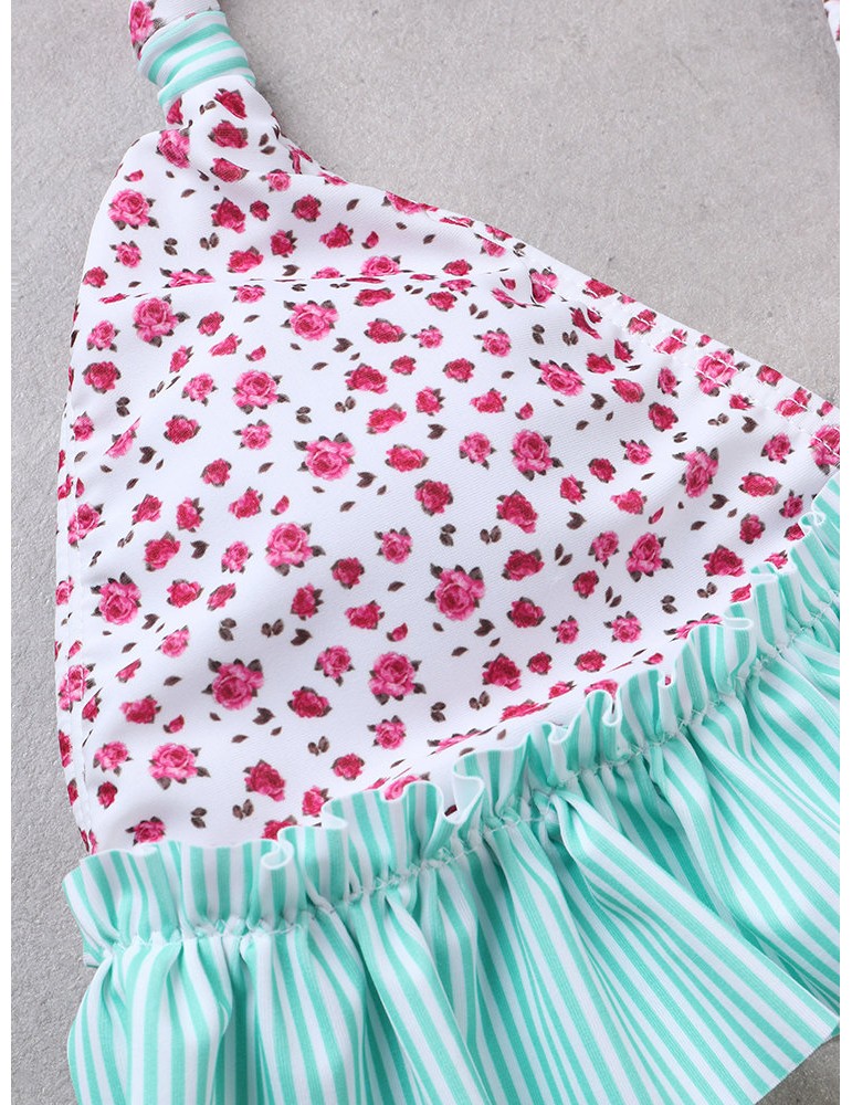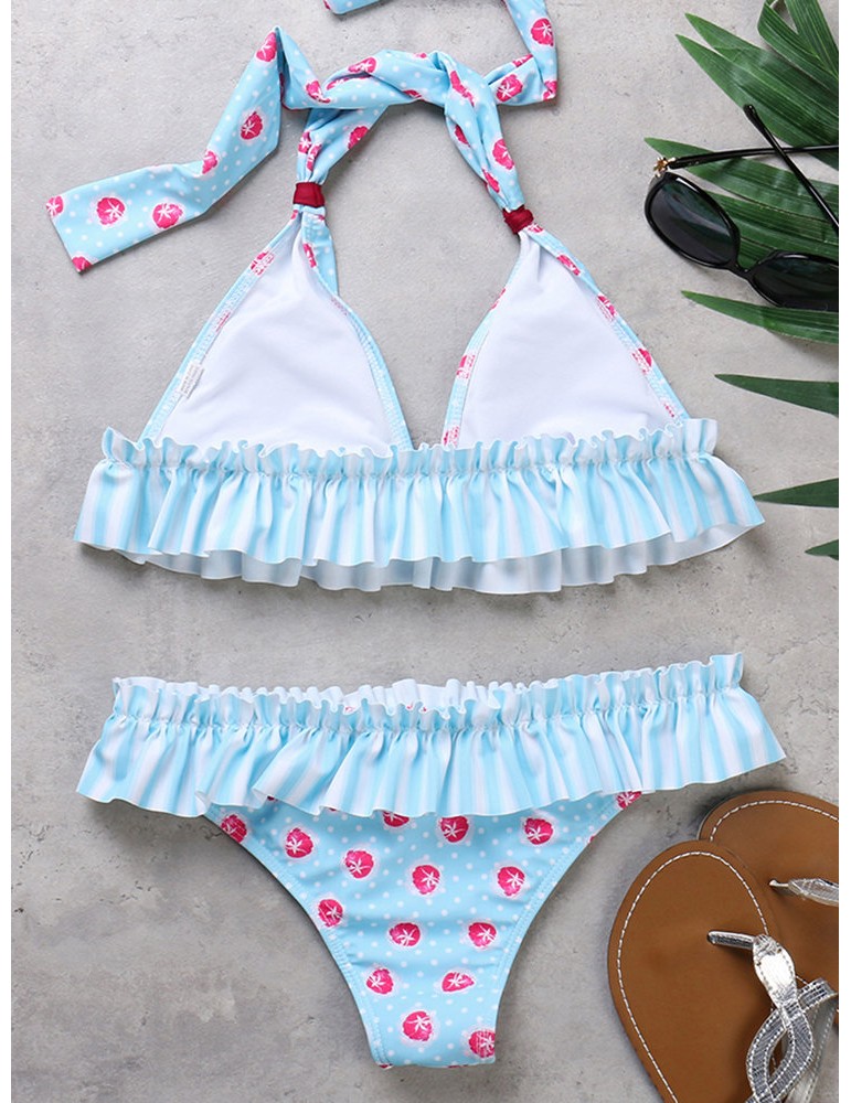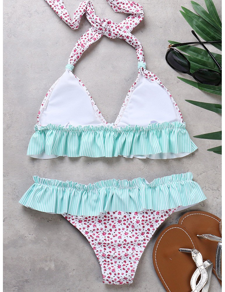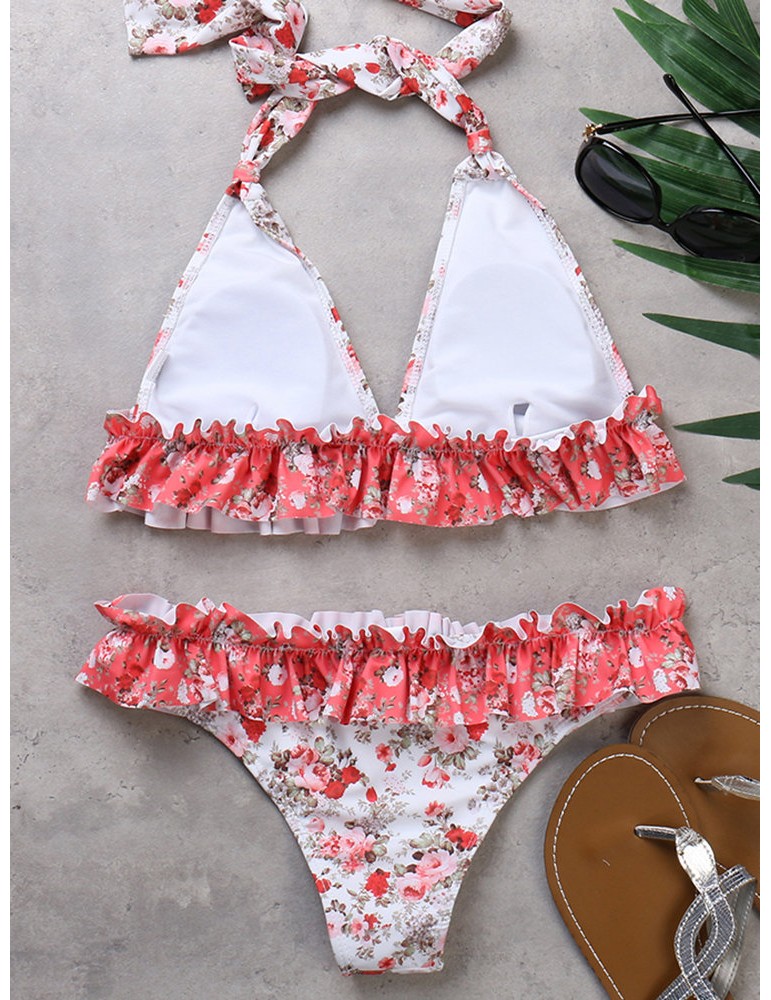 Plus Size Sexy Flounce Printed Halter String Backless Bikinis Swimsuits For Women