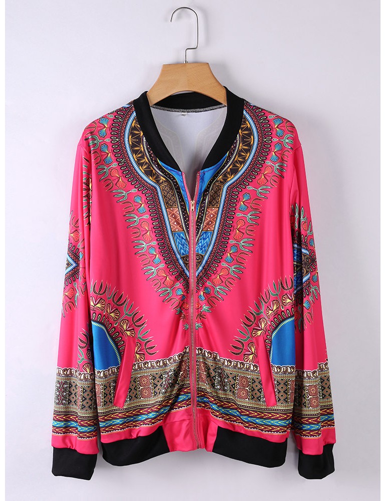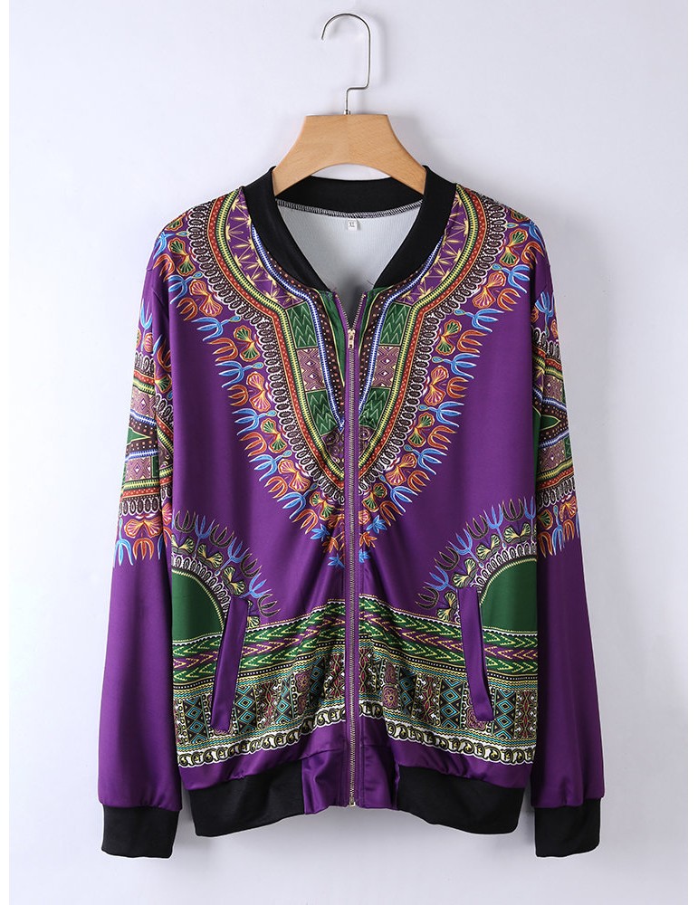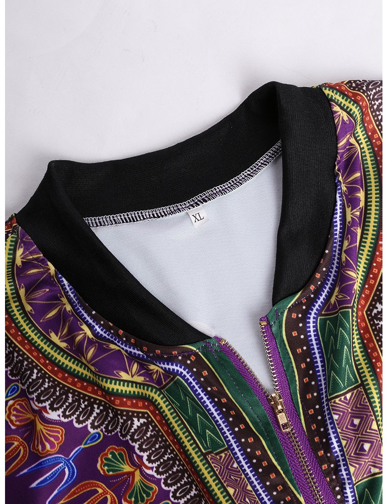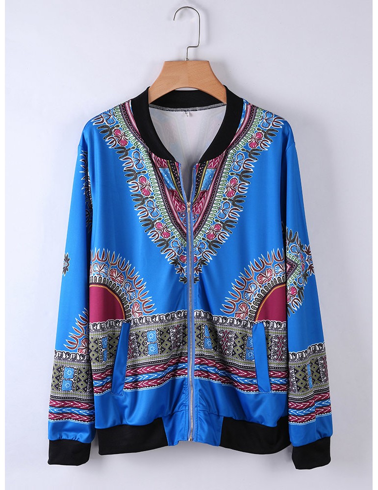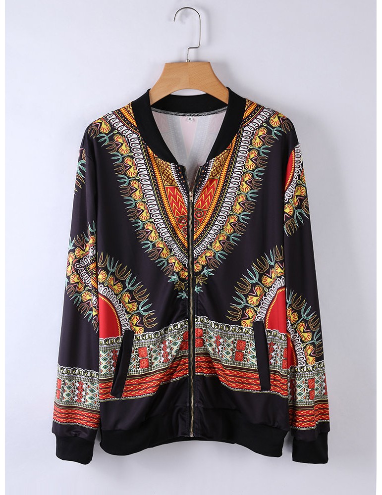 Ethnic Printed Long Sleeve Zipper Fly Thin Jackets
