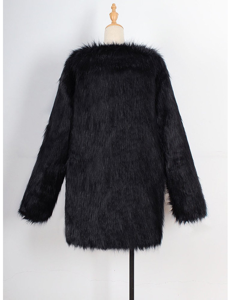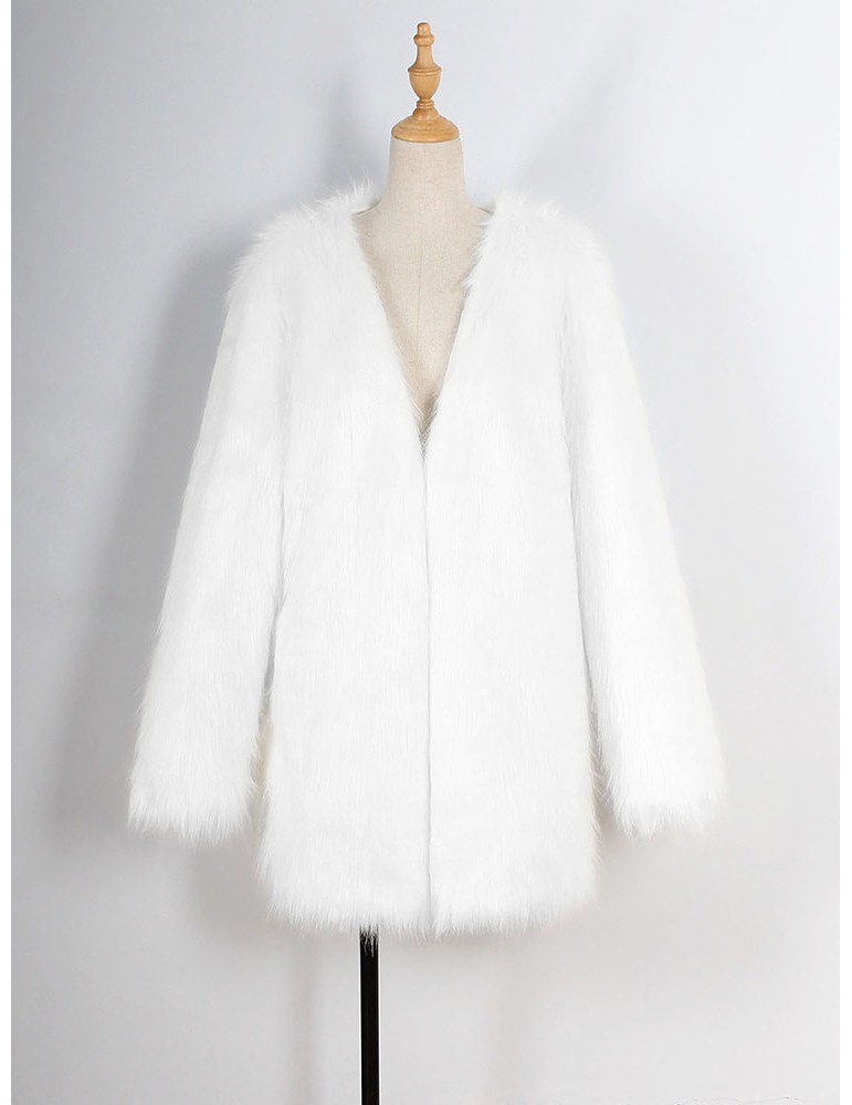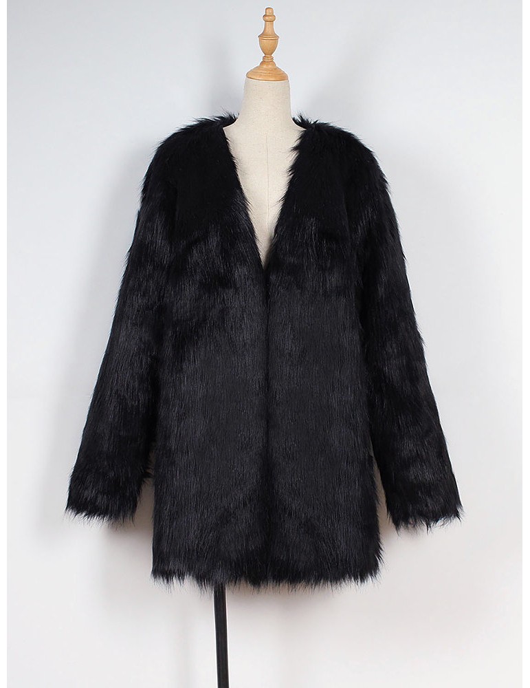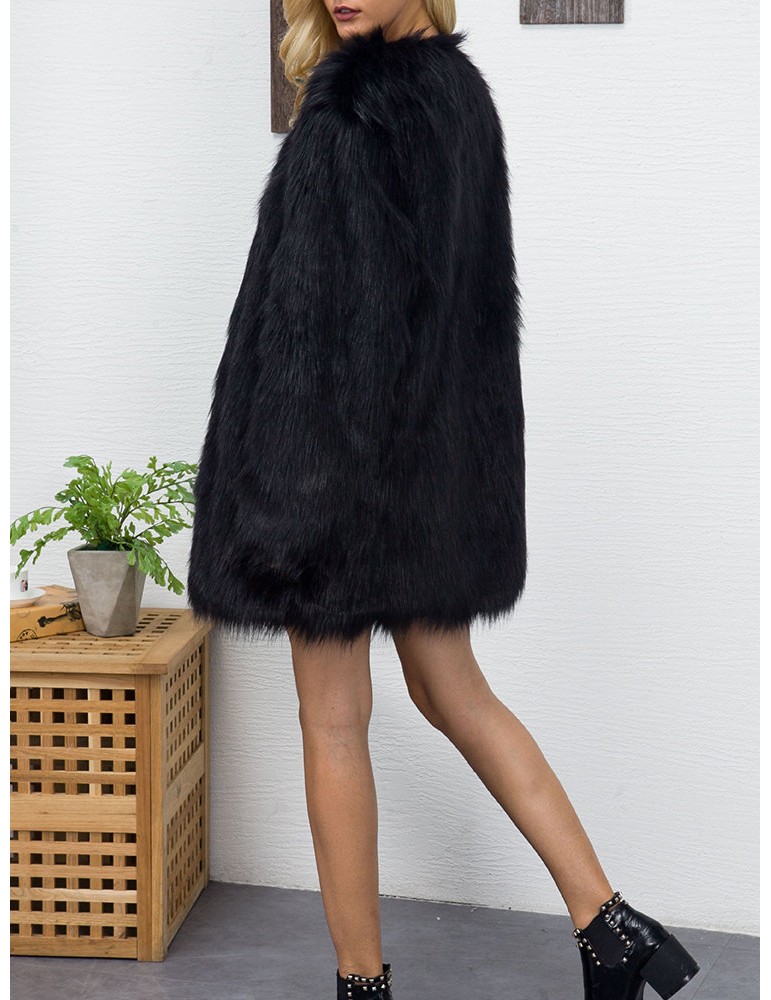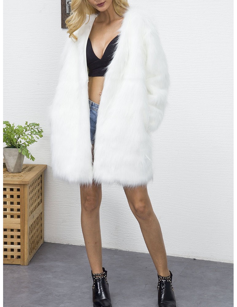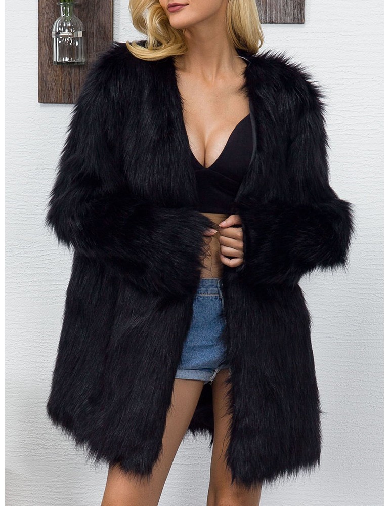 Elegant Faux Fur Solid Color V Neck Long Coat