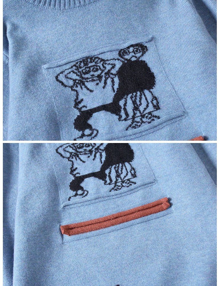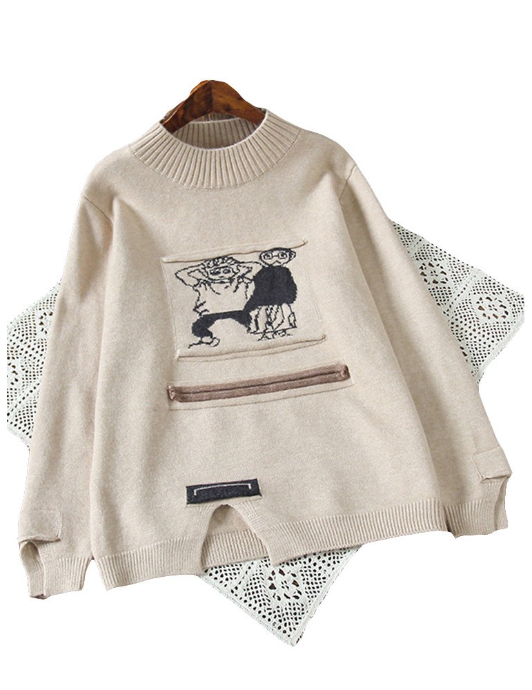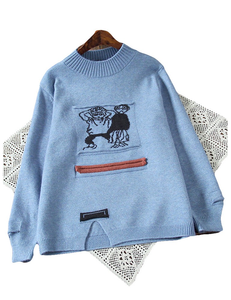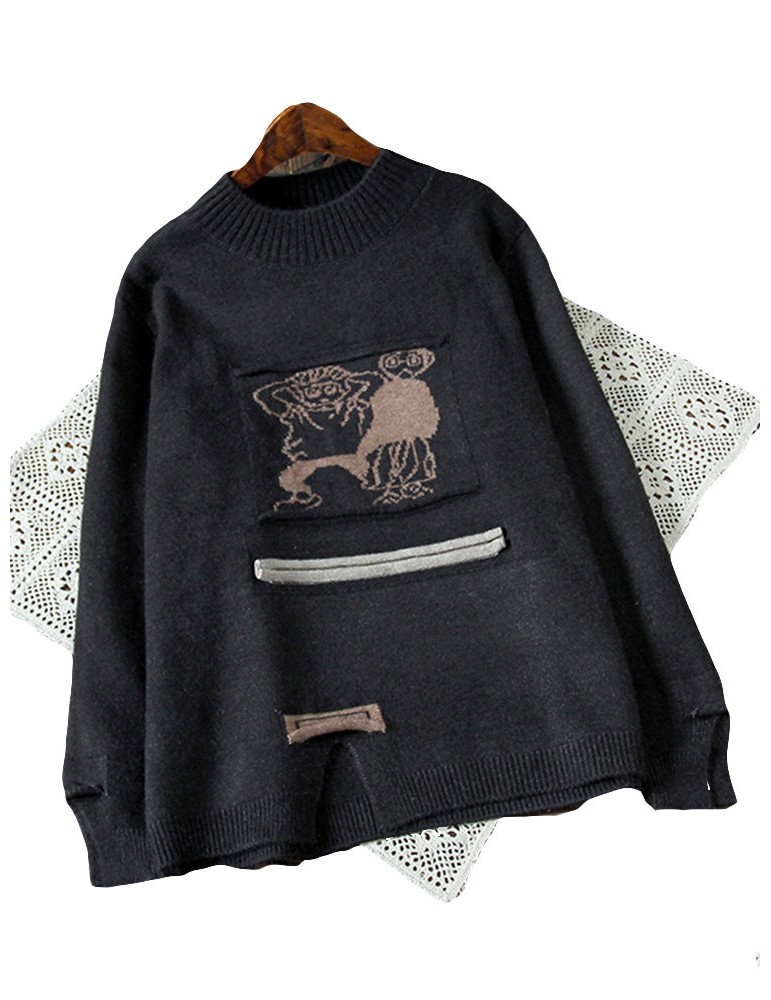 Women Cute Cartoon Print Split Hem Crew Neck Sweater