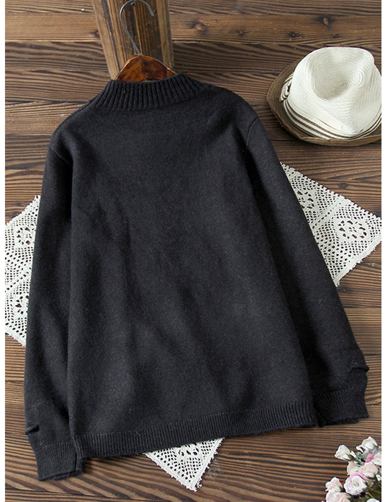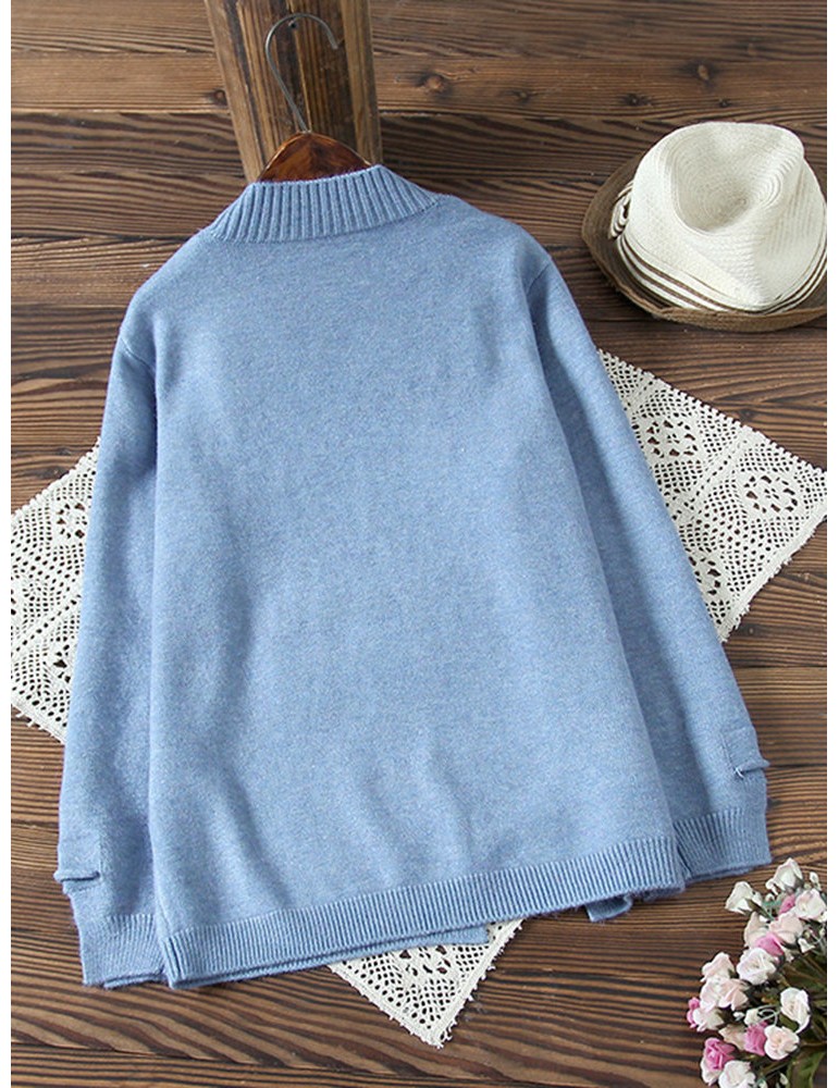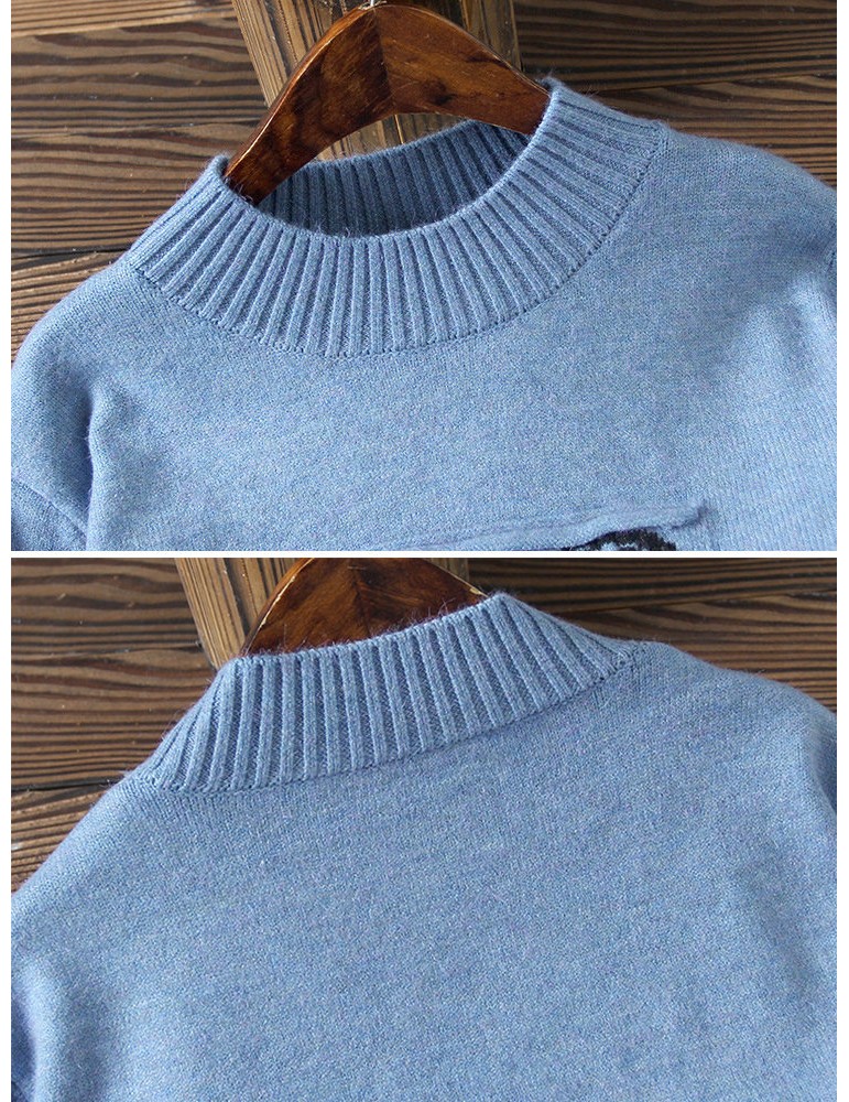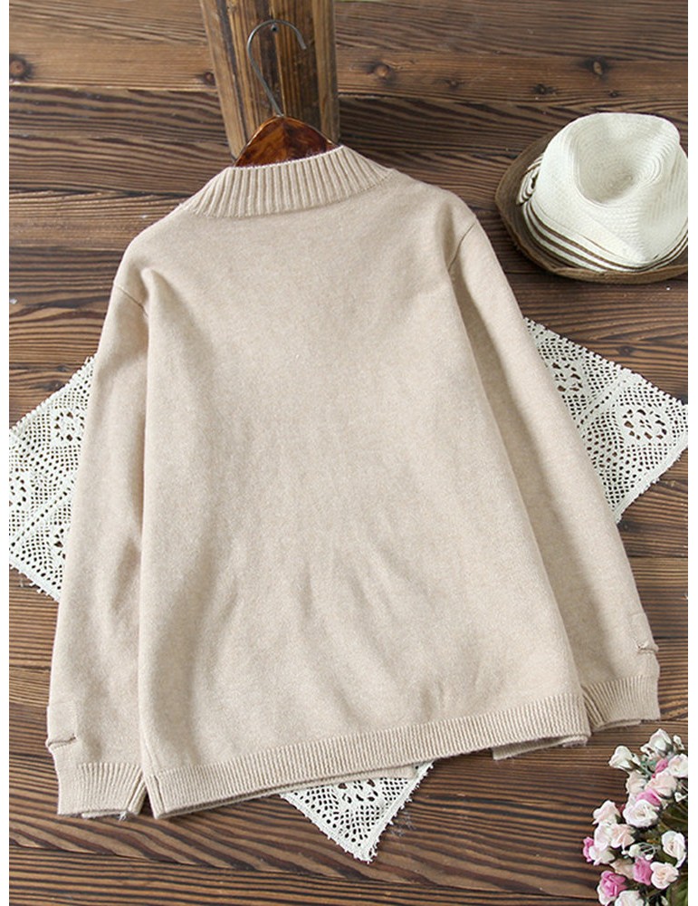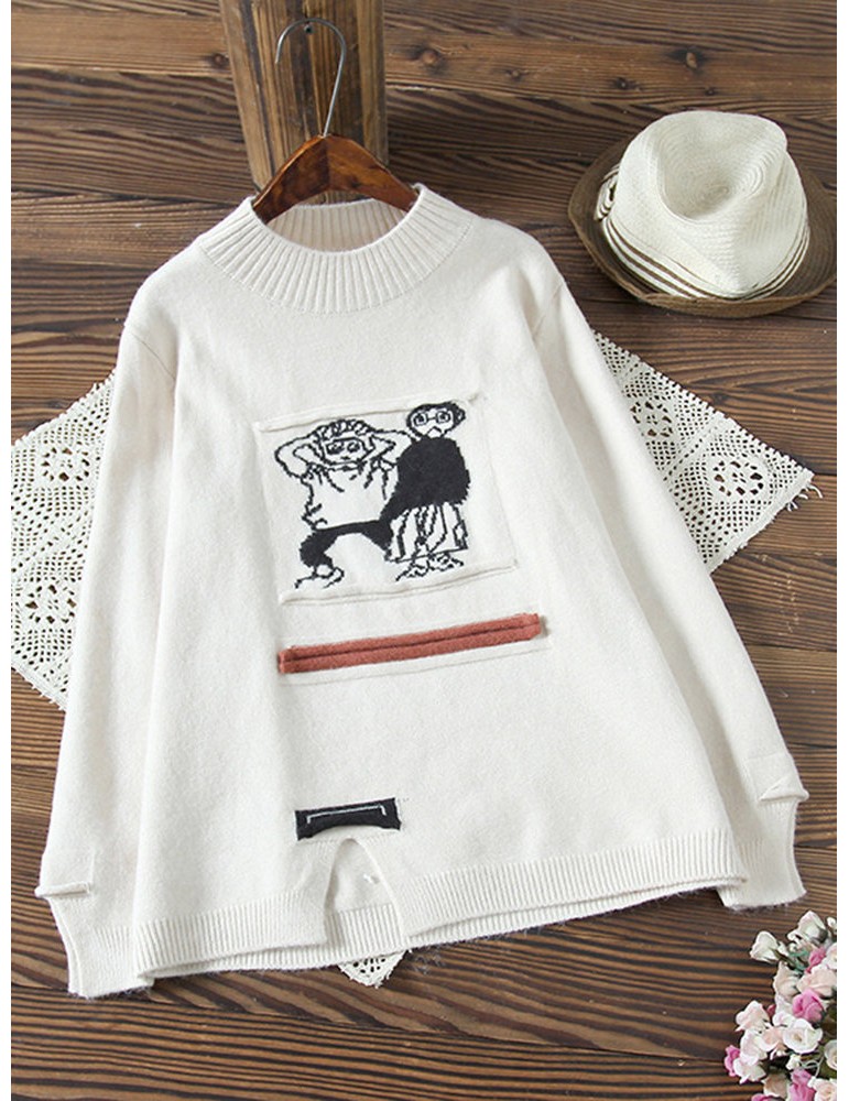 Women Cute Cartoon Print Split Hem Crew Neck Sweater