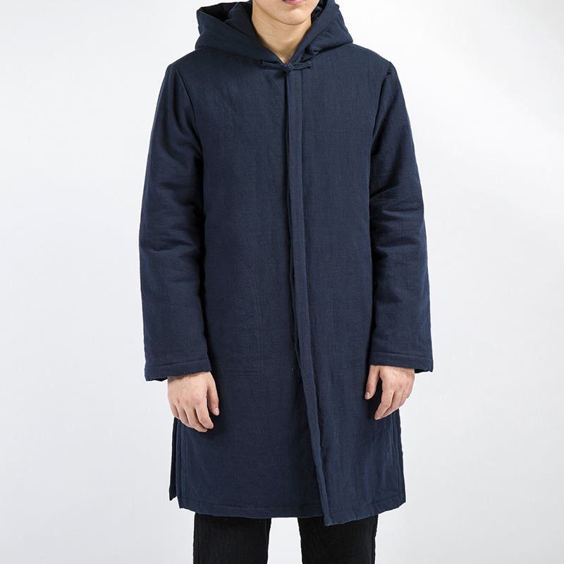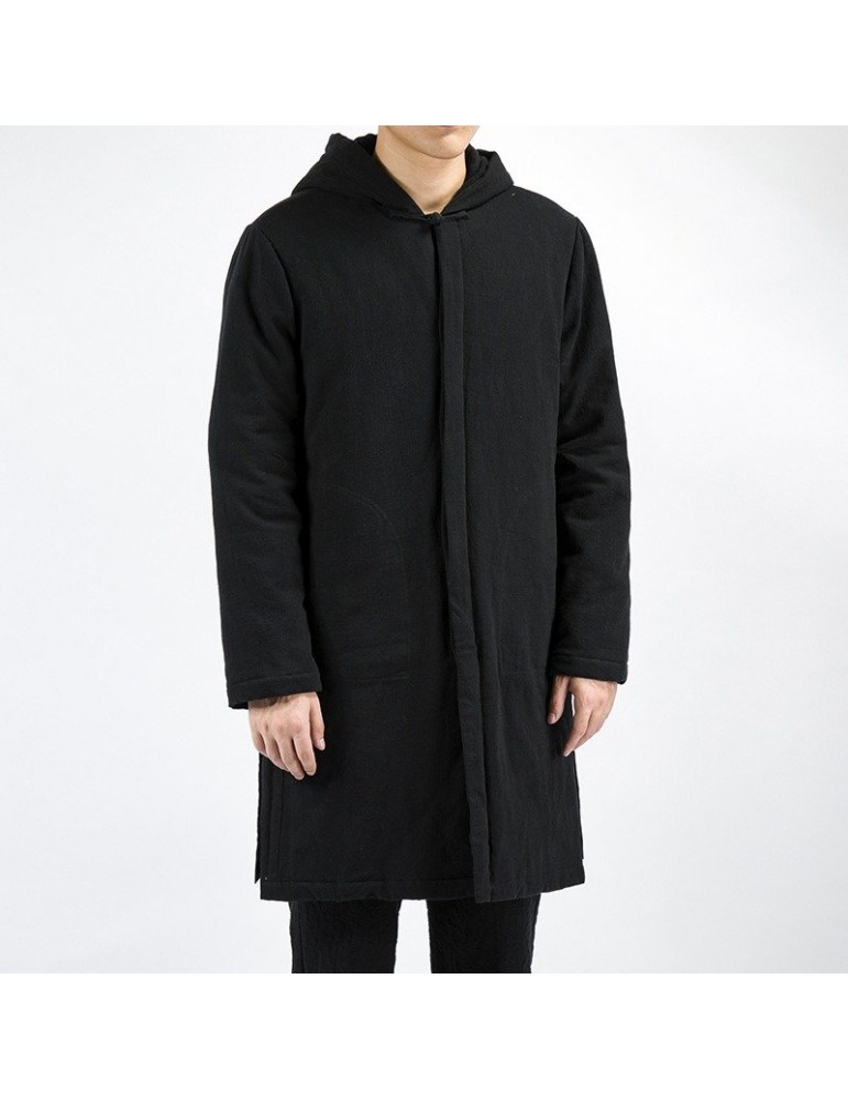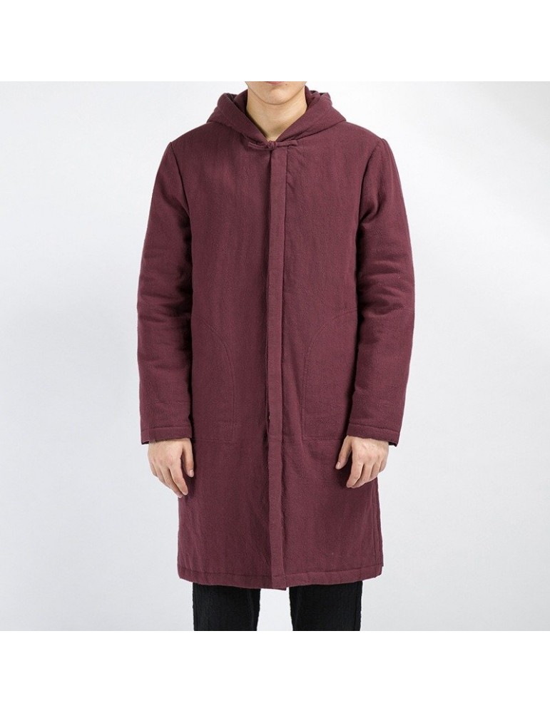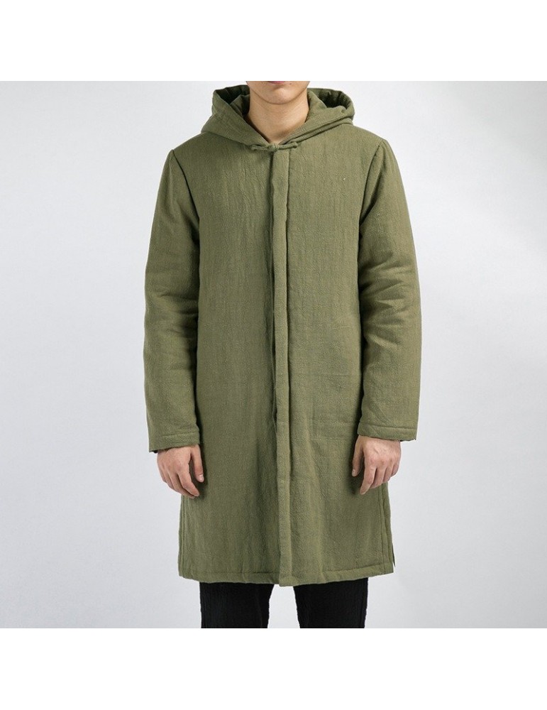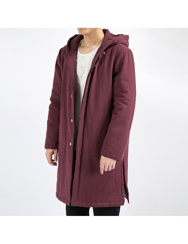 Mens National Cotton Linen Hooded Collar Solid Color Long Sleeve Thicken Coat Casual Midlong Jacket