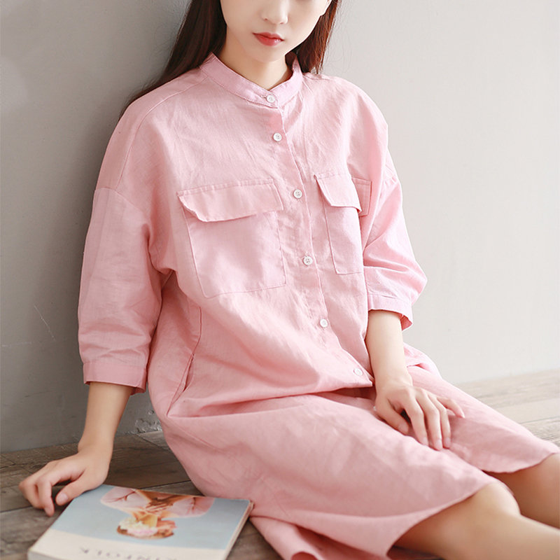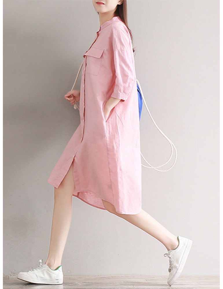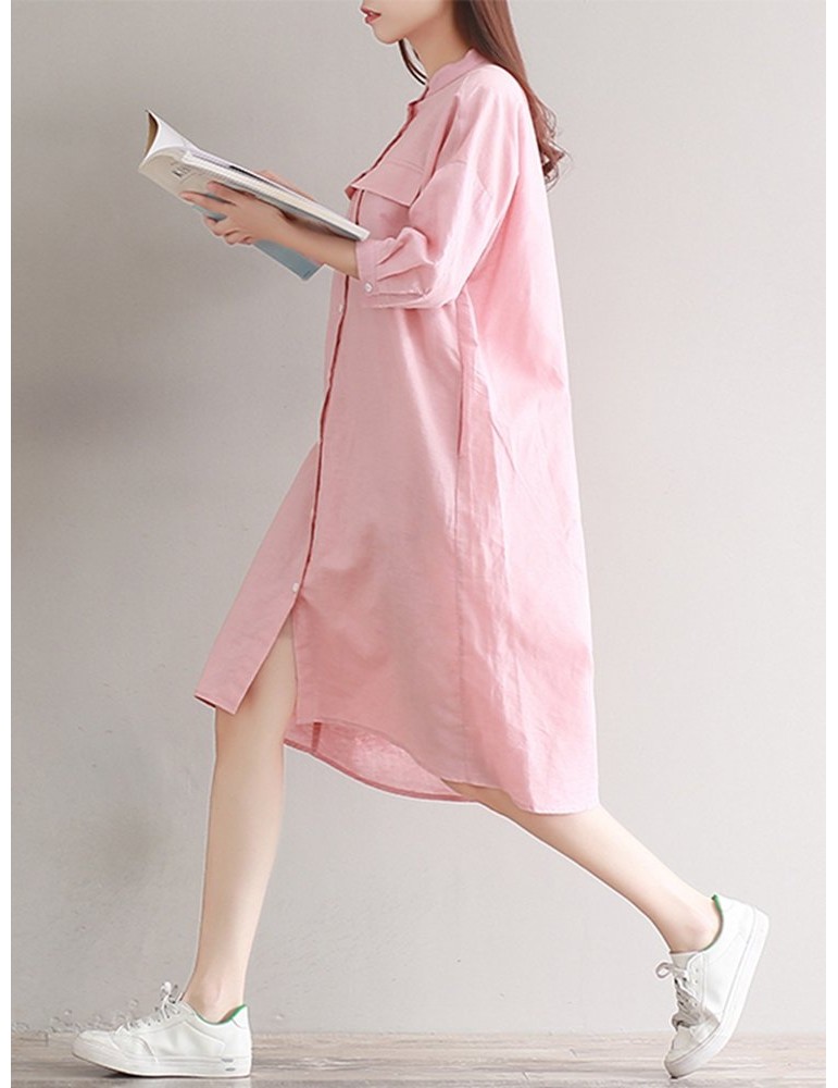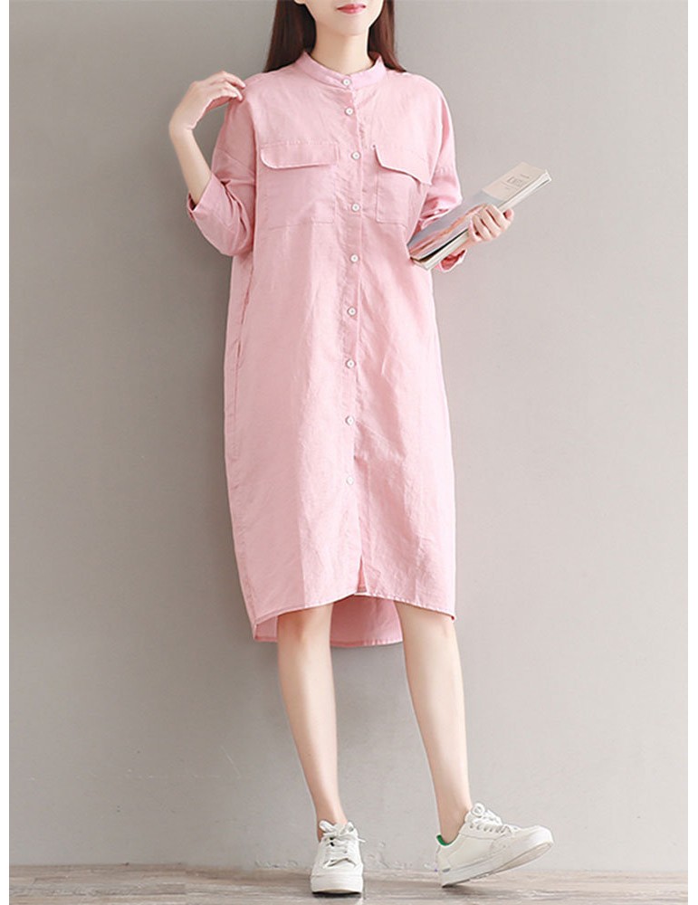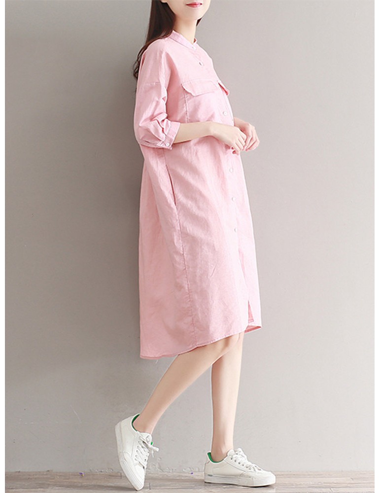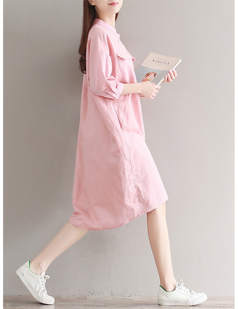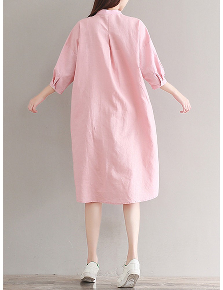 Casual Solid Color Loose Stand Collar 3/4 Sleeve Shirt Dress For Women